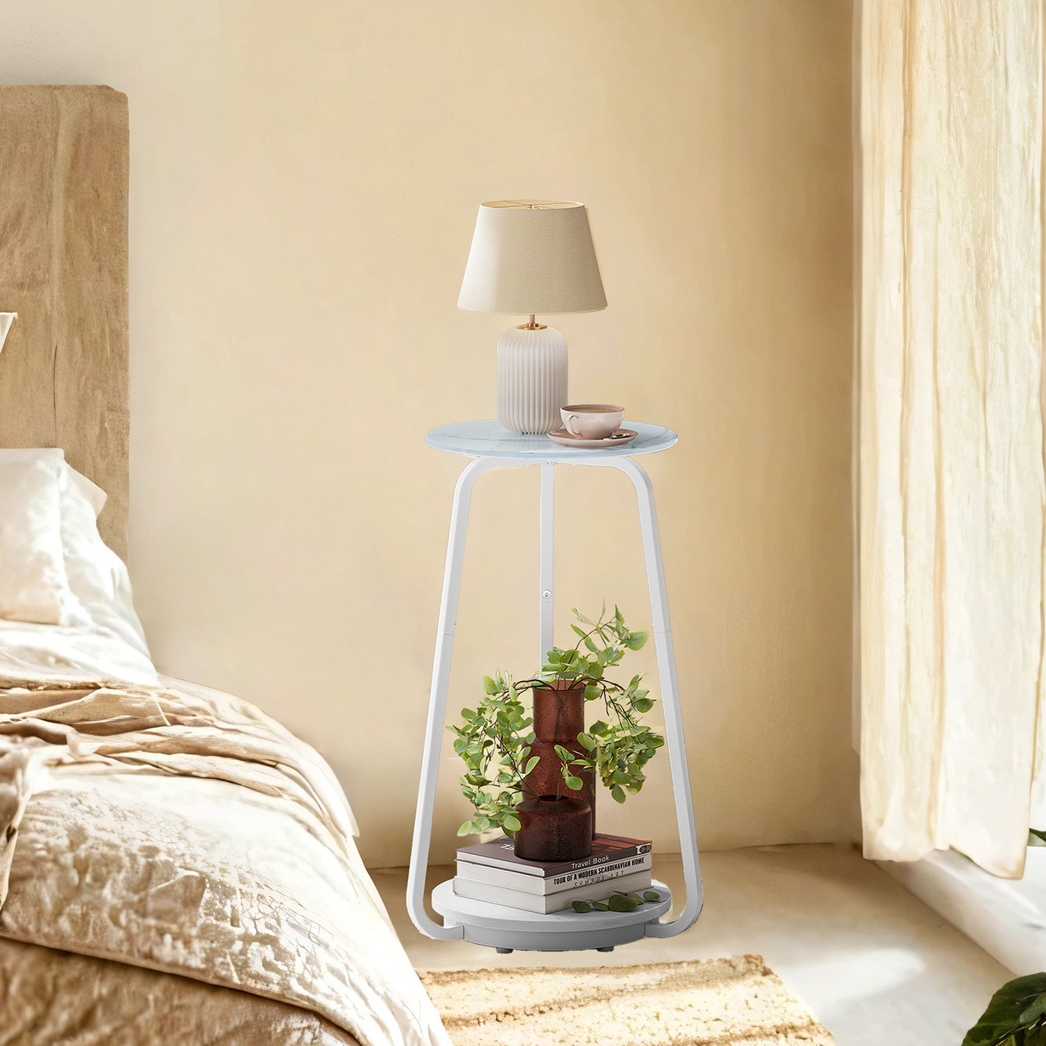 VASAGLE Side Table, Round, Nightstand with 2 Levels, Coffee Table with Glass Top and Chipboard Shelf, for Living Room, Bedroom, Small Rooms, Modern, Marble White LET287W59