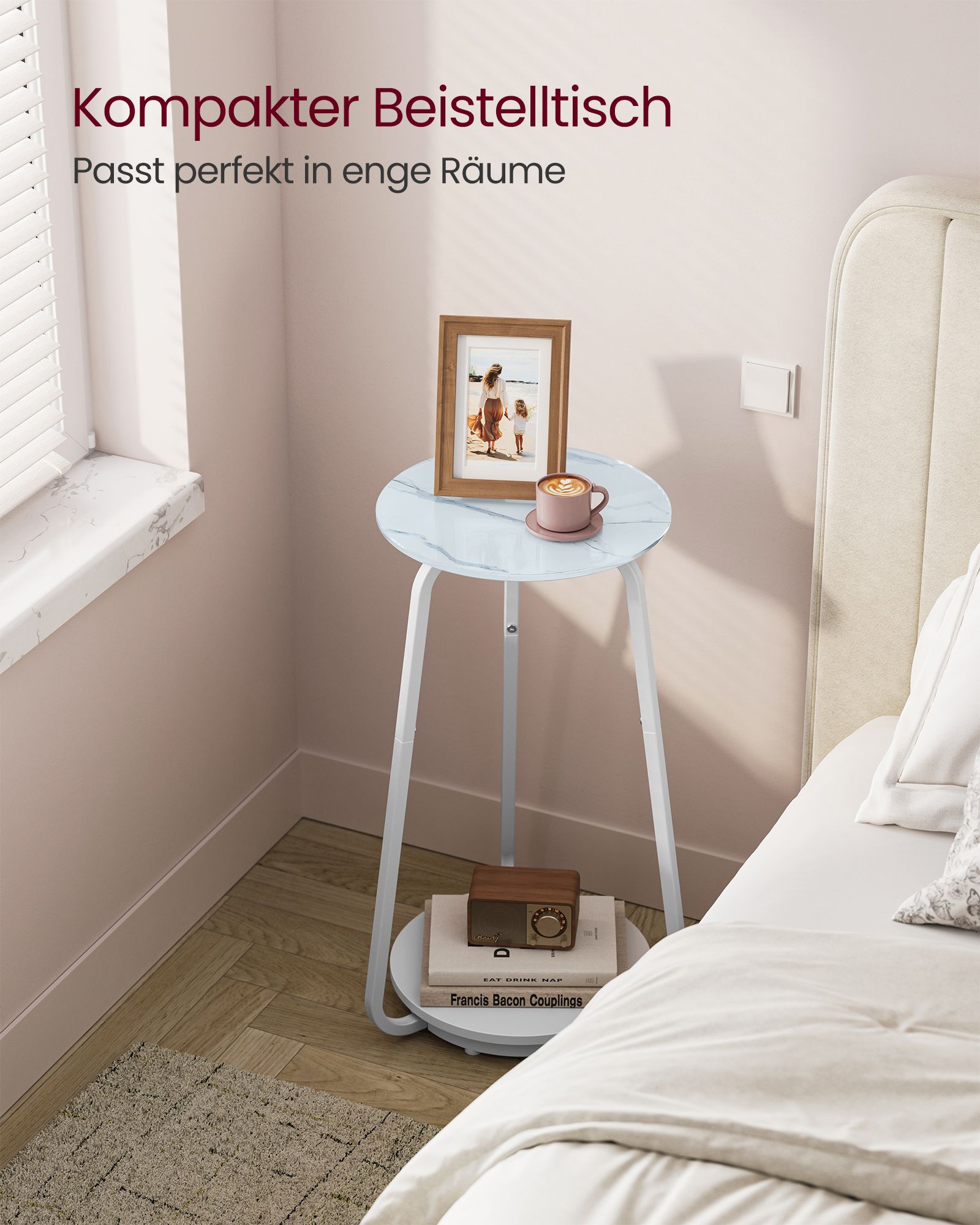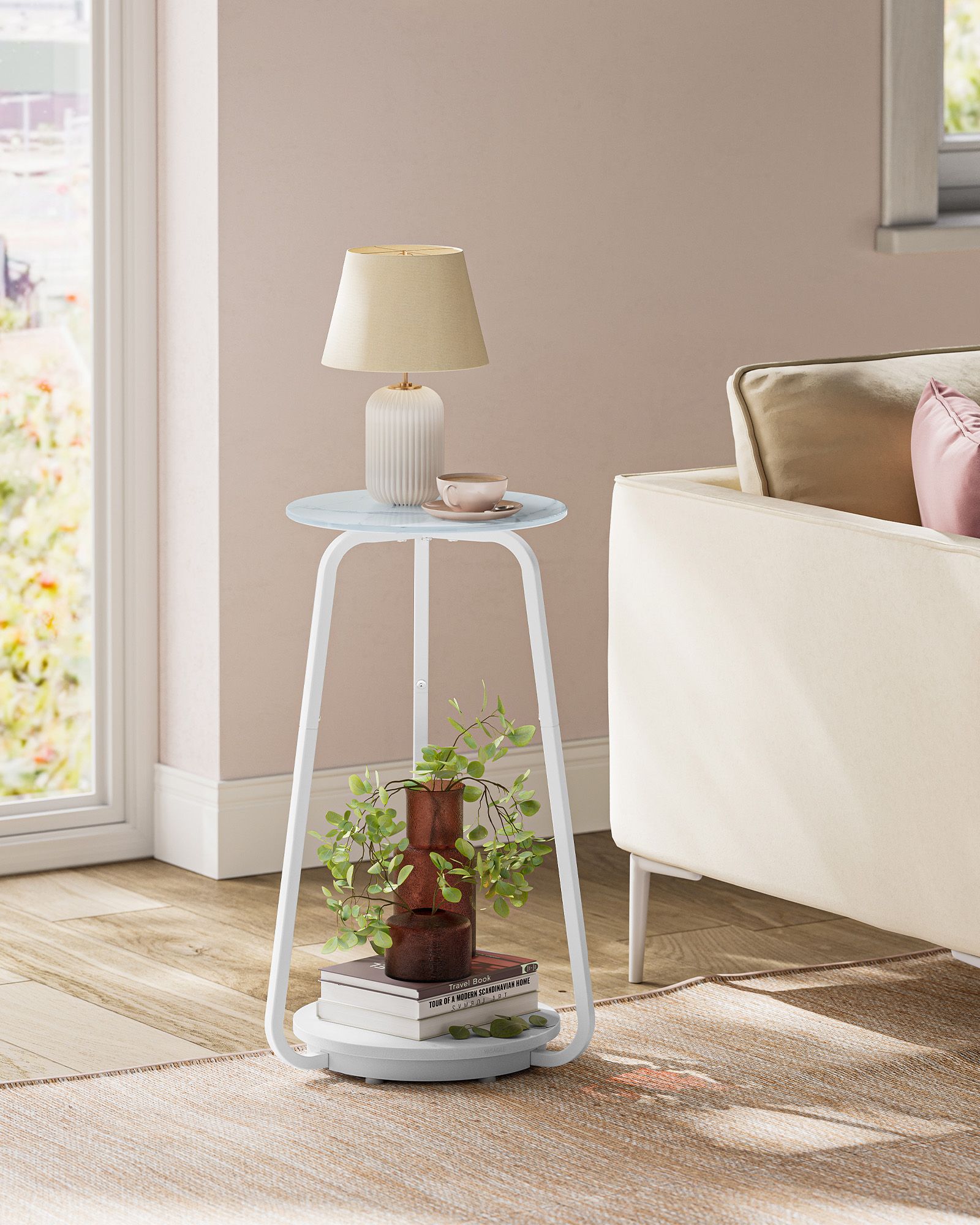 VASAGLE Side table, round, bedside table with 2 levels, coffee table with glass top and chipboard shelf, for living room, bedroom, small rooms, modern, marble white LET287W59