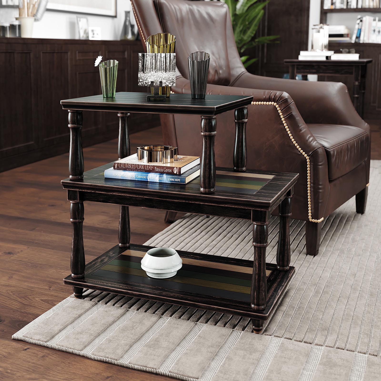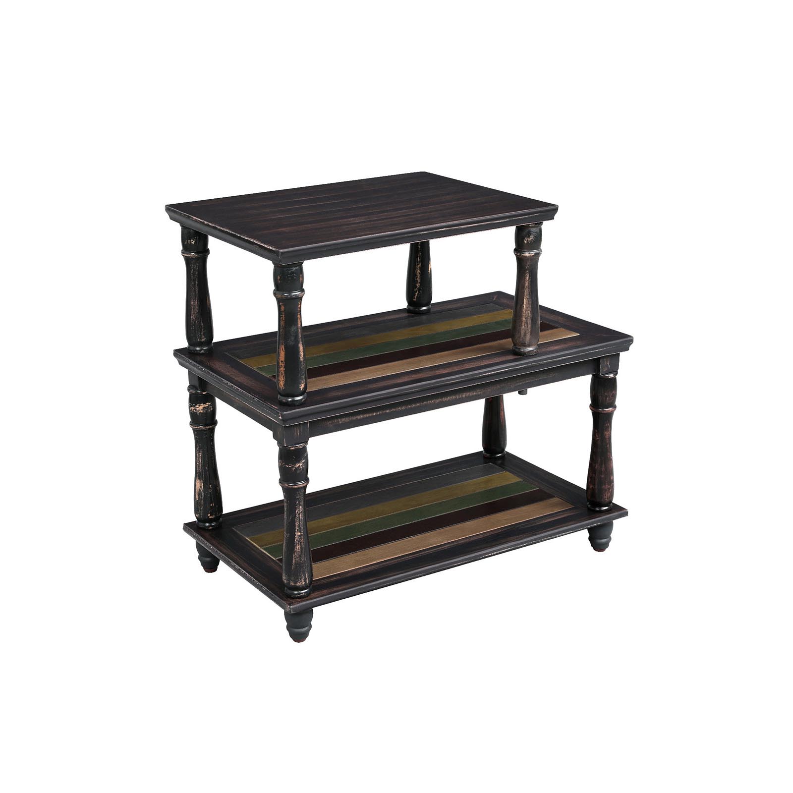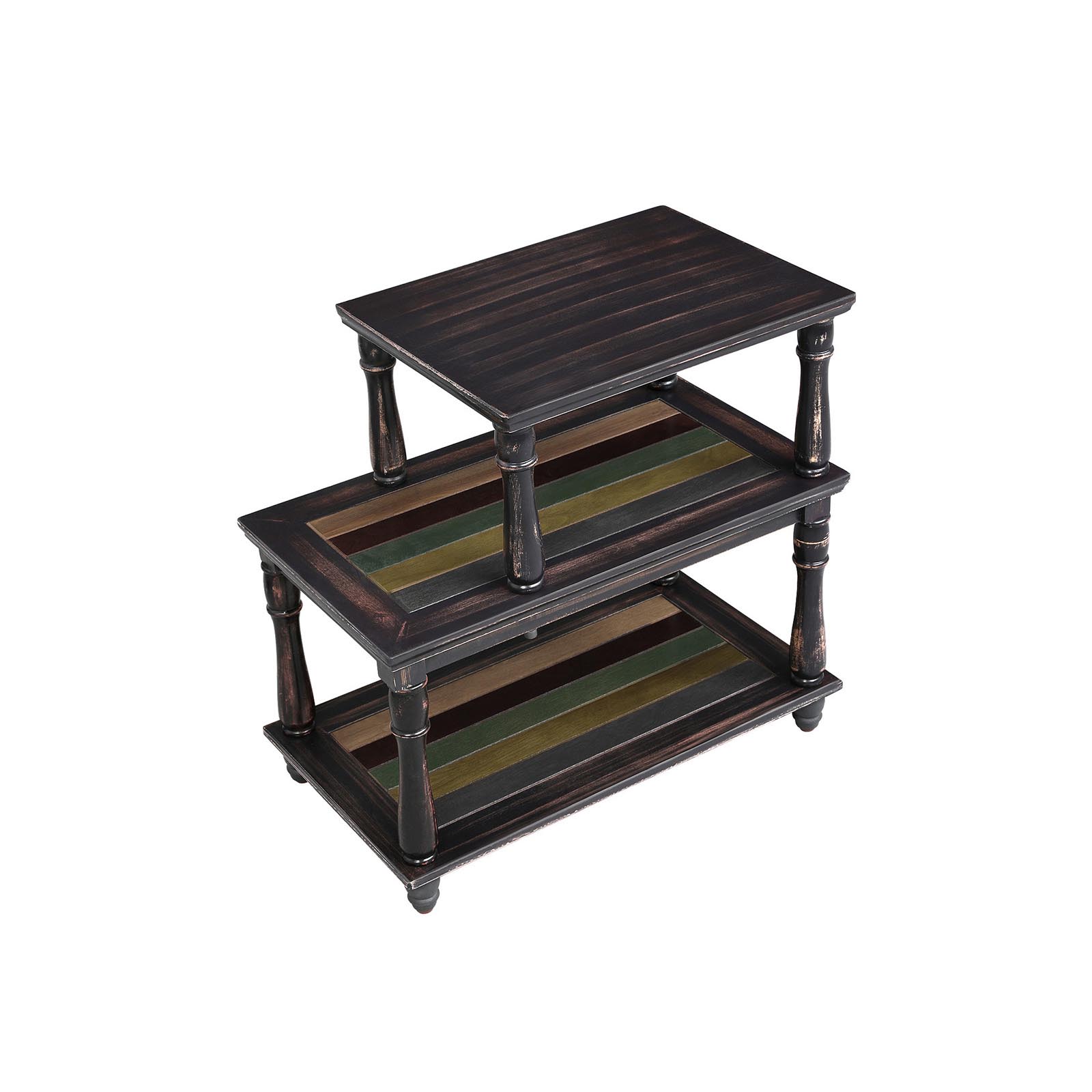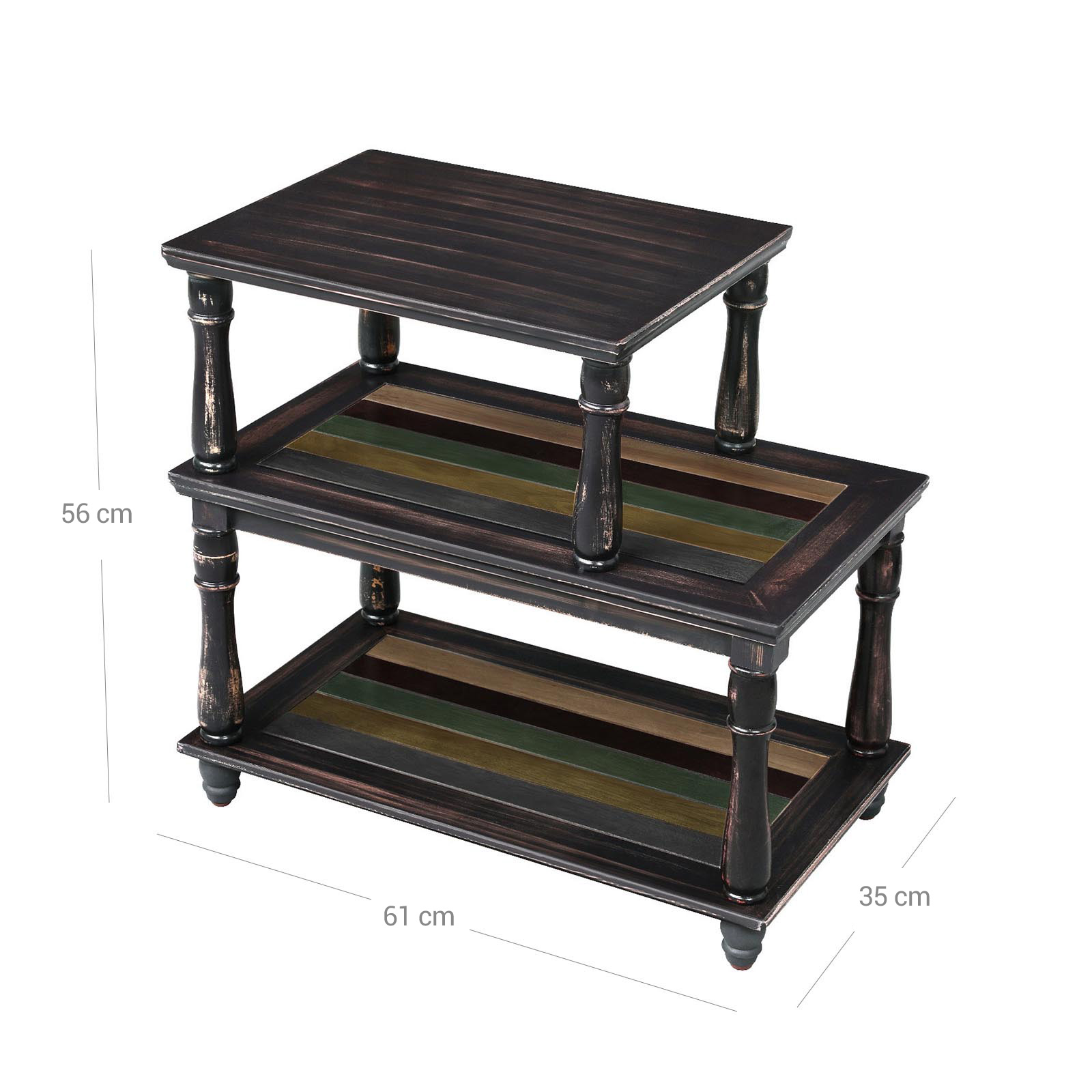 Upgrade your home Get this stylish 3-tier side table and fill your home with life. Where you place it is entirely up to you—put it next to the sofa in the living room, next to your desk in the office, or anywhere else you need practical and stylish storage. The different-sized tiers allow you to place a variety of items on this table. The key to success lies in the details The colored shelf and sturdy solid wood legs make this sofa table stand out from the crowd of boring tables. It also features water-based varnish, a unique design, and easy assembly. Don’t miss out on this high-quality yet affordable side table. Product details: – Color: Dark brown/country style, with colorful stripes – Material: Medium-density fiberboard (MDF), birch veneer, Schima Superba (legs) – Dimensions: 61 x 35 x 56 cm (L x W x H) – Weight: 8.95 kg – Max. load capacity: 45 kg Scope of delivery: – 1 x side table – 1 x instructions (DE, EN, FR, ES, IT) VASAGLE Notes: – Please do not sit or stand on the product. – Do not store the product outdoors for long periods of time. – The product must not come into contact with sharp objects or aggressive chemical substances to avoid damage.