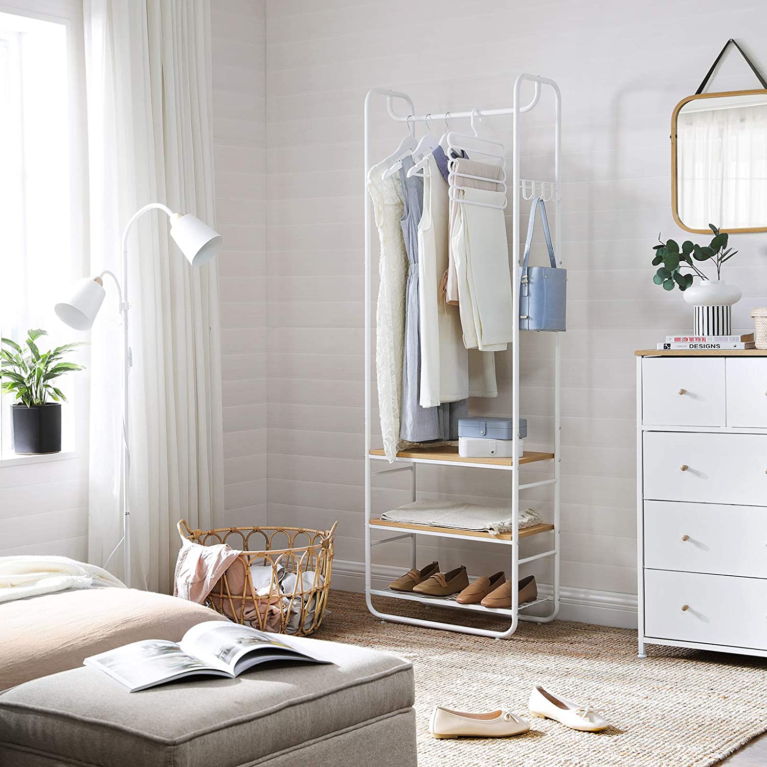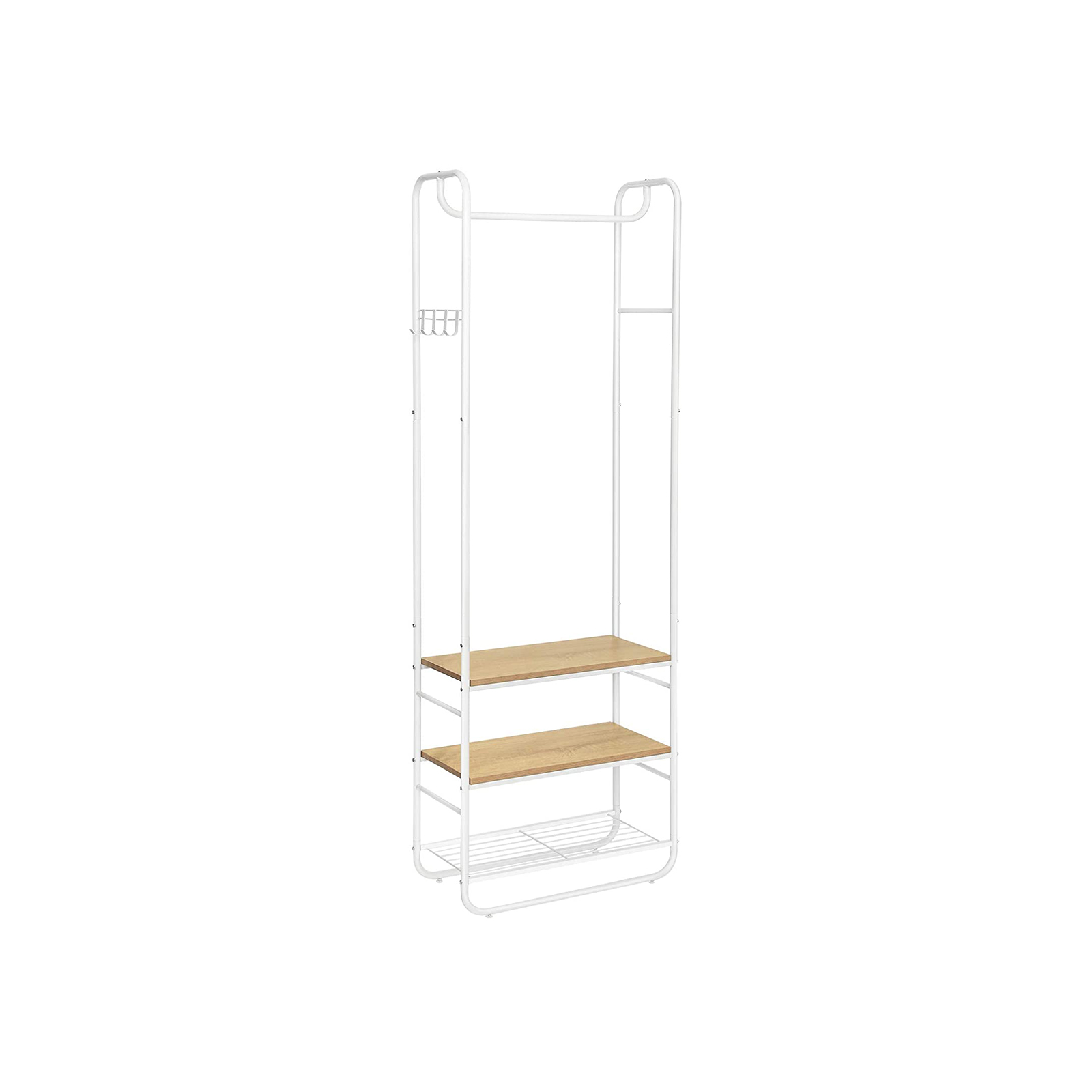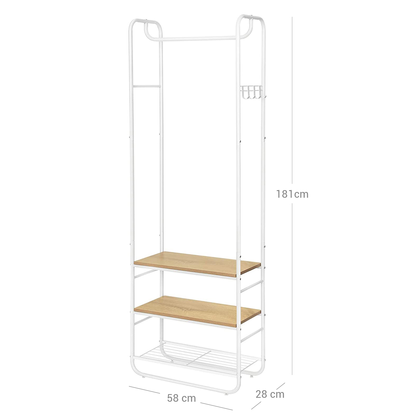 Product details: – Color: Oak-cream white – Material: Chipboard, steel – Size: 58 x 28 x 181 cm (L x W x H) – Weight: 5.5 kg – Max. static load capacity of wooden shelves: 5 kg – Max. static load capacity of wire shelf: 3 kg – Max. static load capacity per hook: 2 kg – Max. static load capacity of clothes rail: 10 kg Scope of delivery:- 1 x coat rack – 1 x accessory pack – 1 x anti-tip device – 1 x instructions (DE, EN, ES, FR, IT) VASAGLE notes: – For safety reasons, children are not allowed to climb on or play with the product. – The maximum static load capacity of the product is 31 kg. Please do not exceed this maximum weight. – Please attach this product to the wall using the included anti-tip device to ensure safe use.
