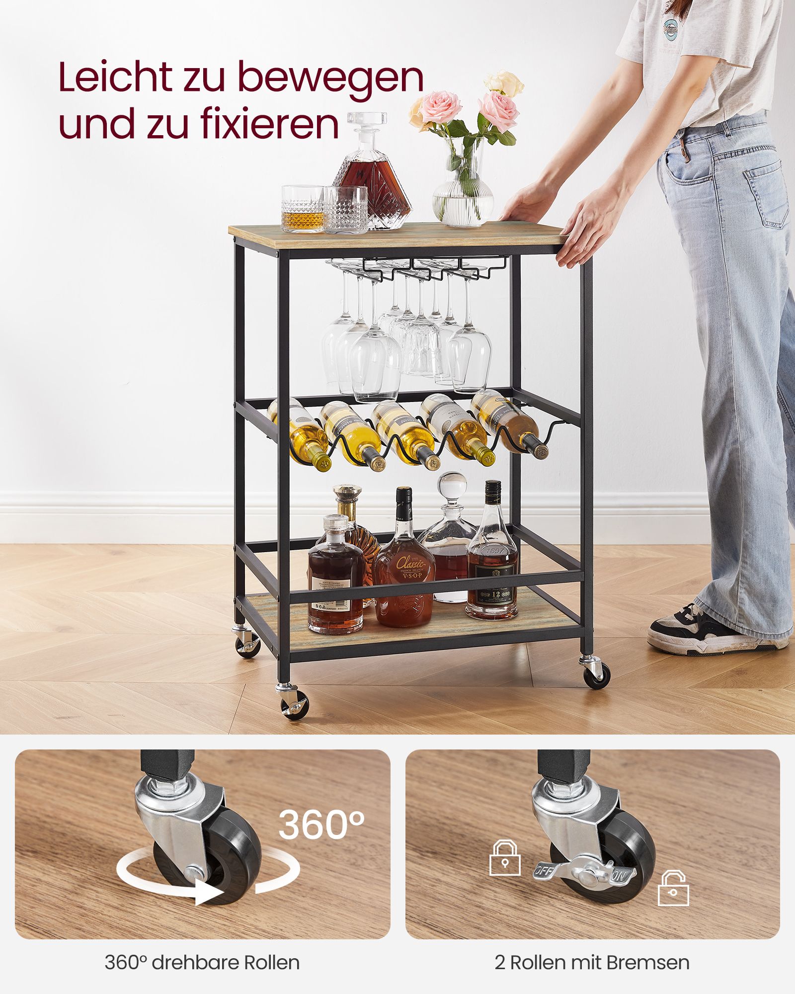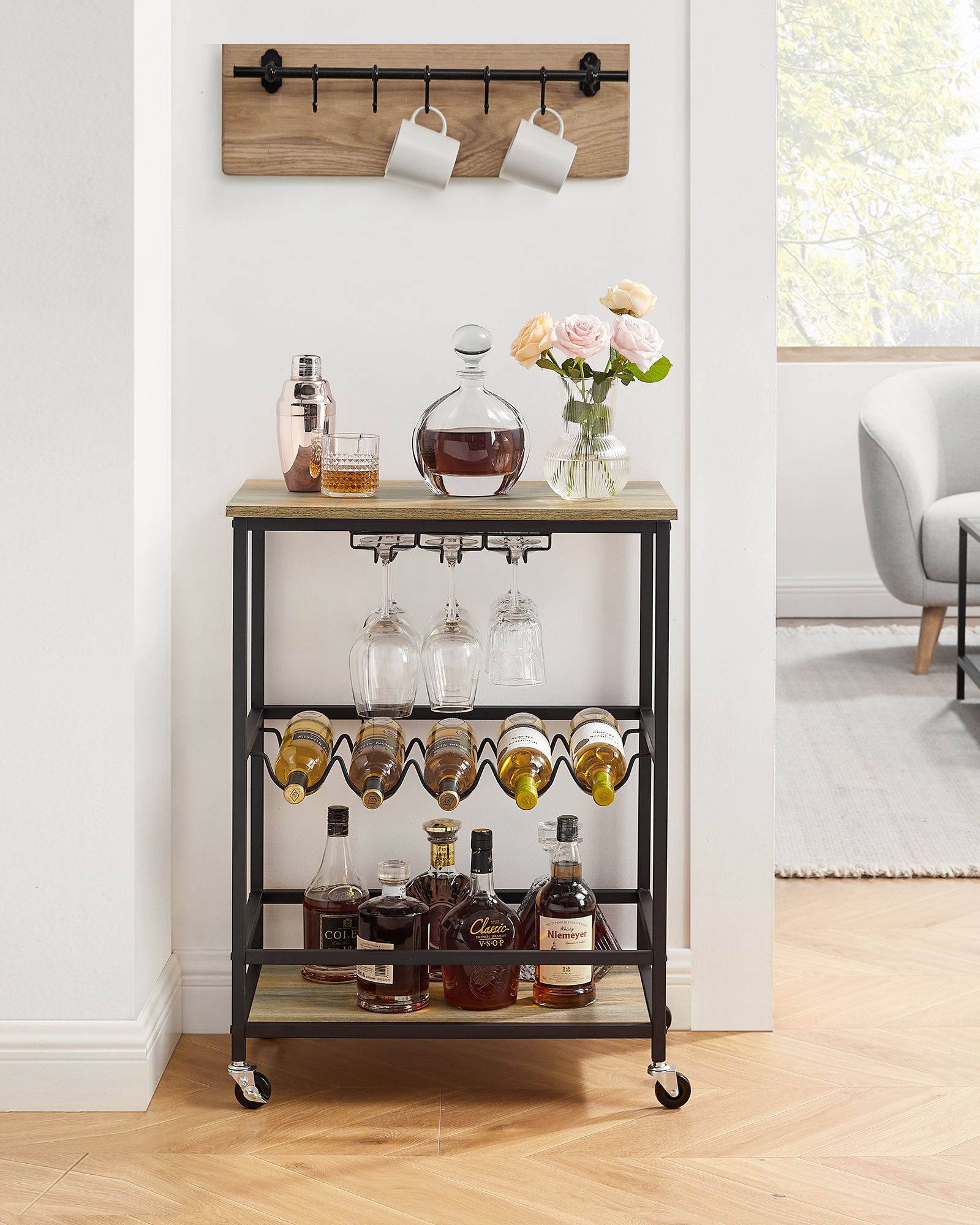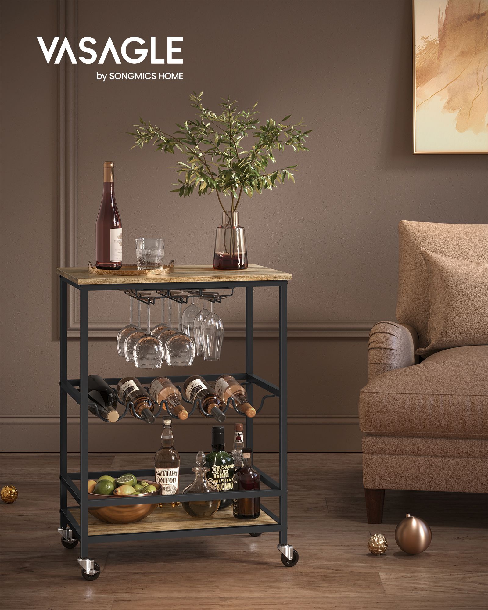 VASAGLE serving trolley, kitchen trolley on casters, with shelves, glass and bottle holders, 60 x 40 x 75 cm, industrial design, vintage brown-black LRC087B01