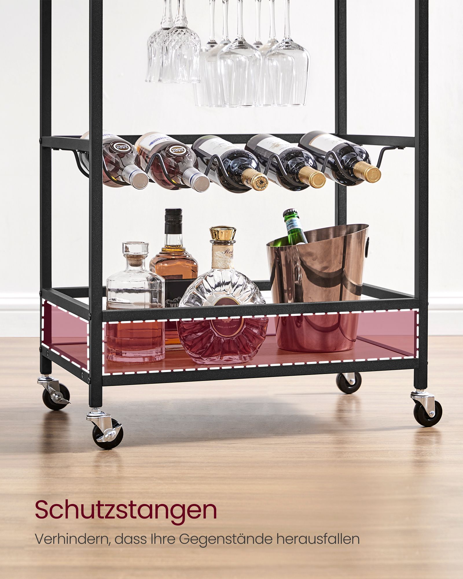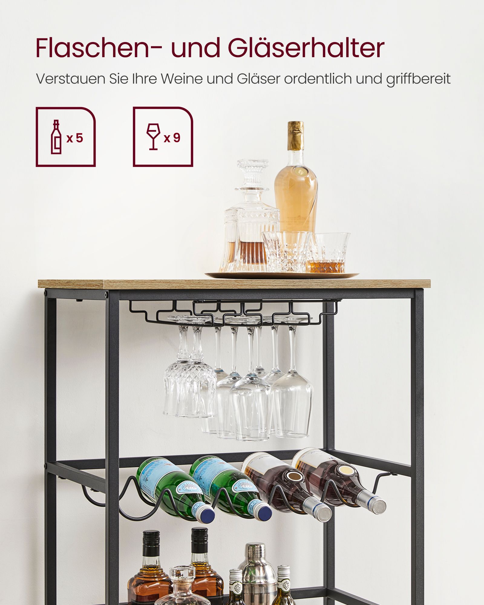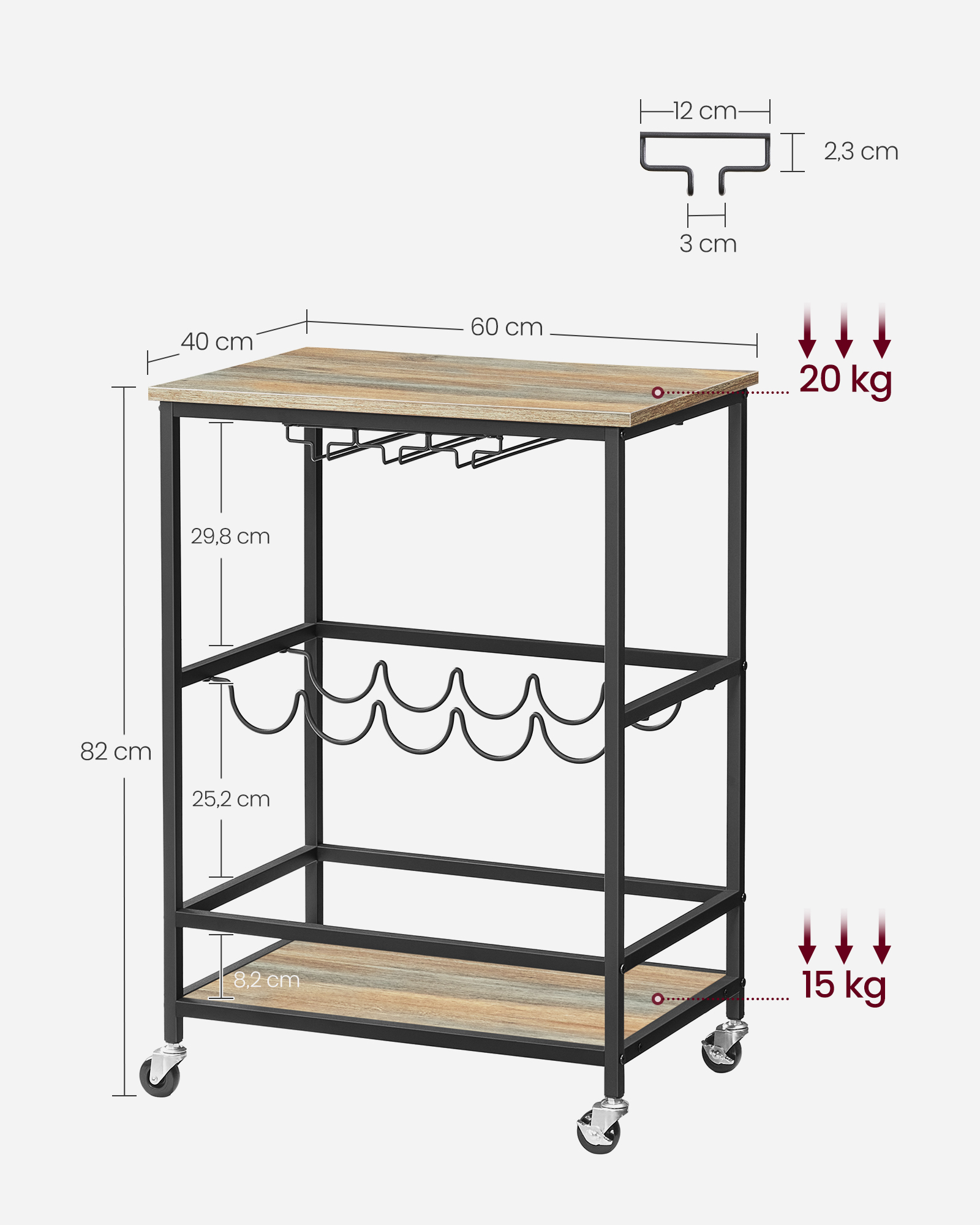 VASAGLE serving trolley, kitchen trolley on casters, with shelves, glass and bottle holders, 60 x 40 x 75 cm, industrial design, vintage brown-black LRC087B01