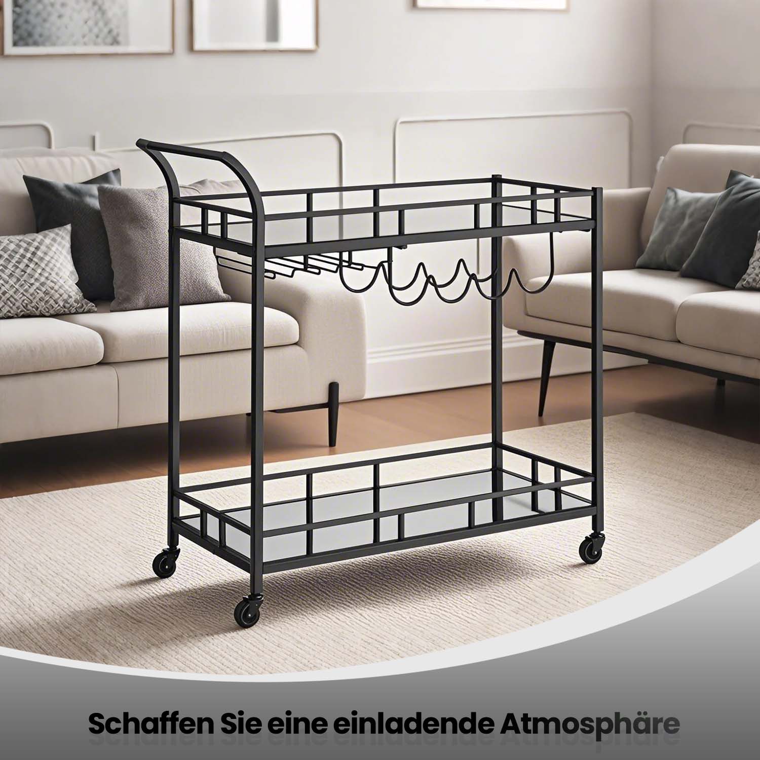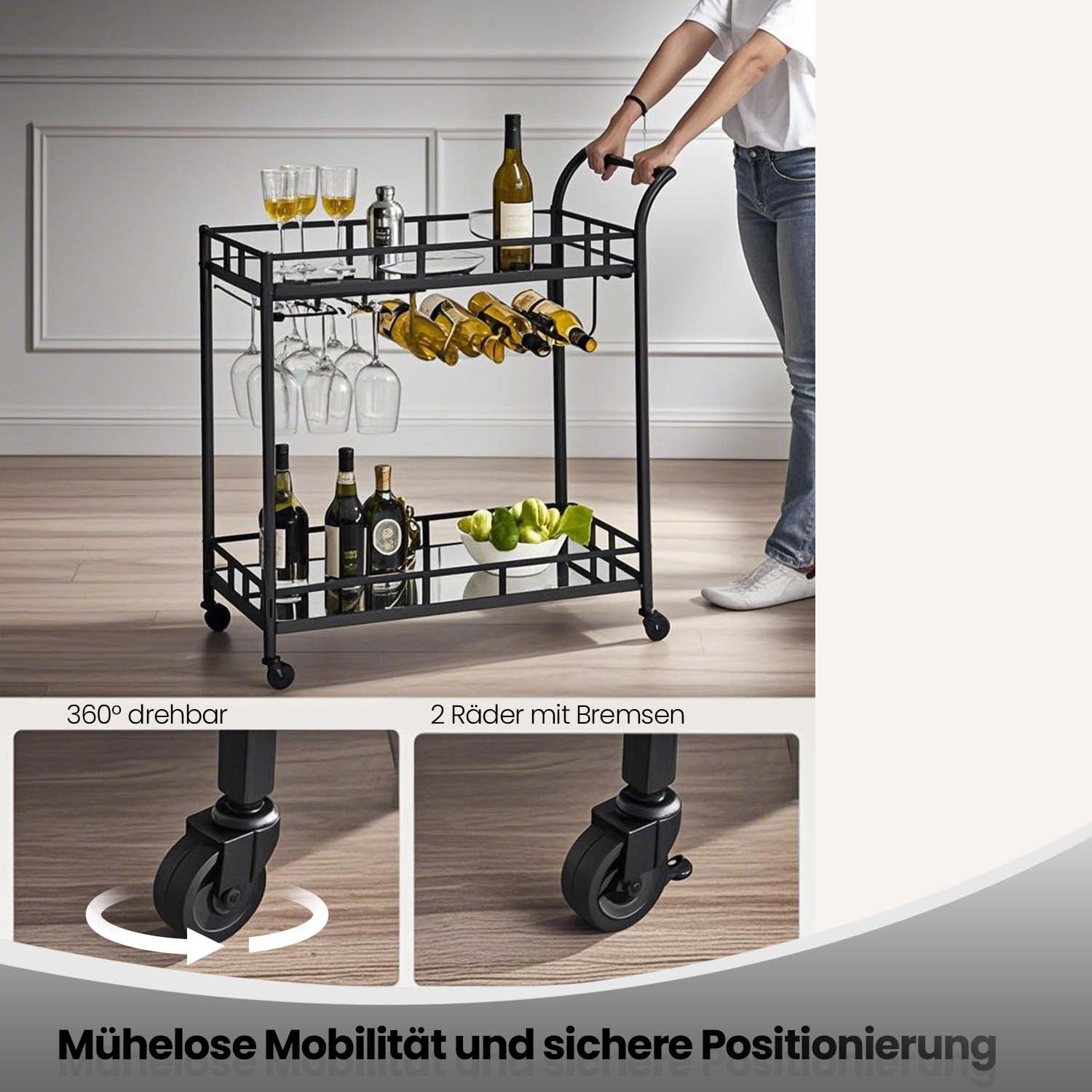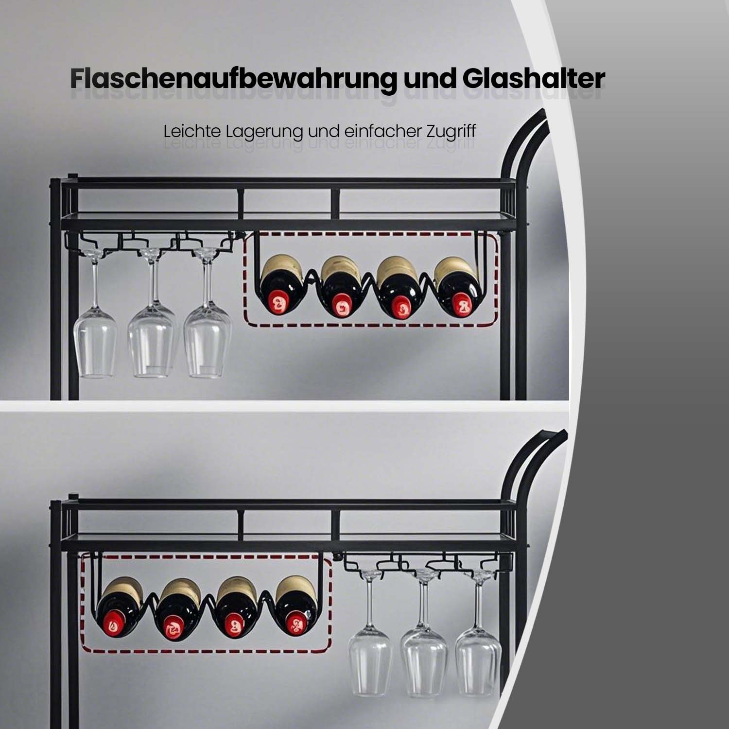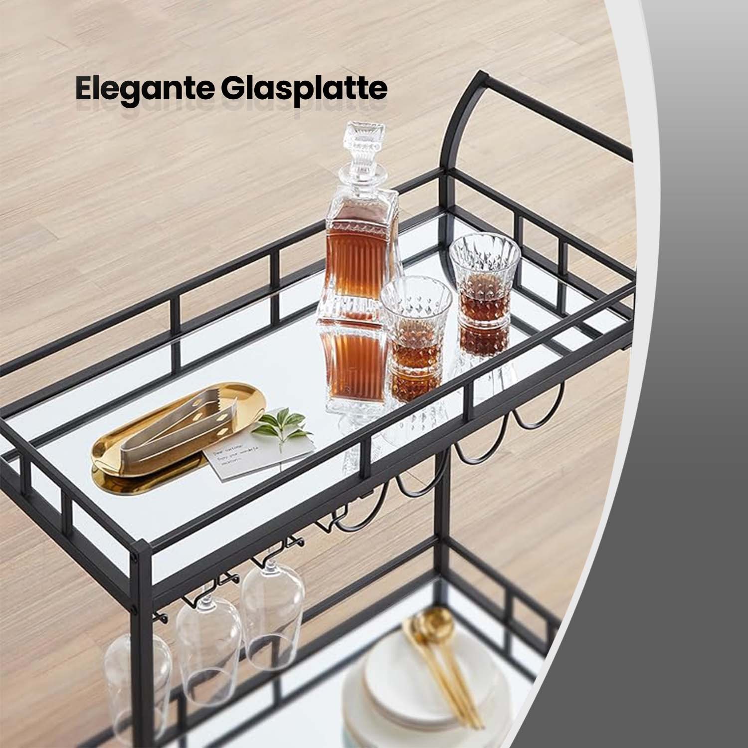 VASAGLE serving trolley, rolling cart, glass holder, 2 mirrored glass shelves, bar cart, wine cart, for kitchen, dining room, bar, gold color LRC090A03