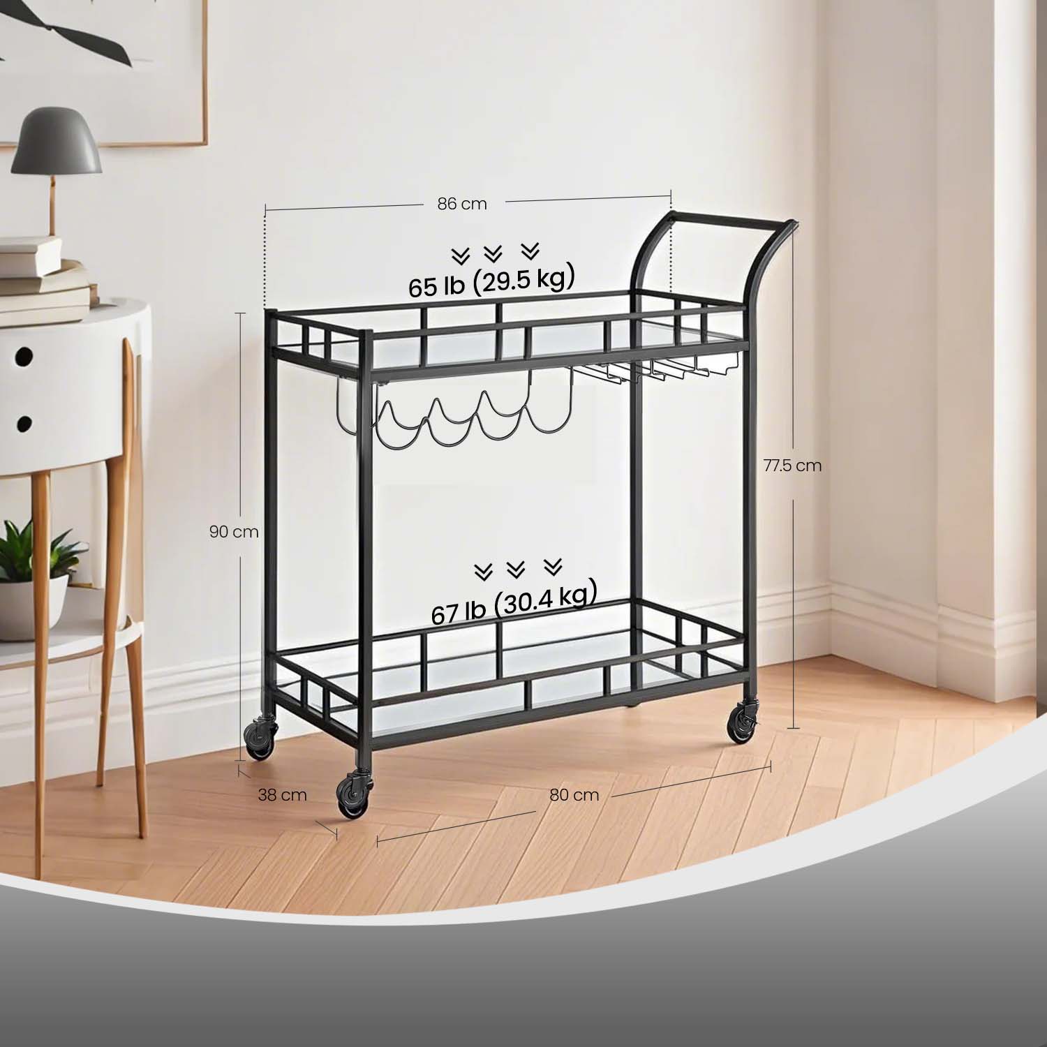 – Max. static load capacity of lower shelf: 30.4 kg
