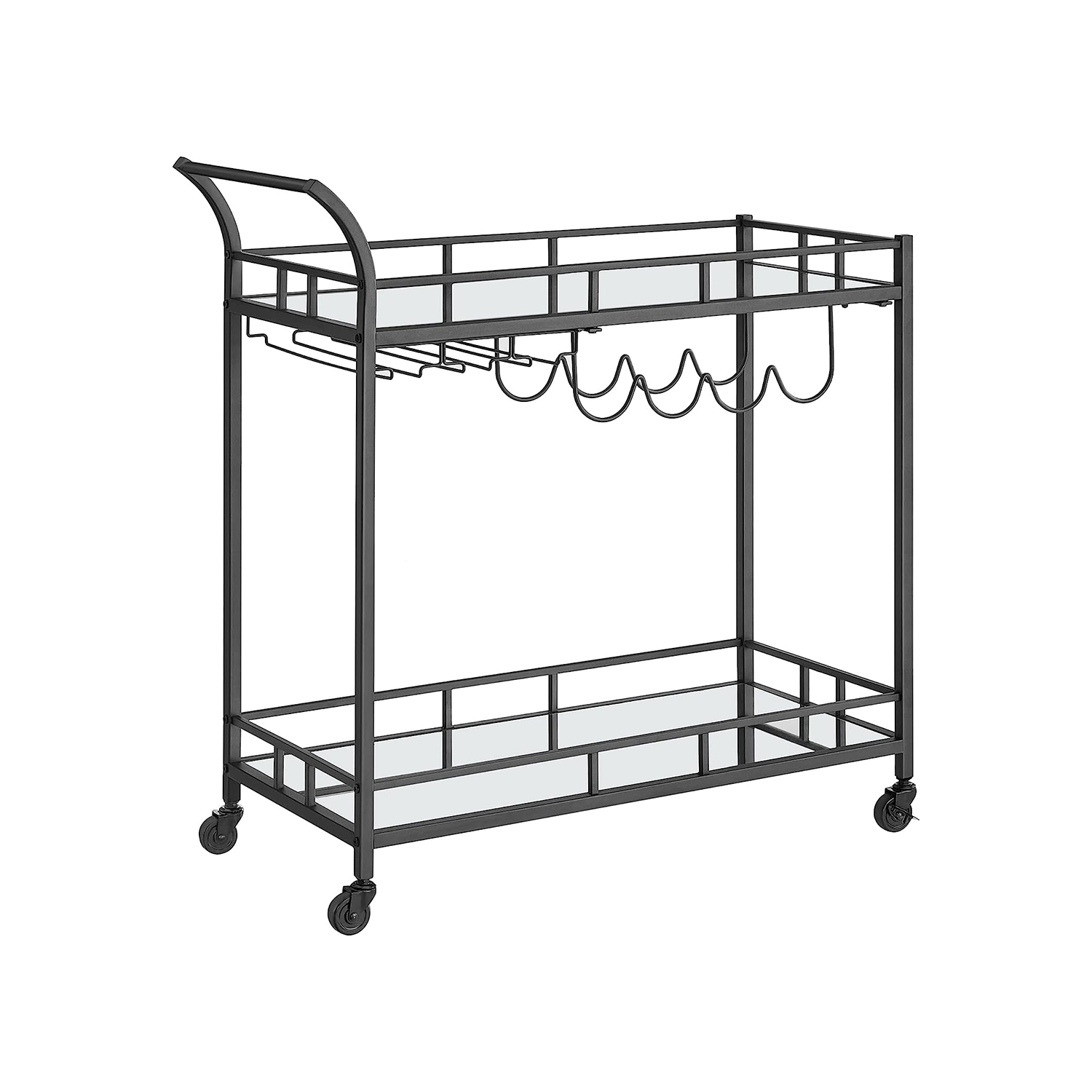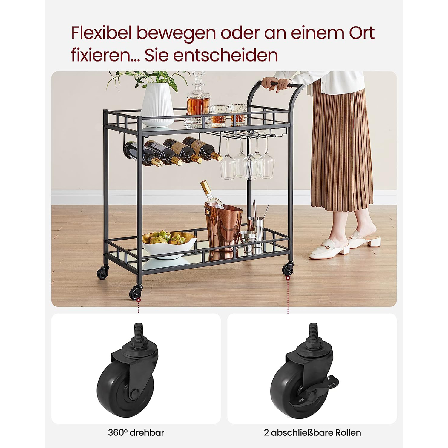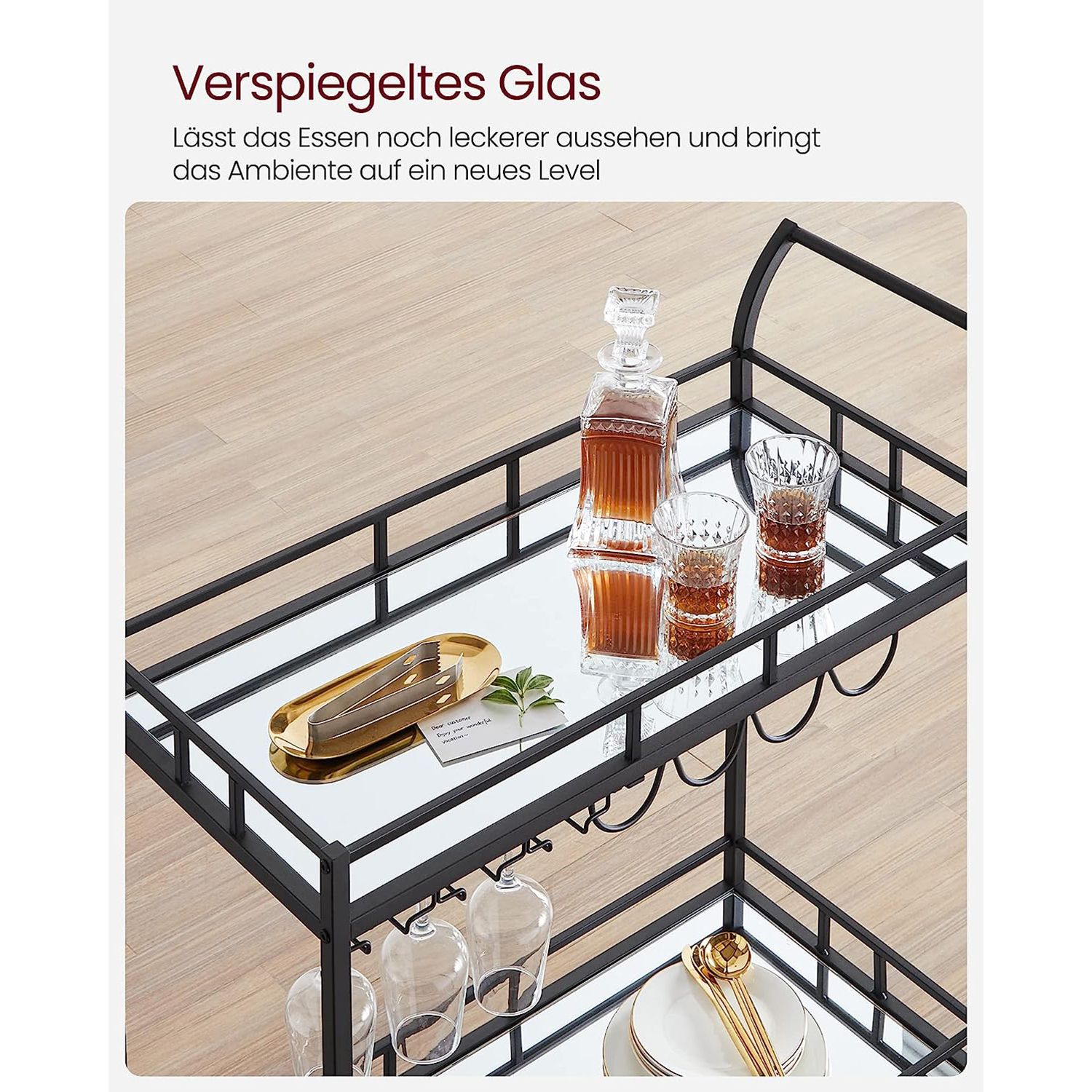 VASAGLE serving trolley, rolling cart, glass holder, 2 mirrored glass shelves, bar cart, wine cart, for kitchen, dining room, bar, gold-colored LRC090A03