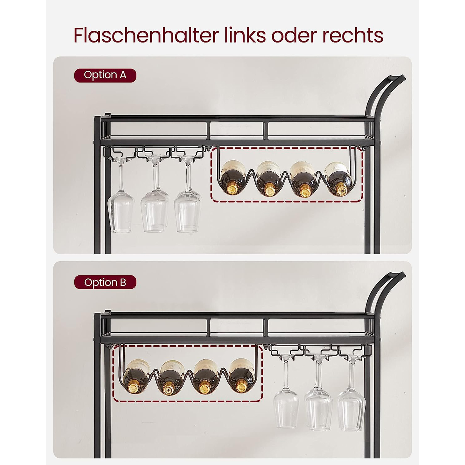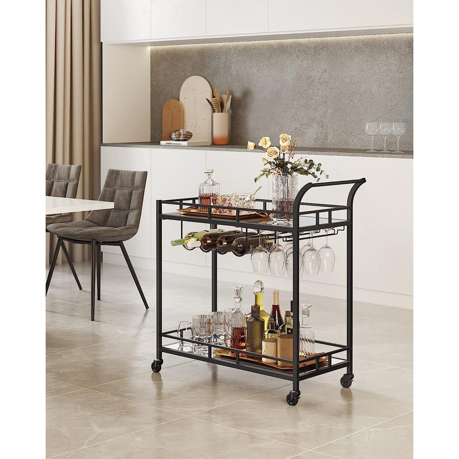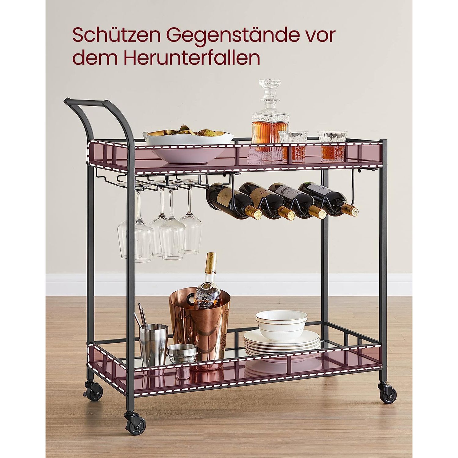 VASAGLE serving trolley, rolling cart, glass holder, 2 mirrored glass shelves, bar cart, wine cart, for kitchen, dining room, bar, gold-colored LRC090A03