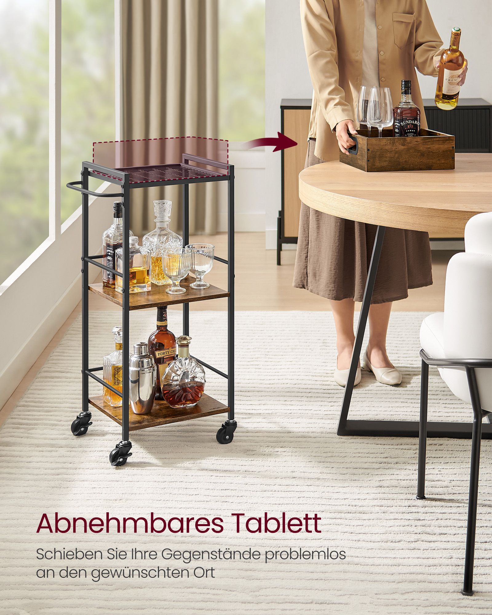 VASAGLE serving trolley with removable tray, lockable kitchen trolley with universal casters, kitchen shelf, 65 x 40 x 86 cm, sturdy metal frame, industrial design, vintage brown-black LRC72X