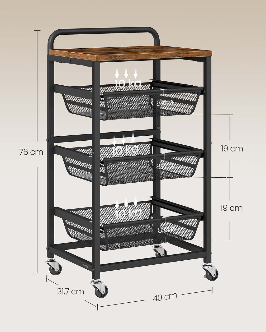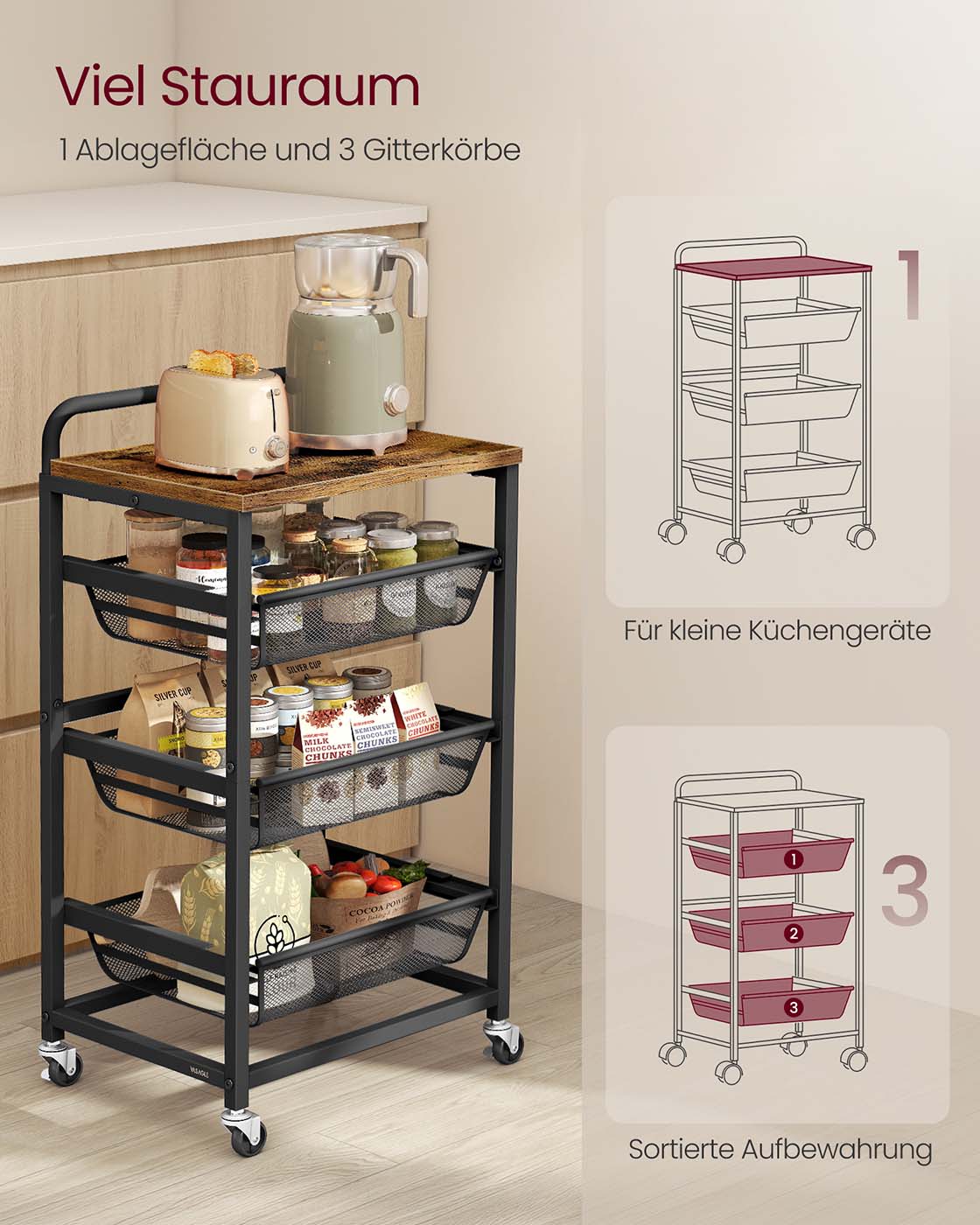 VASAGLE 4-tier serving trolley, rolling cart with pull-out baskets, kitchen shelf on wheels, handle, 31.7 x 40 x 76 cm, vintage brown-ink black LRC040K01