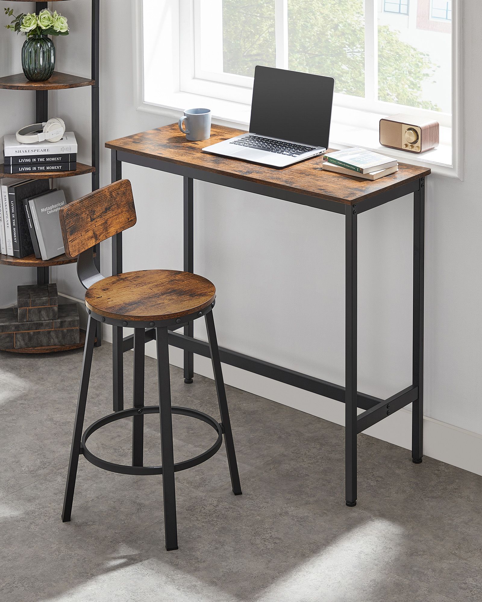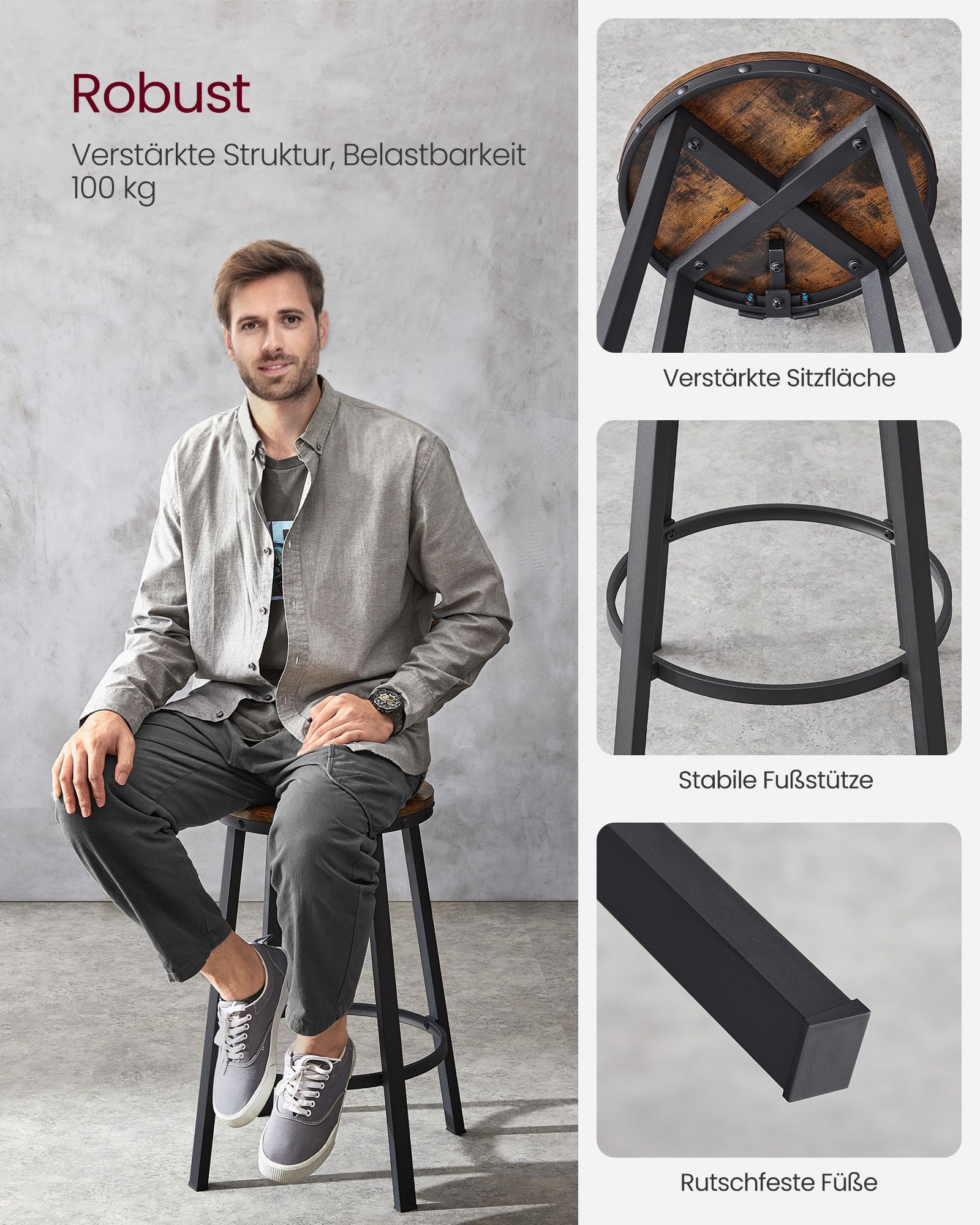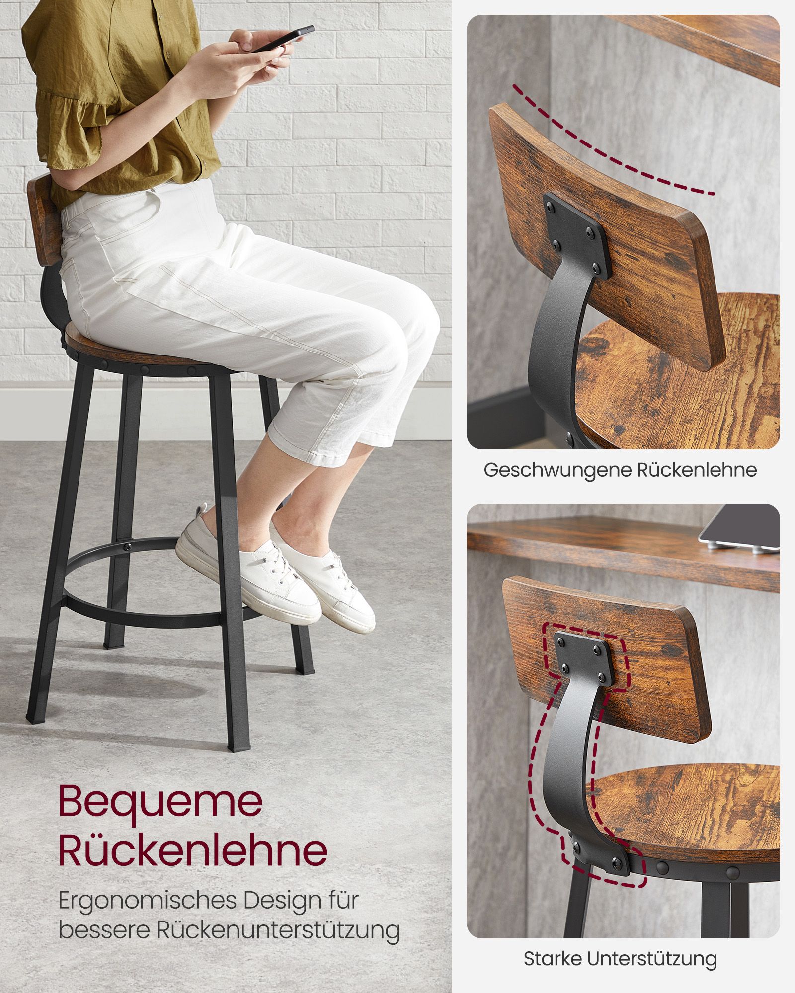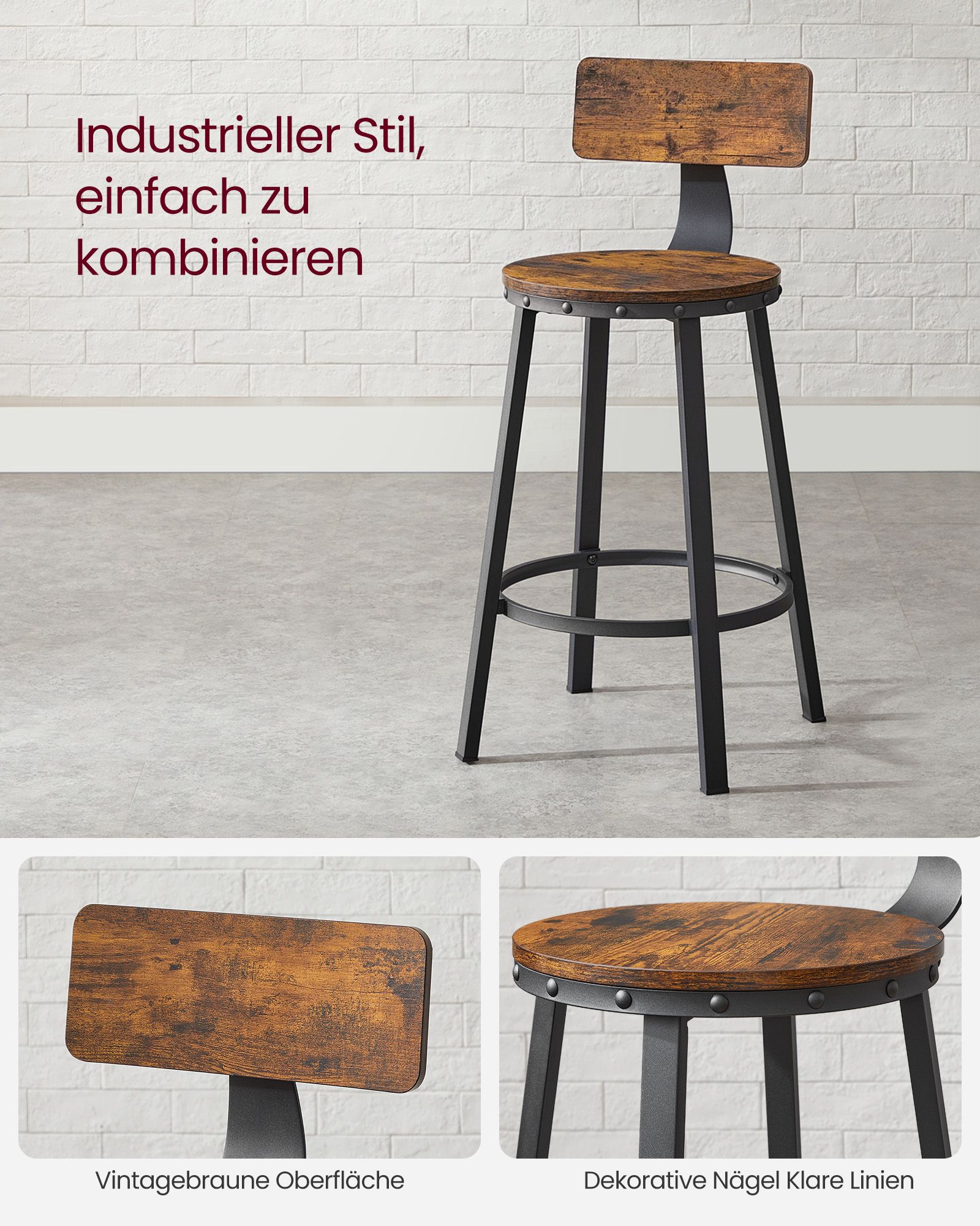 VASAGLE bar stools, set of 2, bar chairs, kitchen chairs with metal frame, seat height 73.2 cm, easy assembly, industrial design, greige-black LBC026B02