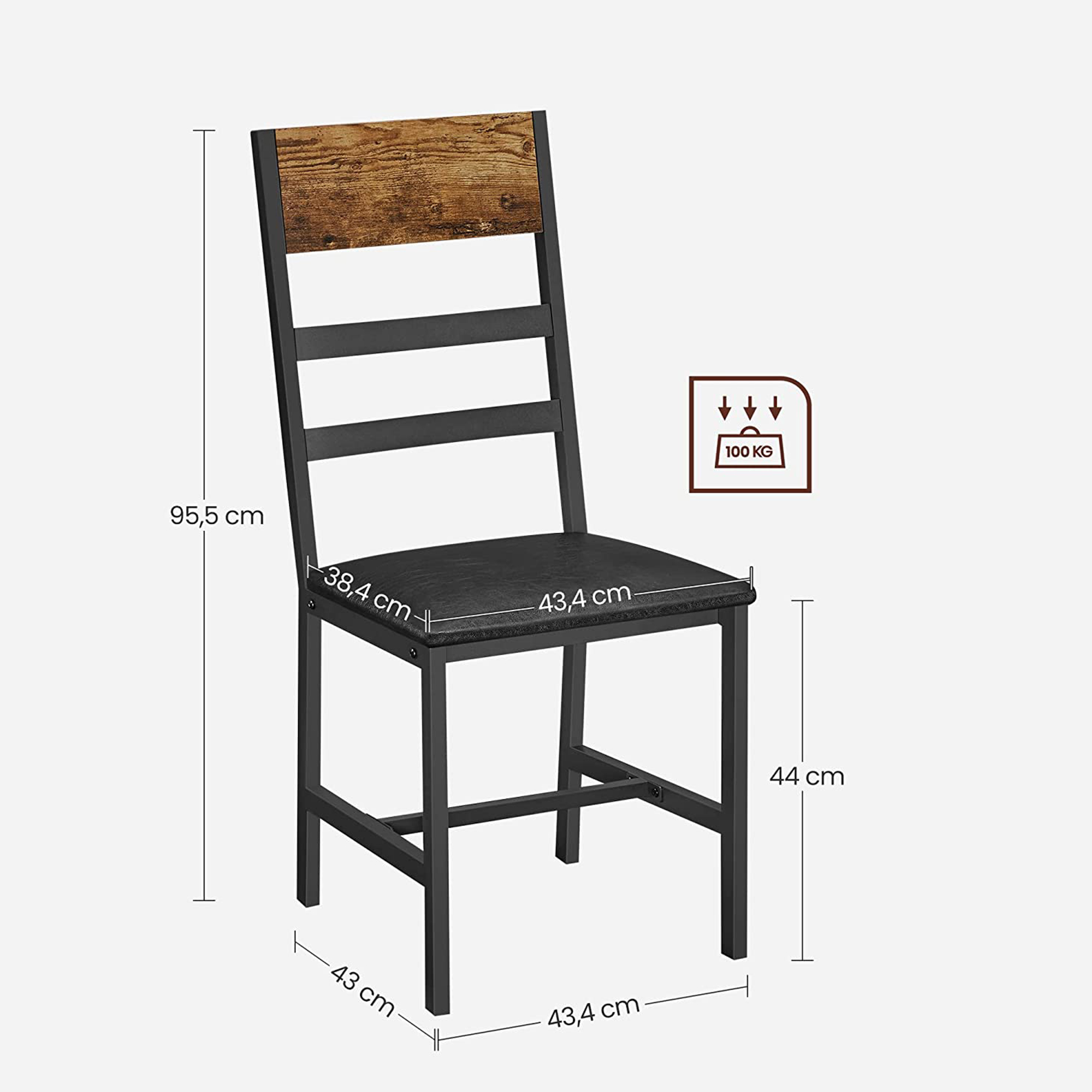 Product details: – Color: Vintage brown-black – Material: Chipboard, steel, foam – Overall chair size: 43.4 x 43 x 95.5 cm (L x W x H) – Seat size: 43.4 x 38.4 cm (L x W) – Seat height: 44 cm – Total weight: 11.2 kg – Max. static load capacity per chair: 100 kg Scope of delivery: – 2 x dining chairs – 1 x accessory pack – 1 x instructions VASAGLE Notes: – For safety reasons, children are not allowed to climb on or play with the product.- The maximum static load capacity per chair is 100 kg. Please do not exceed this maximum weight.
