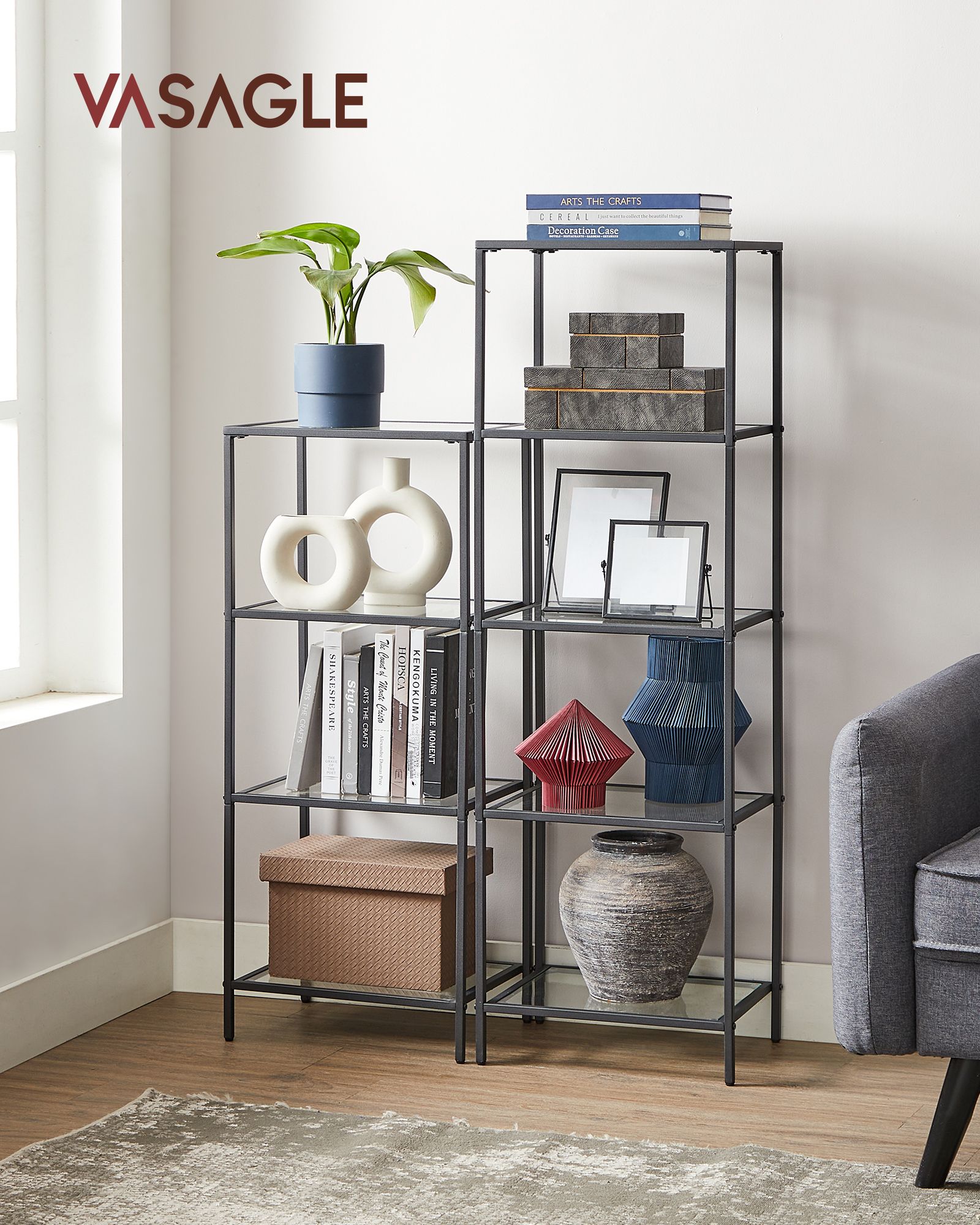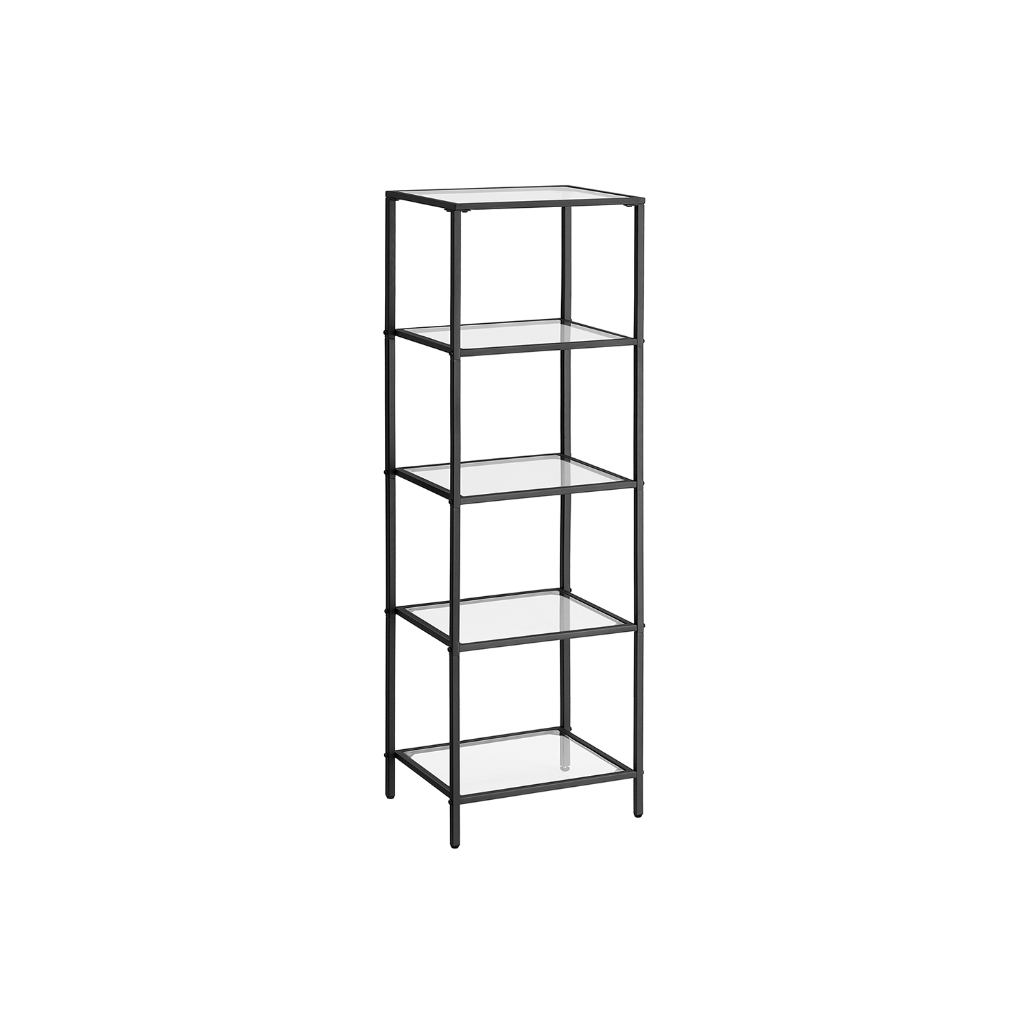 VASAGLE Standing shelf, bookshelf, bathroom shelf, 5 levels, kitchen shelf, narrow, shelf, bathroom shelf, for living room, bedroom, study, tempered glass, steel frame, gold color LGT029A01
