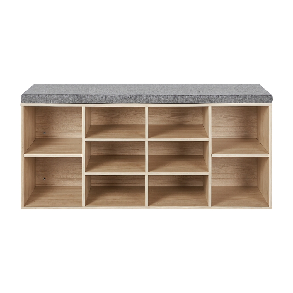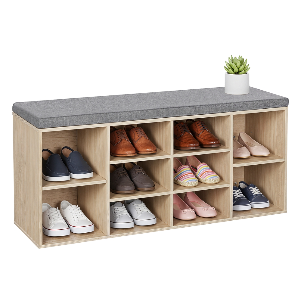 Not enough space for a shoe bench? You will for this! Want to sit comfortably instead of squatting on the floor while putting on your shoes, but your hallway is too small and narrow for a shoe bench? Try this 104 x 30 cm shoe rack to optimize storage space and save room. No more messy piles of shoes! Are your shoes usually scattered around every corner of your home? Put an end to this chaos with this functional shoe bench! 10 compartments offer plenty of storage space for sneakers, sandals, pumps, and boots. Horizontal or vertical? Is your interior design lacking a fresh touch? Not with this stunning piece of furniture! Place it horizontally or vertically to redesign your hallway again and again. Product details: – Color: wood look – Material: imitation linen, foam, E1 class chipboard – Size: 104 x 30 x 48 cm (L x W x H) – Weight: 20.8 kg Scope of delivery: – 1 x shoe bench – 1 x accessories – 1 x instructions (DE, EN, ES, FR, IT)