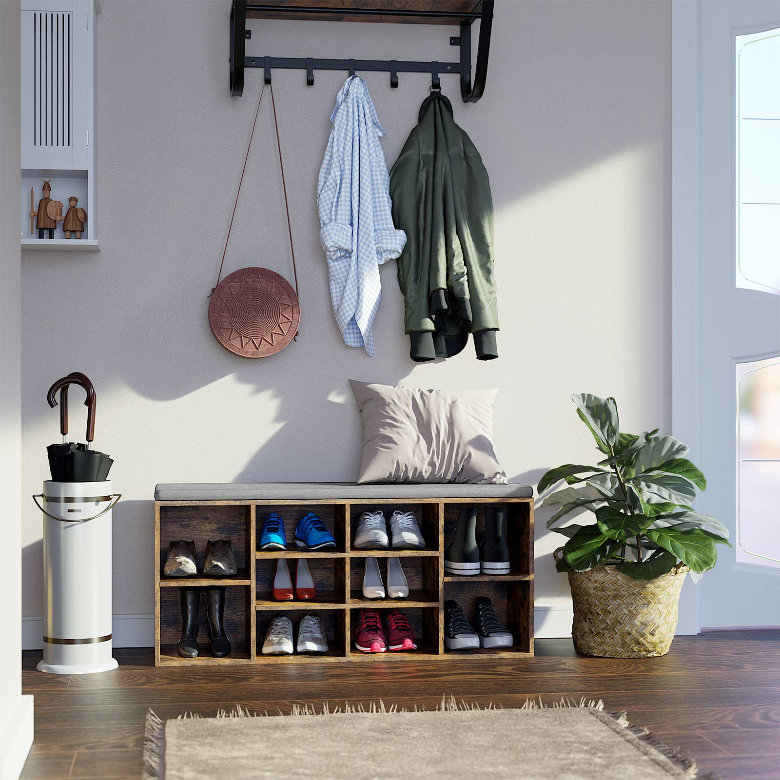 Not enough space for a shoe bench? You will for this one! Would you like to sit comfortably instead of squatting on the floor while putting on your shoes, but your hallway is too small and narrow for a shoe bench? Try this 104 x 30 cm shoe rack, which allows you to optimize storage space and save room. No more messy piles of shoes! Do your shoes usually lie around in every corner of your house? Put an end to this chaos with this functional shoe bench! 10 compartments offer plenty of storage space for sneakers, sandals, pumps, and boots. Horizontal or vertical? Is your interior design lacking a fresh touch? Not with this stunning piece of furniture! Place it horizontally or vertically to redesign your hallway again and again. Product details: – Color: vintage brown, gray cover – Material: faux linen, foam, E1-grade chipboard – Size: 104 x 30 x 48 cm (L x W x H) – Weight: 20.8 kg – Max. static load capacity: 150 kg Scope of delivery: – 1 x shoe bench – 1 x accessory bag – 1 x instructions (DE, EN, ES, FR, IT)