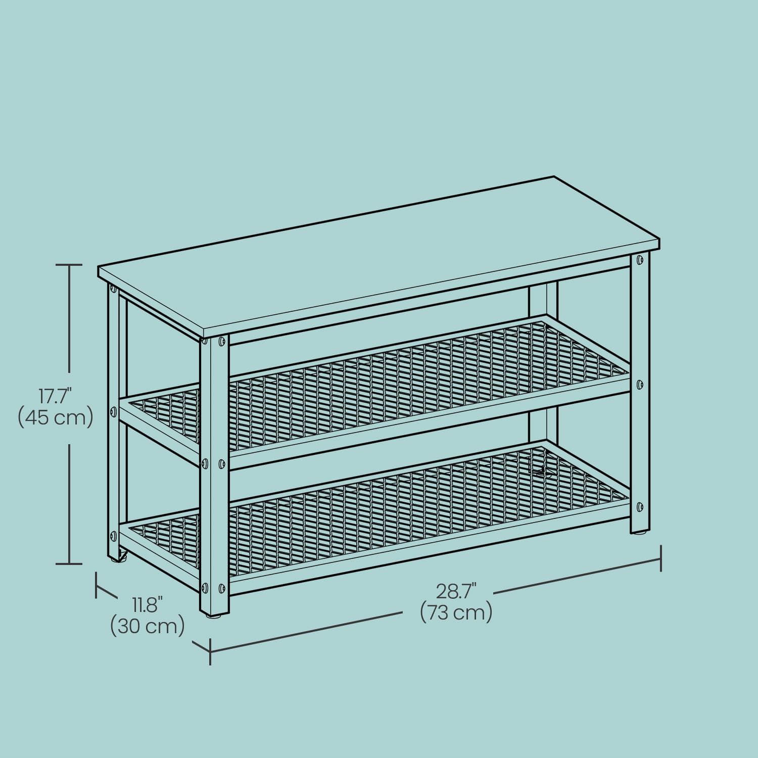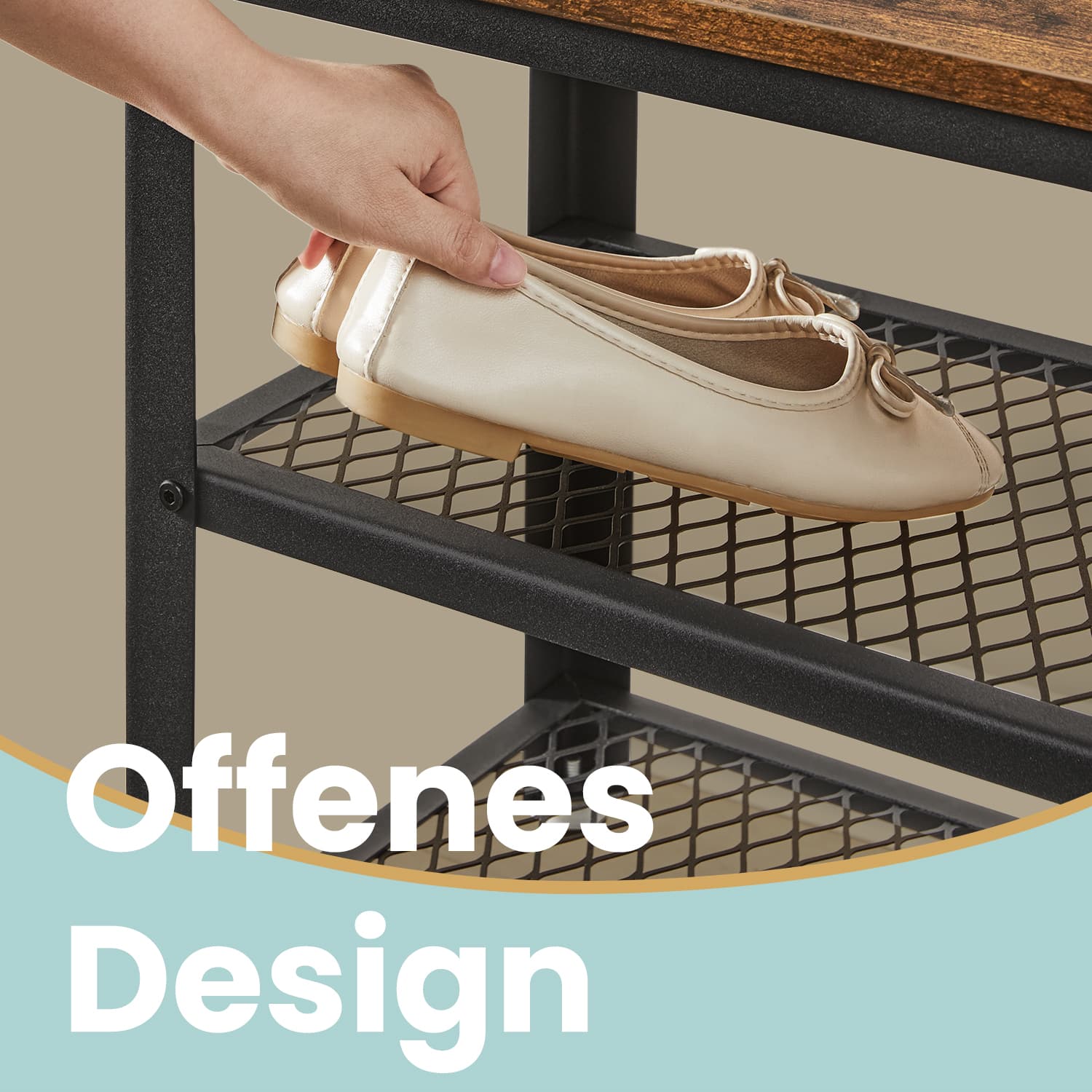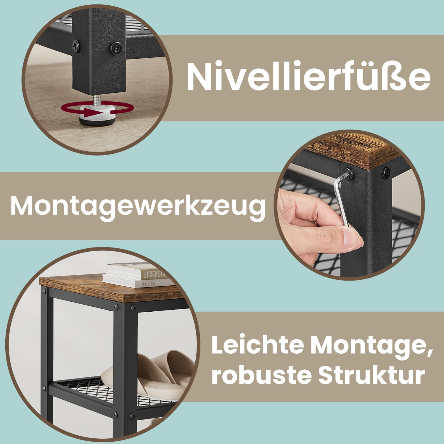 Do you also spend hours looking for the right pair of shoes? Does your entrance area look like a minefield? Then let this shoe rack from VASAGLE rescue your hallway and make it sparkle and shine like in the adverts. Compact and functional This compact shoe rack measures 73 x 45 x 30 cm (W/H/D) and is very space-saving, yet still offers plenty of storage space on 3 levels, making it ideal for small rooms. Thanks to its simple design, this piece of furniture is also versatile and can be used, for example, to store books in the living room, boxes in the bedroom, or bags in the hallway. Everything for your convenience Thanks to the 4 adjustable feet, this rack can be perfectly balanced even on slightly uneven floors. They also protect against scratches. The bench can also hold up to 90 kg, so you can sit down comfortably while putting on your shoes. Rescue your precious shoes from messy piles and give them a well-protected home. This is also beneficial for you, as you no longer have to spend hours looking for the right pair of shoes. This means you can sleep a little longer in the morning. Product details: – Color: vintage brown-black – Material: chipboard, steel – Size: 73 x 45 x 30 cm (W x H x D) – Weight: 8 kg – Load capacity: 90 kg Scope of delivery: – 1 x shoe rack – 1 x accessory bag – 1 x instructions (DE, EN, ES, FR, IT) VASAGLE Notes: – Please position this product in a dry location. – Please observe the maximum load capacity of this product.