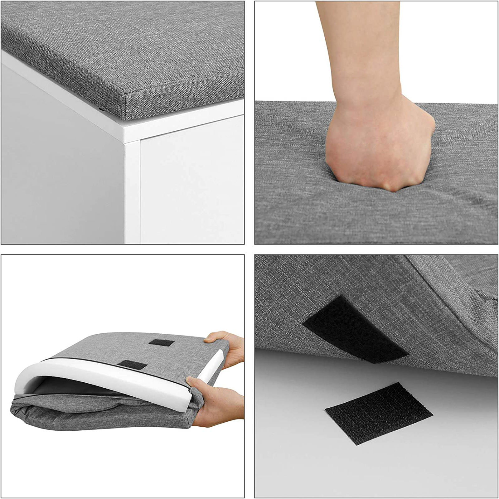 Optimal seating Instead of hopping around the apartment on one leg or squatting uncomfortably on the floor while putting on your shoes, it is certainly more comfortable to sit down on this padded bench and slip on your sneakers at your leisure. Made of durable E1-grade wood-based material and equipped with a well-padded seat, this shoe bench gives you a strong and comfortable hold. Makes optimal use of small spaces Compact yet spacious! This 100 x 30 x 48 cm shoe bench helps you keep your belongings tidy and chaos at bay. You can place it in the hallway, living room, children’s room, or at the end of your bed to store shoes, newspapers, bags, and toys. Product details: – Color: white, seat cover in gray – Material: E1-class chipboard, foam padding, imitation linen seat cover – Size: 100 x 30 x 48 cm (L x W x H) – Weight: 16.5 kg – Max. static load capacity: 200 kg Scope of delivery:- 1 x shoe bench – 1 x accessory pack – 1 x instructions (DE, EN, FR, ES, IT)