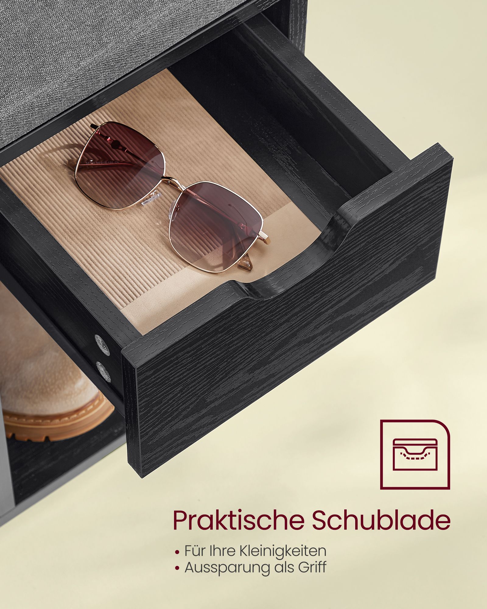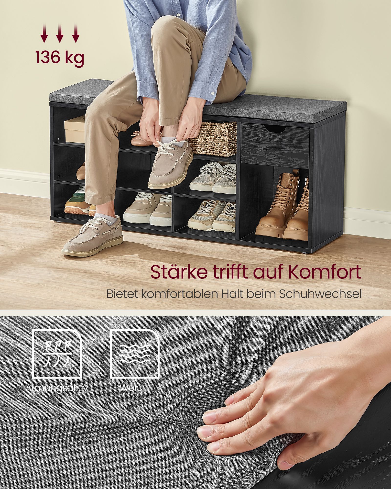 VASAGLE shoe bench, shoe rack with drawer and open compartments, bench, upholstered seat, hallway, bedroom, and entrance area, 30 x 104 x 48 cm
