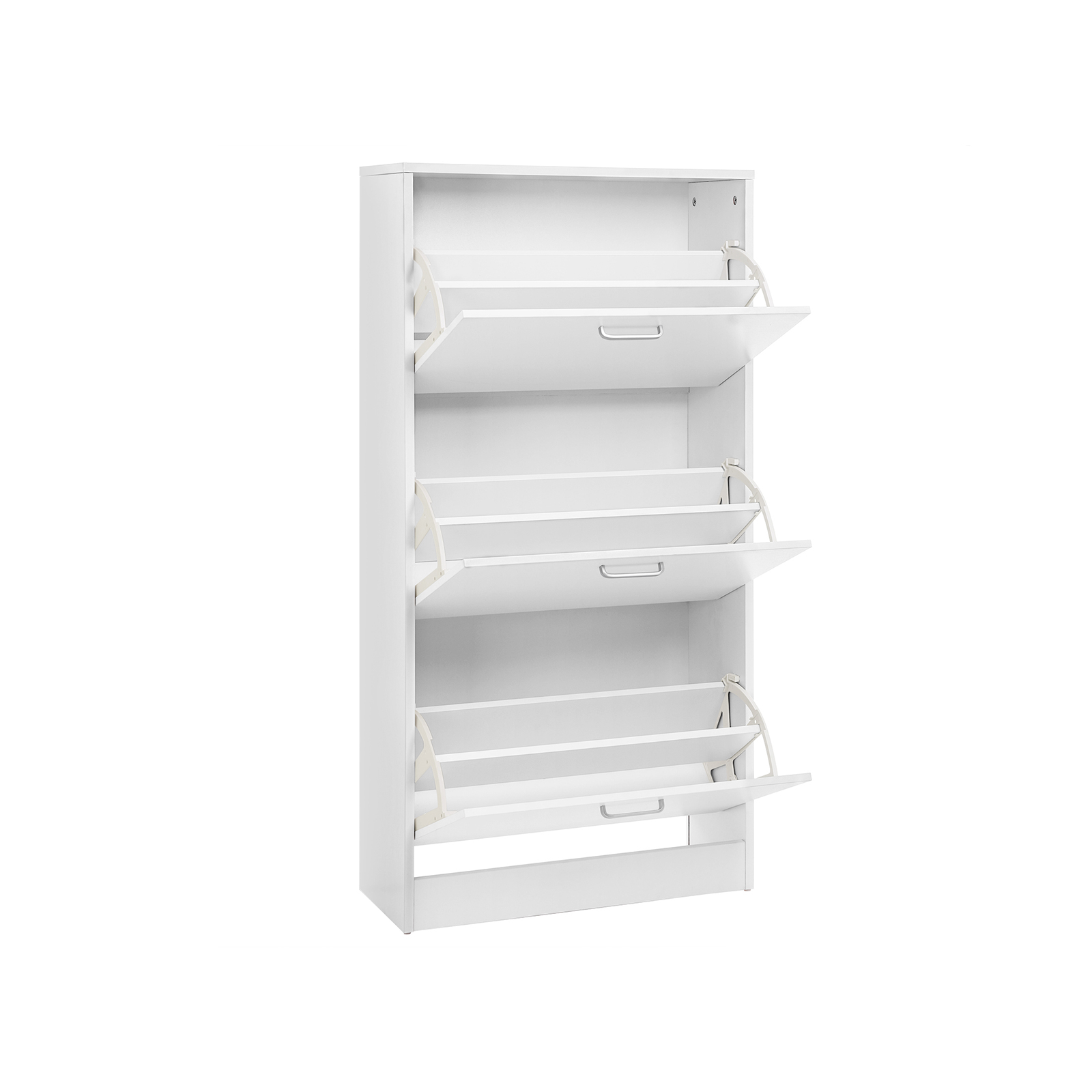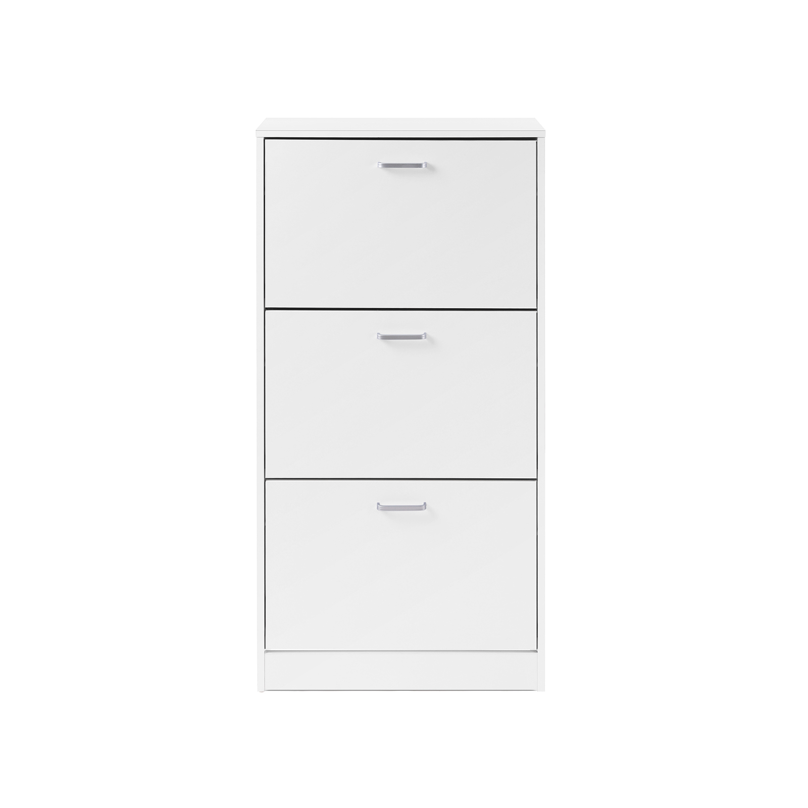 Shoe cabinet with 3 doors Reorganize your pile of stacked shoes. Are you tired of searching for a specific pair of shoes to match your outfit every morning? With this 3-tier shoe cabinet, you can keep all your shoes organized in one place. Thanks to the adjustable dividers inside, this shoe cabinet can flexibly accommodate 12-18 pairs of shoes up to size 46 (EU size). To make assembly easier, all the individual parts of this cabinet have been numbered. A tilt protection device is also included for added stability. Product details: Color: white Material: chipboard Size: 60 x 120 x 24 cm Weight: 21.5 kg
