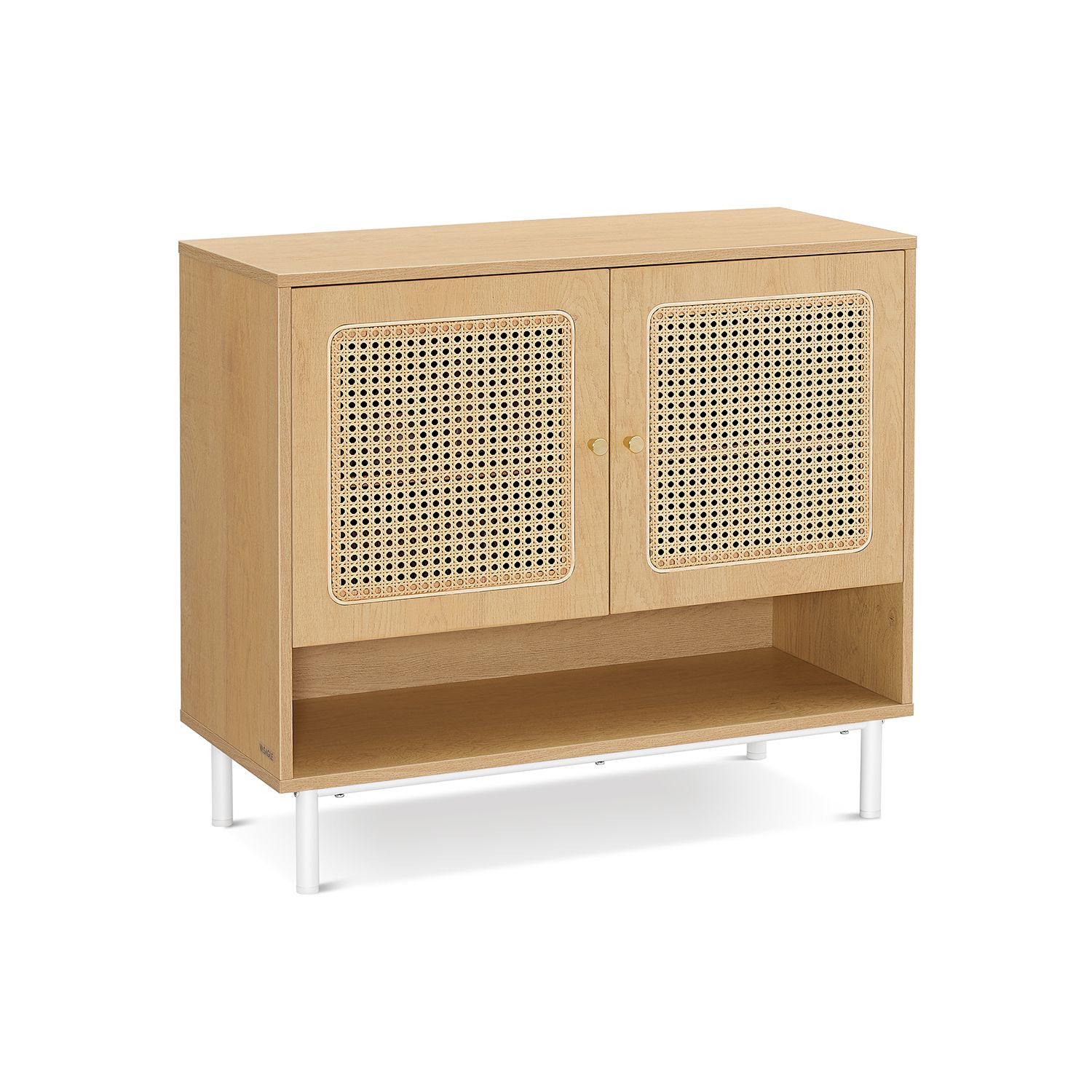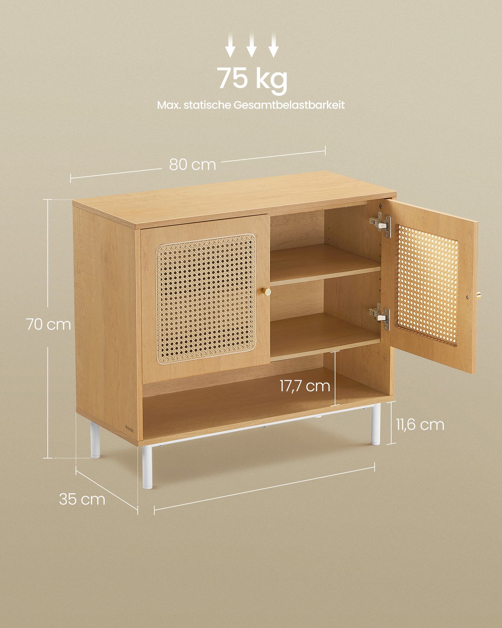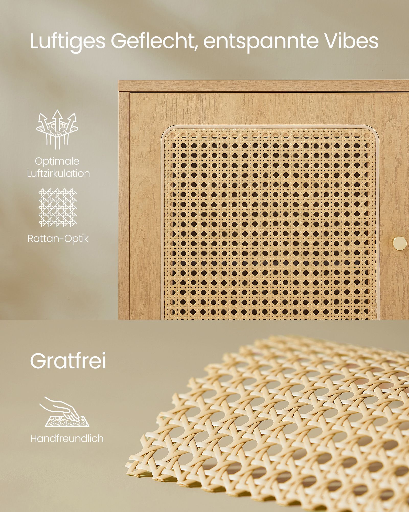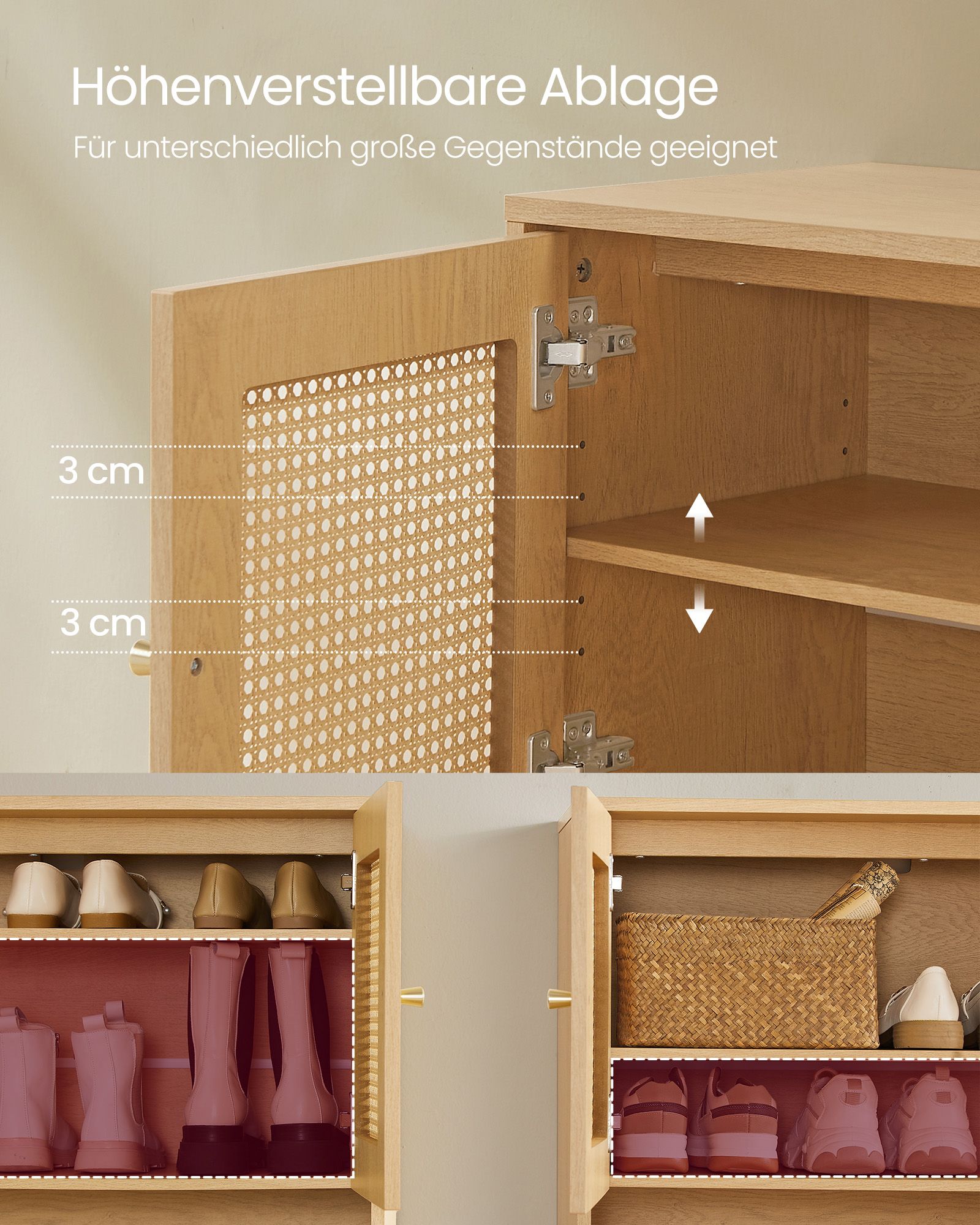 VASAGLE shoe cabinet, 3-tier shoe rack, shoe storage, with rattan-look doors, height-adjustable shelf, cabinet, storage cabinet, steel legs, boho style, oak beige LBC049N01