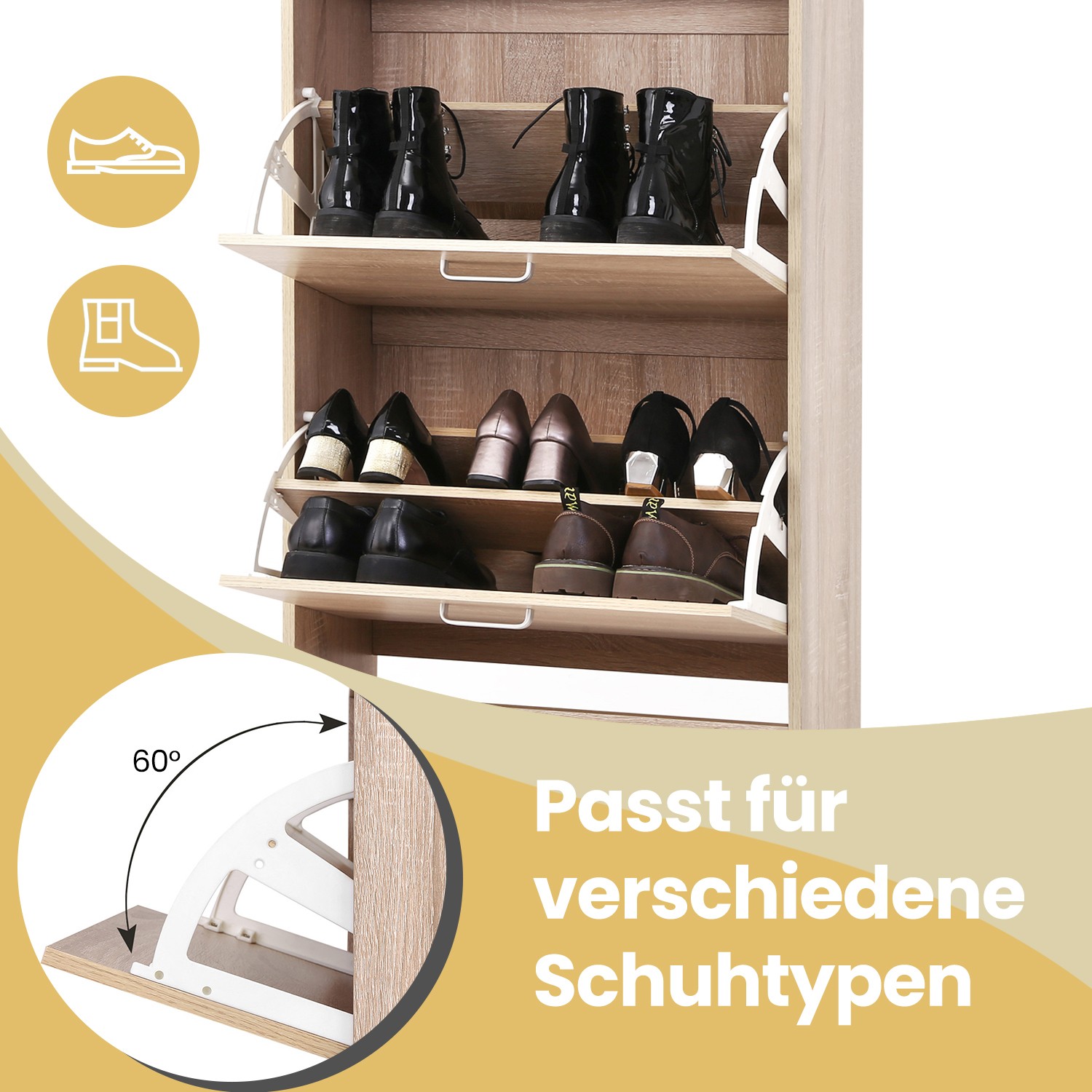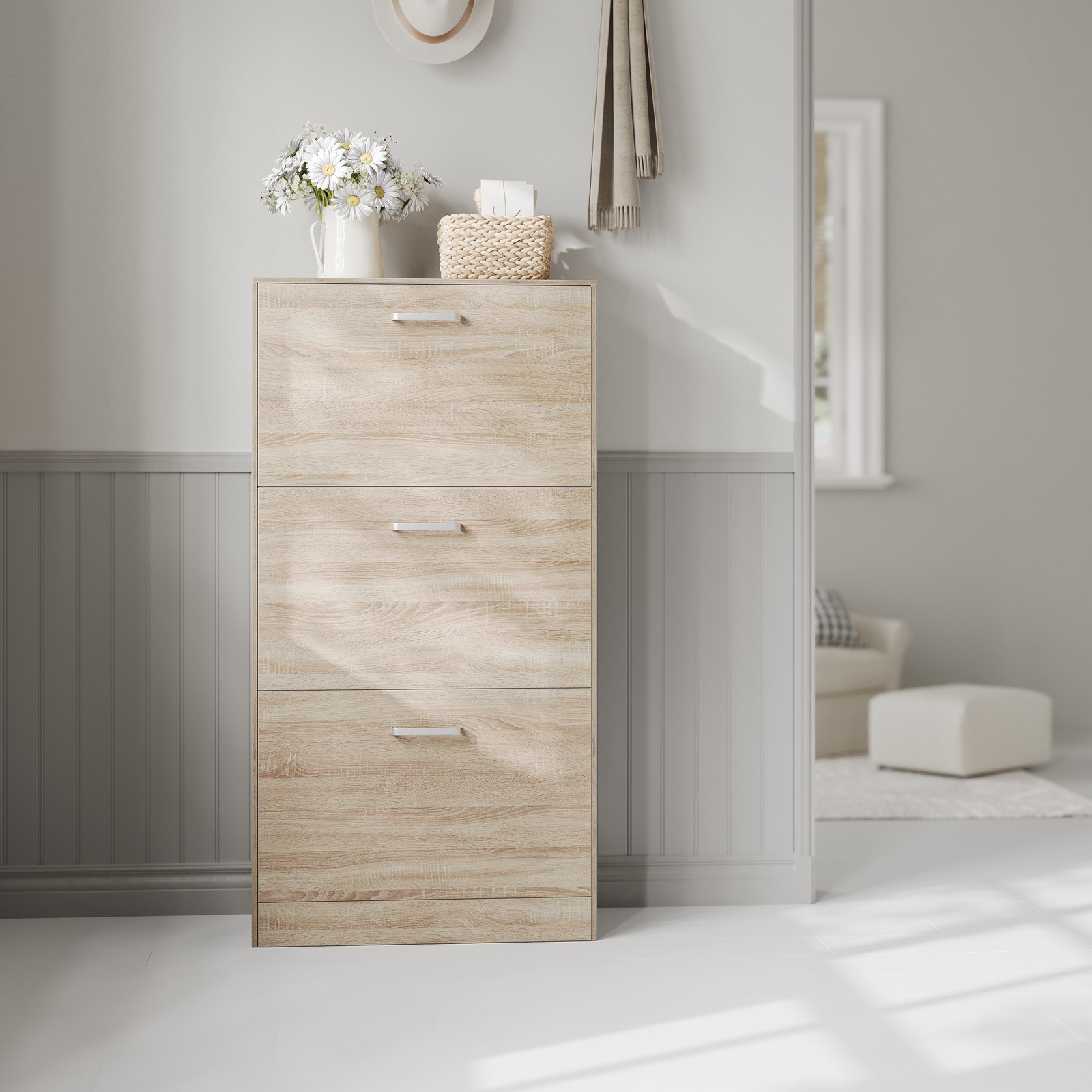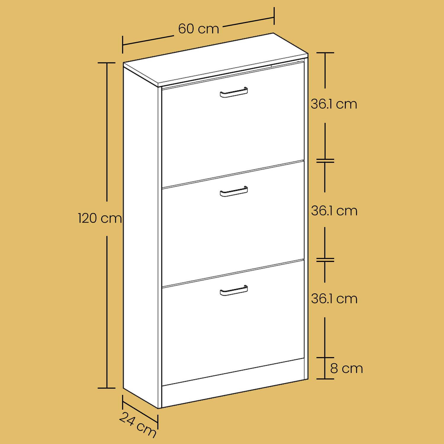Shoe cabinet with 3 flaps Reorganize your pile of stacked shoes. Are you tired of searching for a specific pair of shoes to match your outfit every morning? With this 3-tier shoe cabinet, you can keep all your shoes organized in one place. Thanks to the adjustable dividers inside, this shoe cabinet can flexibly accommodate 12-18 pairs of shoes up to size 46 (EU size). To make assembly easier, all parts of this cabinet have been numbered. A tilt protection device is also included for added stability. Product details: Color: Oak Material: Chipboard Size: 24 x 60 x 120 cm Weight: 21.5 kg
