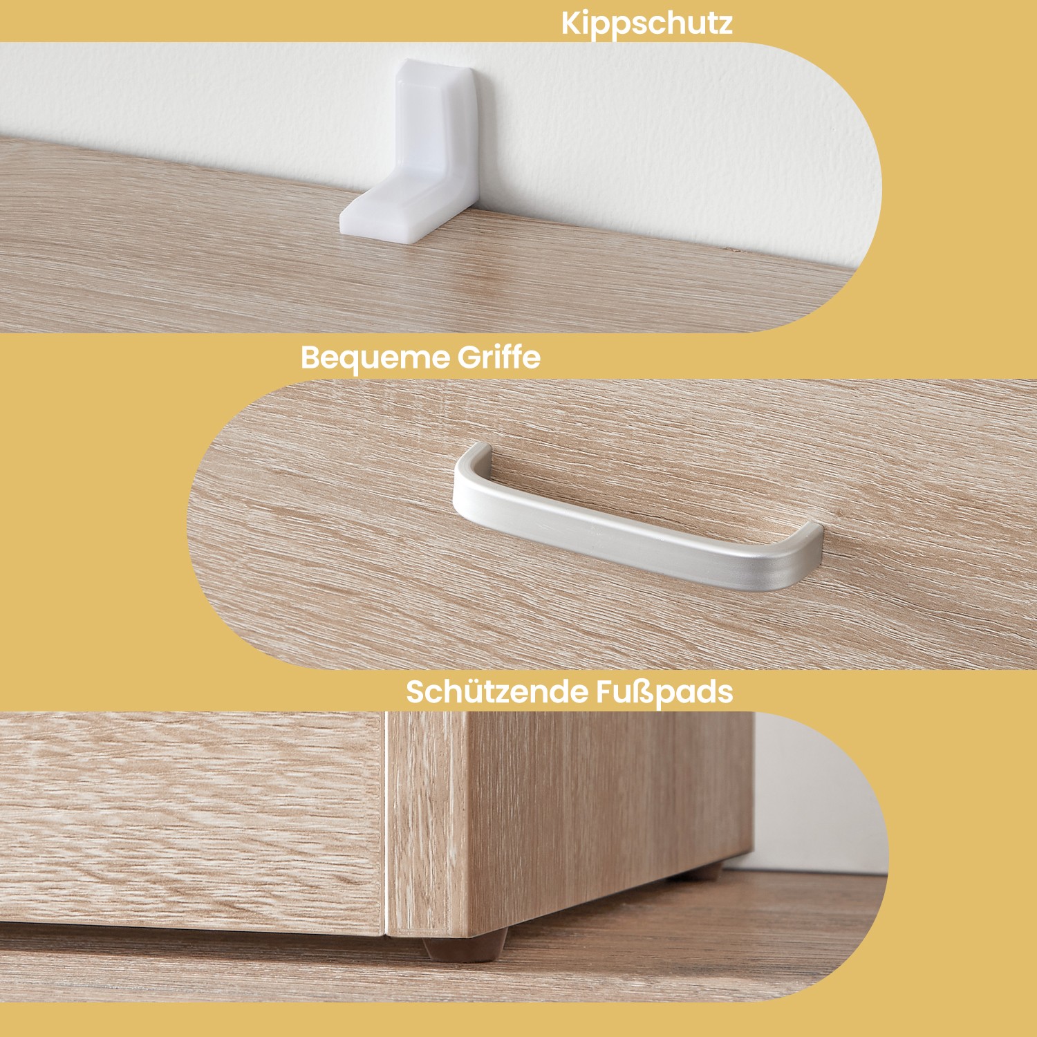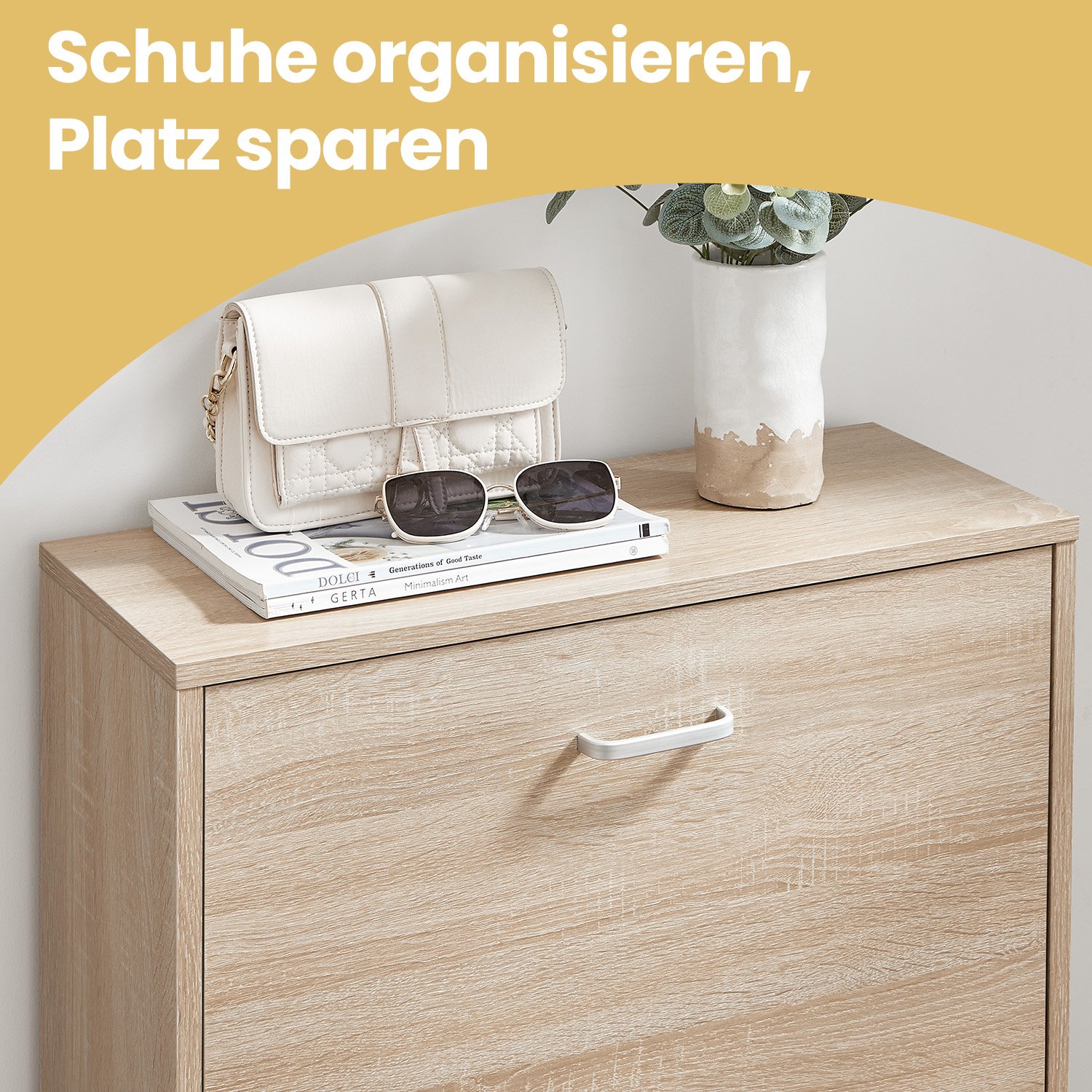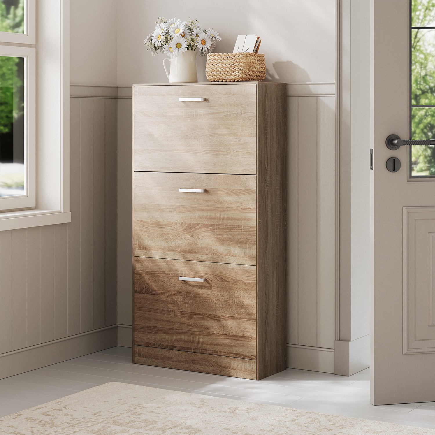 Shoe cabinet with 3 flaps Reorganize your pile of stacked shoes. Are you tired of searching for a specific pair of shoes to match your outfit every morning? With this 3-tier shoe cabinet, you can keep all your shoes organized in one place. Thanks to the adjustable dividers inside, this shoe cabinet can flexibly accommodate 12-18 pairs of shoes up to size 46 (EU size). To make assembly easier, all parts of this cabinet have been numbered. A tilt protection device is also included for added stability. Product details: Color: Oak Material: Chipboard Size: 24 x 60 x 120 cm Weight: 21.5 kg
