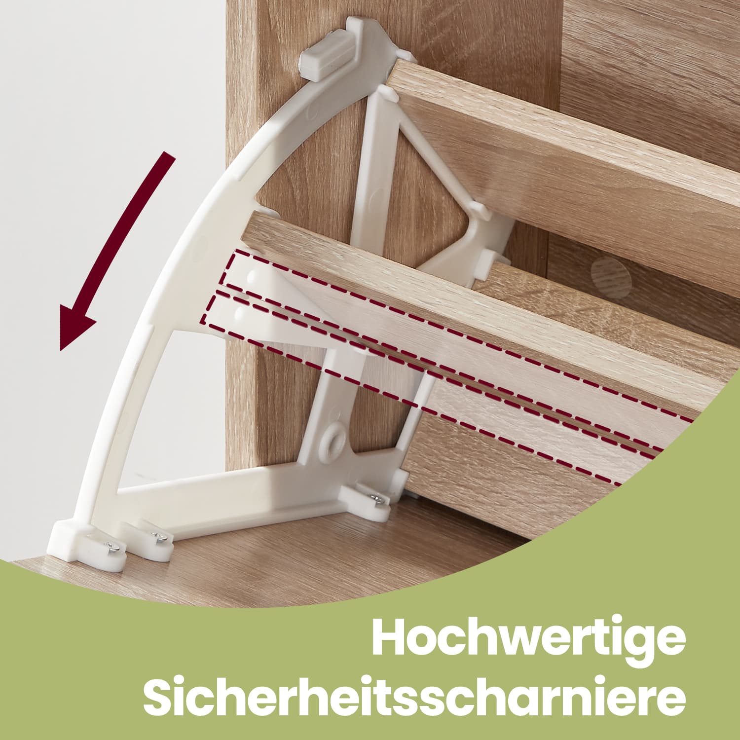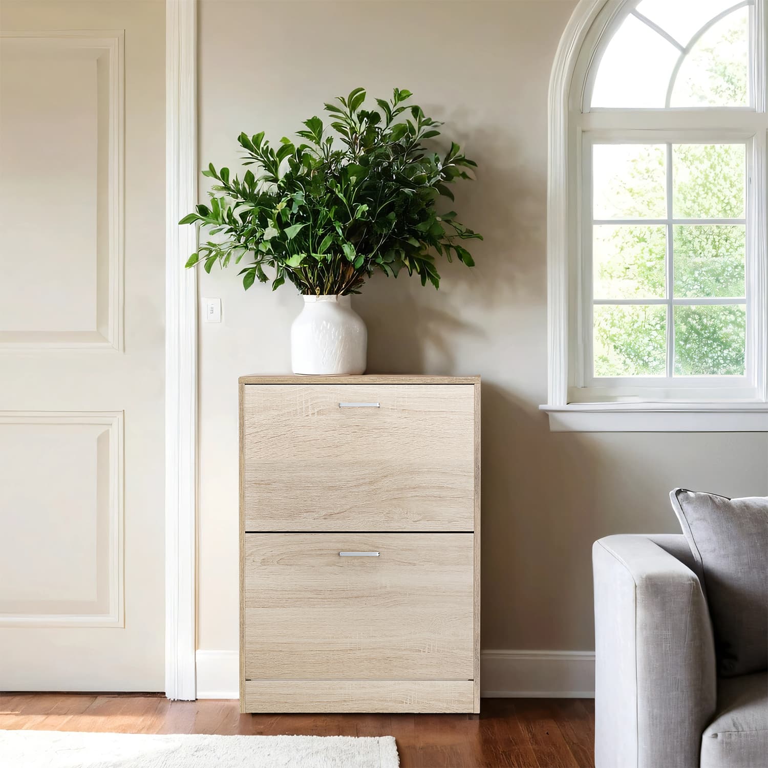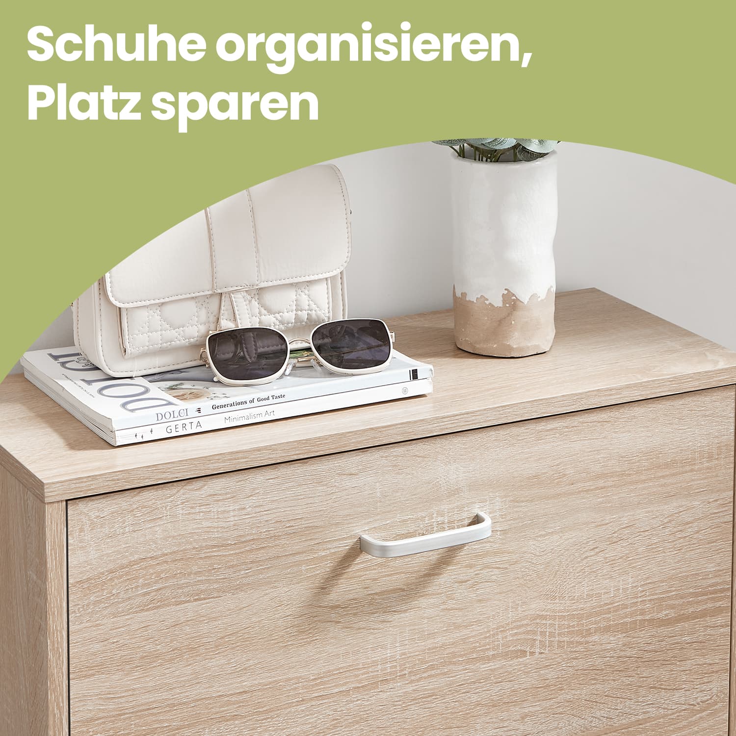 The VASAGLE shoe cabinet is made of high-quality, environmentally friendly chipboard (class E1), opens very smoothly, and offers storage space for 10 to 12 pairs of flat shoes. With a depth of only 24 cm, this cabinet also fits into a narrow space. Combined with a coat rack or chest of drawers, your hallway will always be tidy. It will enhance your entrance area. With the VASAGLE shoe cabinet, you will enjoy your purchase for years to come. Scope of delivery: – 1 x shoe cabinet – 1 x instructions – 1 x bag of fittings Product details: – Dimensions: 60 x 83.5 x 24 cm (W x H x D) – Material: chipboard (PB) + melamine coating – Color: oak – Package dimensions: 92 x 67 x 9.5 cm – Net weight: 17.5 kg – Gross weight: 18 kg