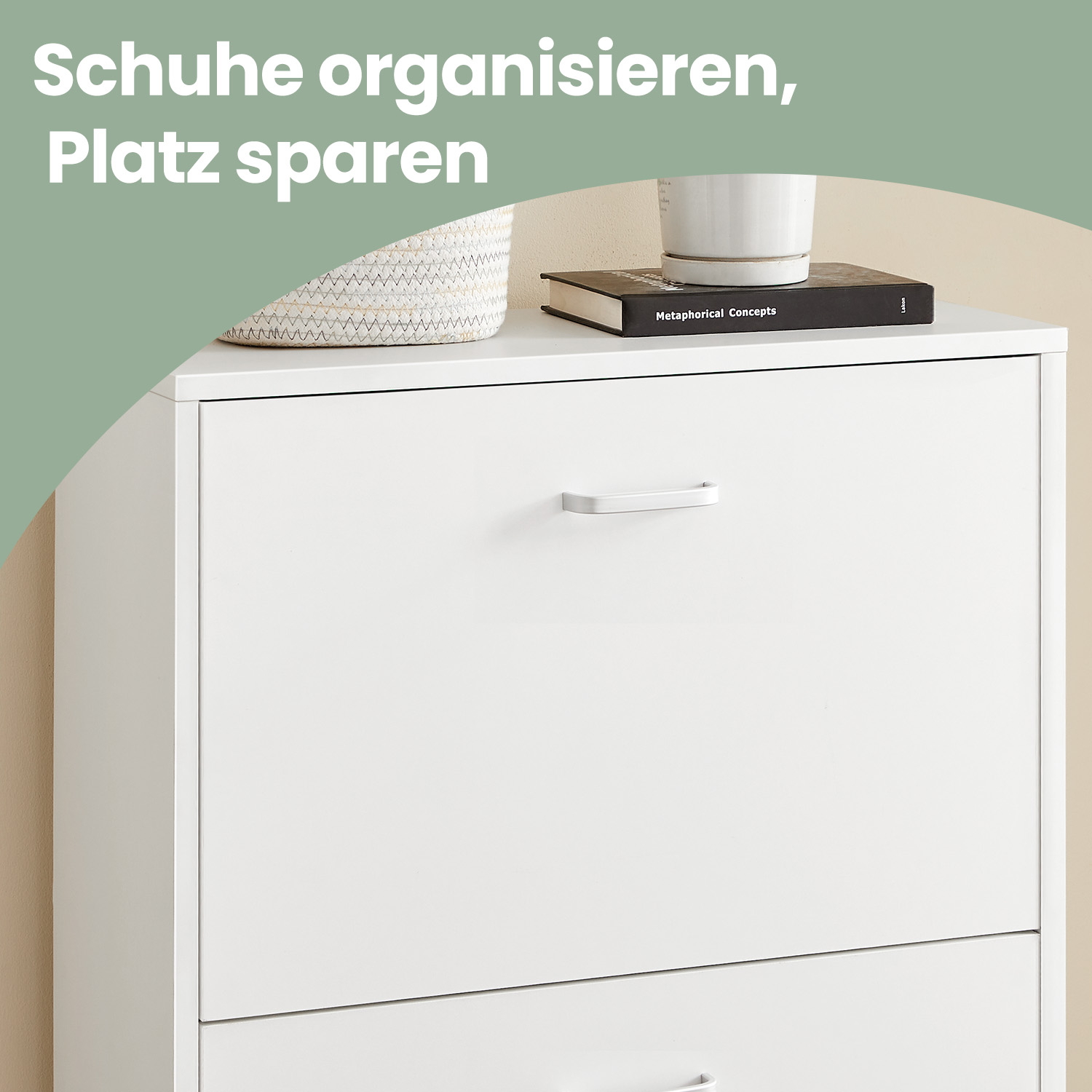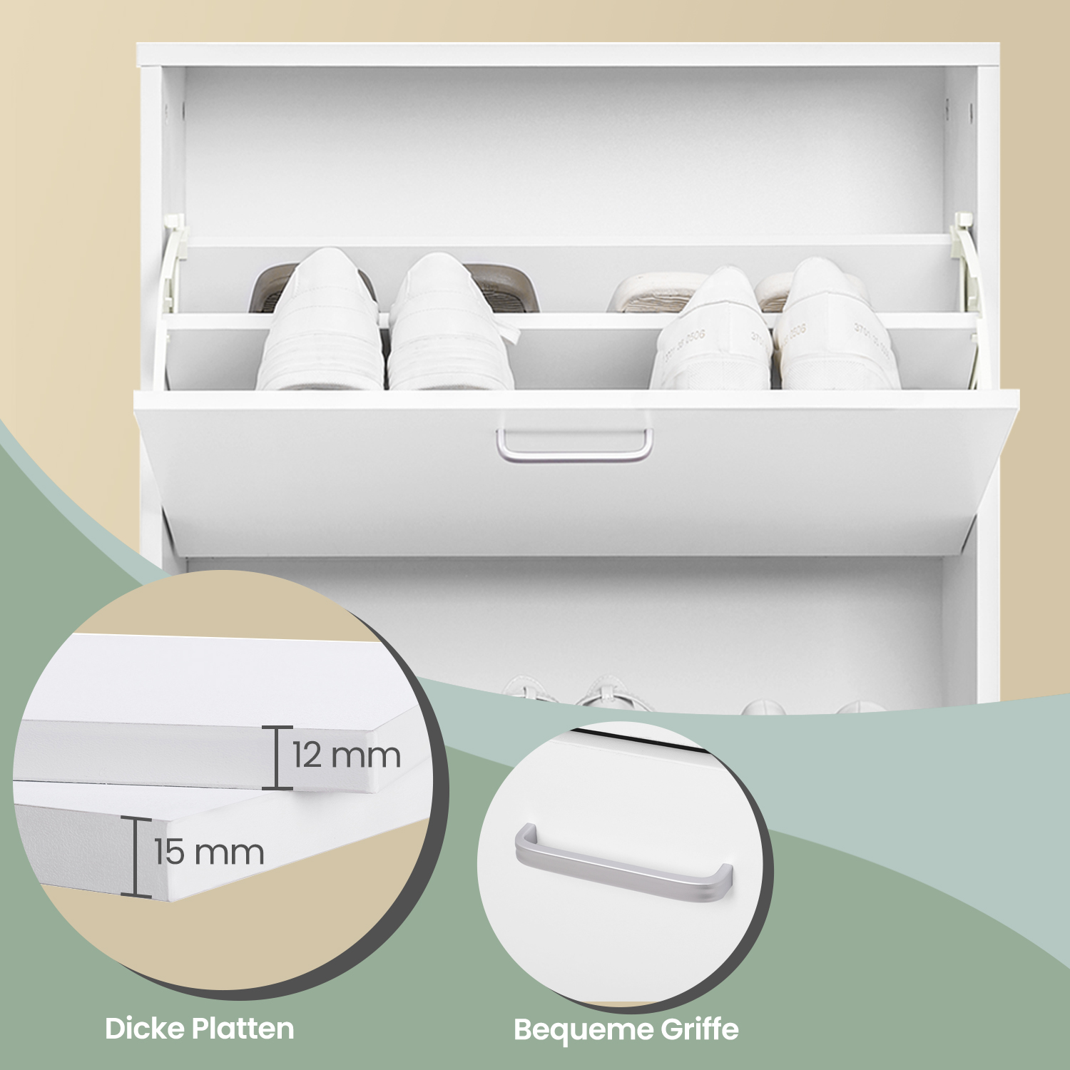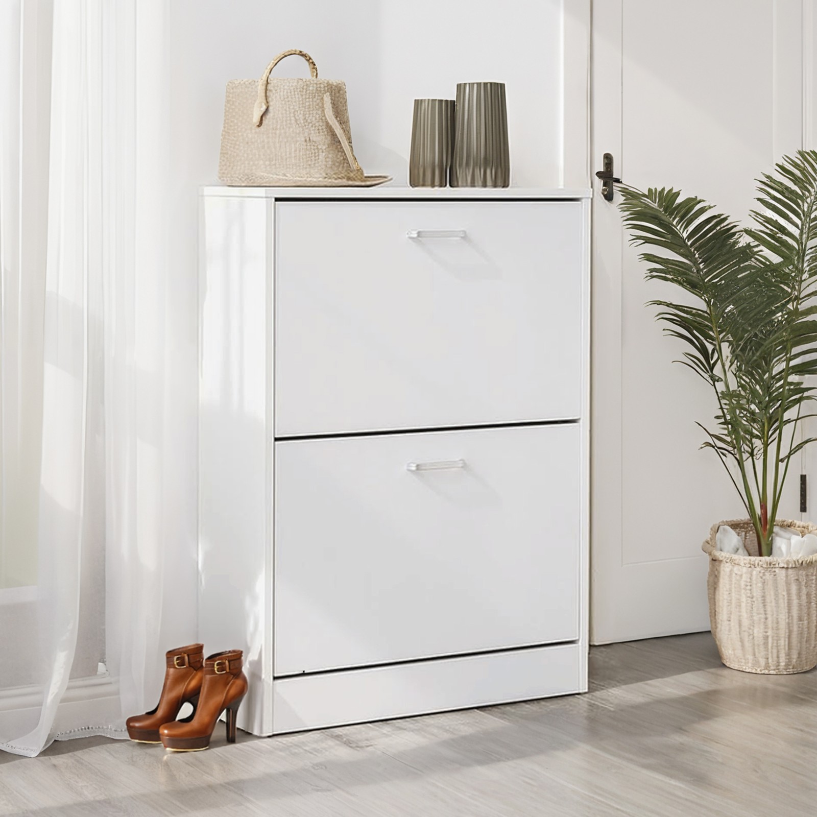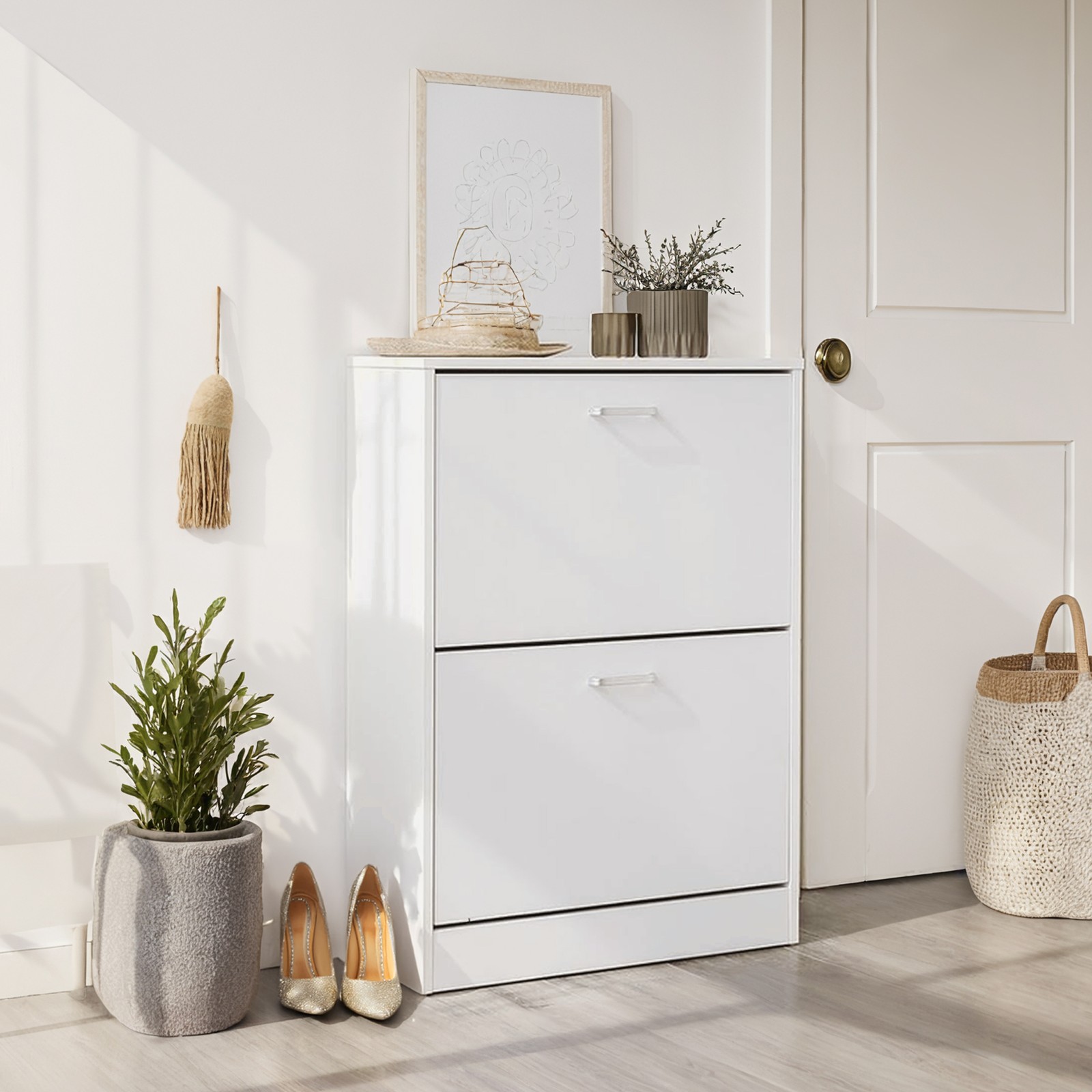 Finally, you can get your shoe chaos under control by storing all your shoes neatly in our shoe cabinet! With its white surface, the shoe cabinet creates a subtle atmosphere in your home. The 2 sturdy flaps are easy to open and reveal plenty of storage space for your shoes. Whether you have dainty pumps, large boots, or even ankle boots, the adjustable and removable dividers allow you to store all your favorite shoes. Even shoes up to size 46 fit completely into the compartments. The shoe cabinet is narrow enough to fit even in a small hallway. You can then embellish it by placing pretty decorations or a plant on top of the shoe cabinet. Since our shoe rack has a back panel, your shoes won’t dirty your wall. The included foot glides also protect your floor from scratches. To ensure that the shoe cabinet remains stable even when fully loaded, an anti-tip device is included in the delivery. Buy our decorative shoe rack and tidy up the pile of shoes next to your front door! Product details: – Color: white – Material: chipboard (class E1) with melamine coating – Max. load capacity per flap: 10 kg – Dimensions: 60 x 83.5 x 24 cm (W x H x D) – Weight: 15 kg Scope of delivery: – 1 x shoe cabinet – 1 x instructions (DE, EN, FR, IT, ES) – 1 x accessory bag VASAGLE Notes: -The shoe cabinet must be secured to the wall. -Please assemble the product according to the assembly steps in the instructions.