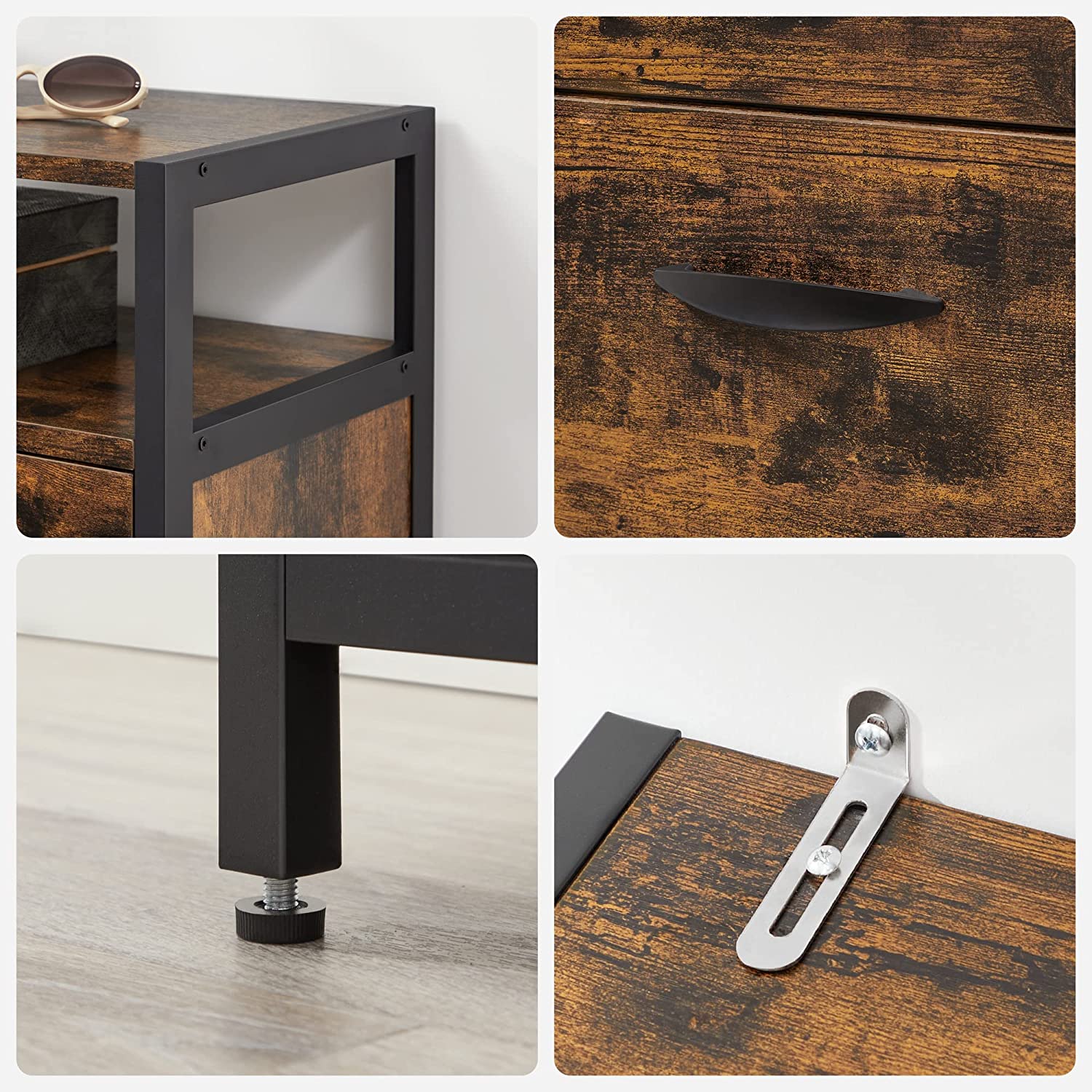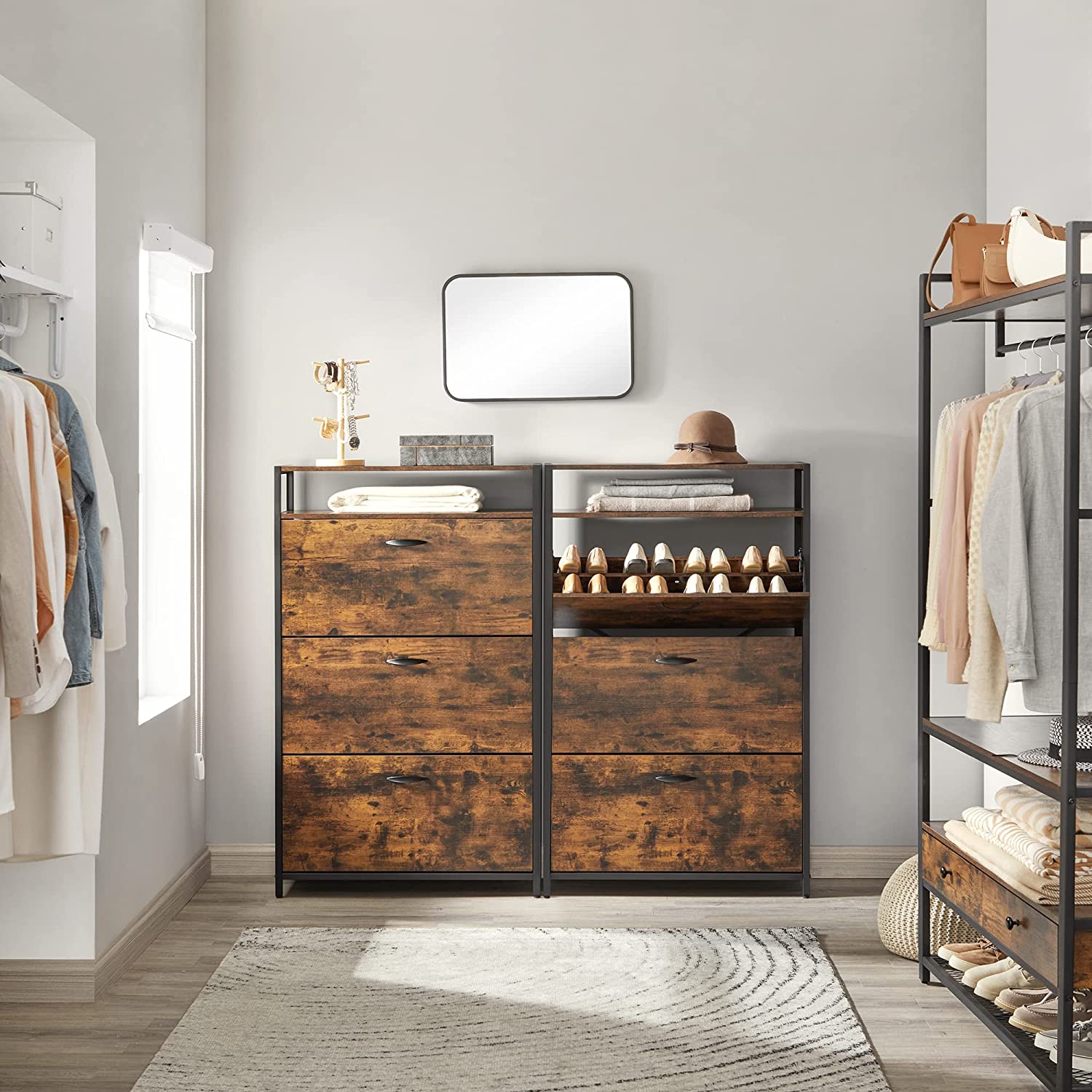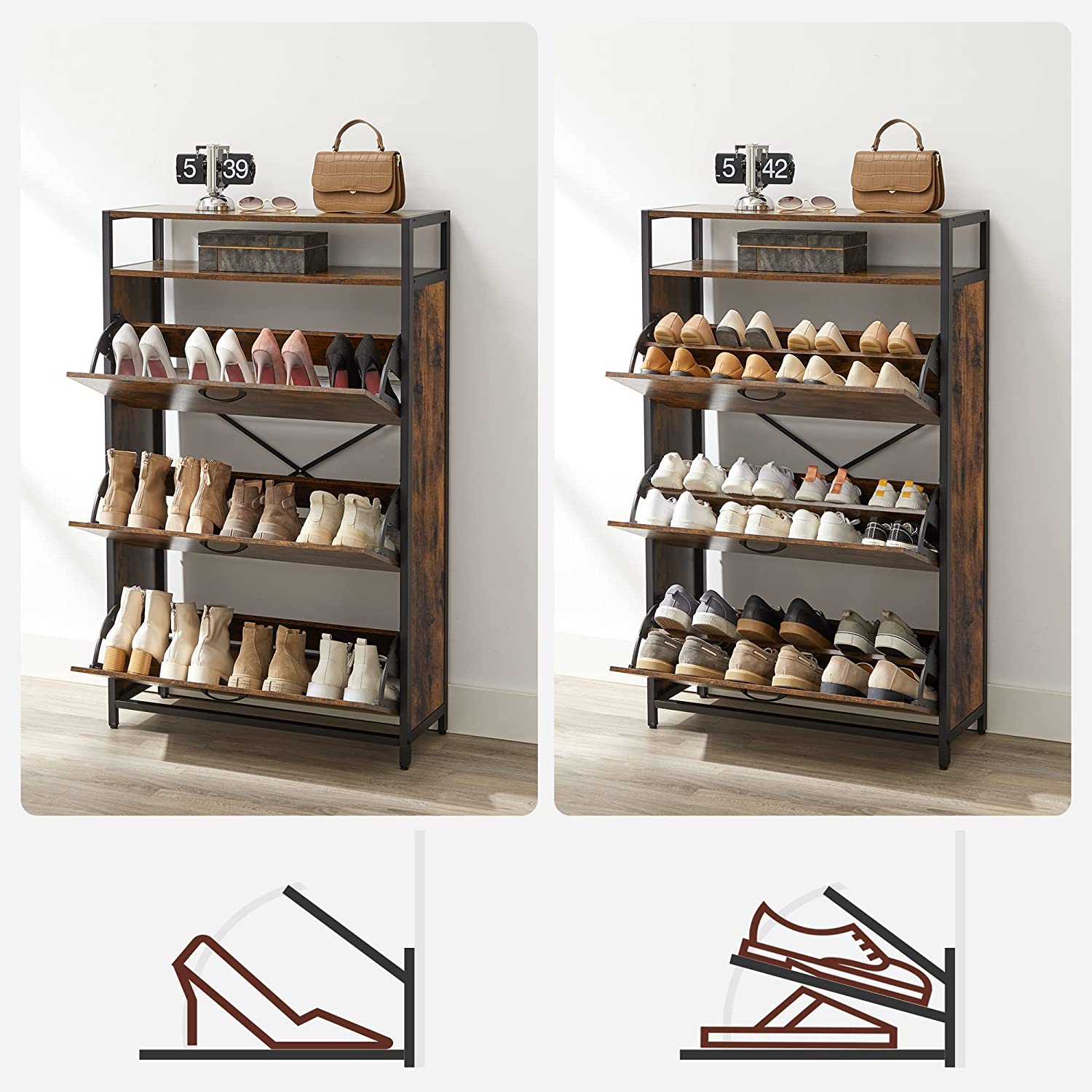 Product details: – Color: Vintage brown-black – Material: Chipboard, steel – Size: 80 x 30 x 130 cm (L x W x H) – Weight: 27.1 kg – Max. static load capacity of the surface: 20 kg – Max. static load capacity per compartment: 5 kg Scope of delivery:- 1 x shoe cabinet – 1 x anti-tip device – 1 x accessory pack – 1 x instruction manual VASAGLE Notes: – For safety reasons, children are not allowed to climb on or play with the product. – Please attach this product to the wall using the included anti-tip device to ensure safe use.