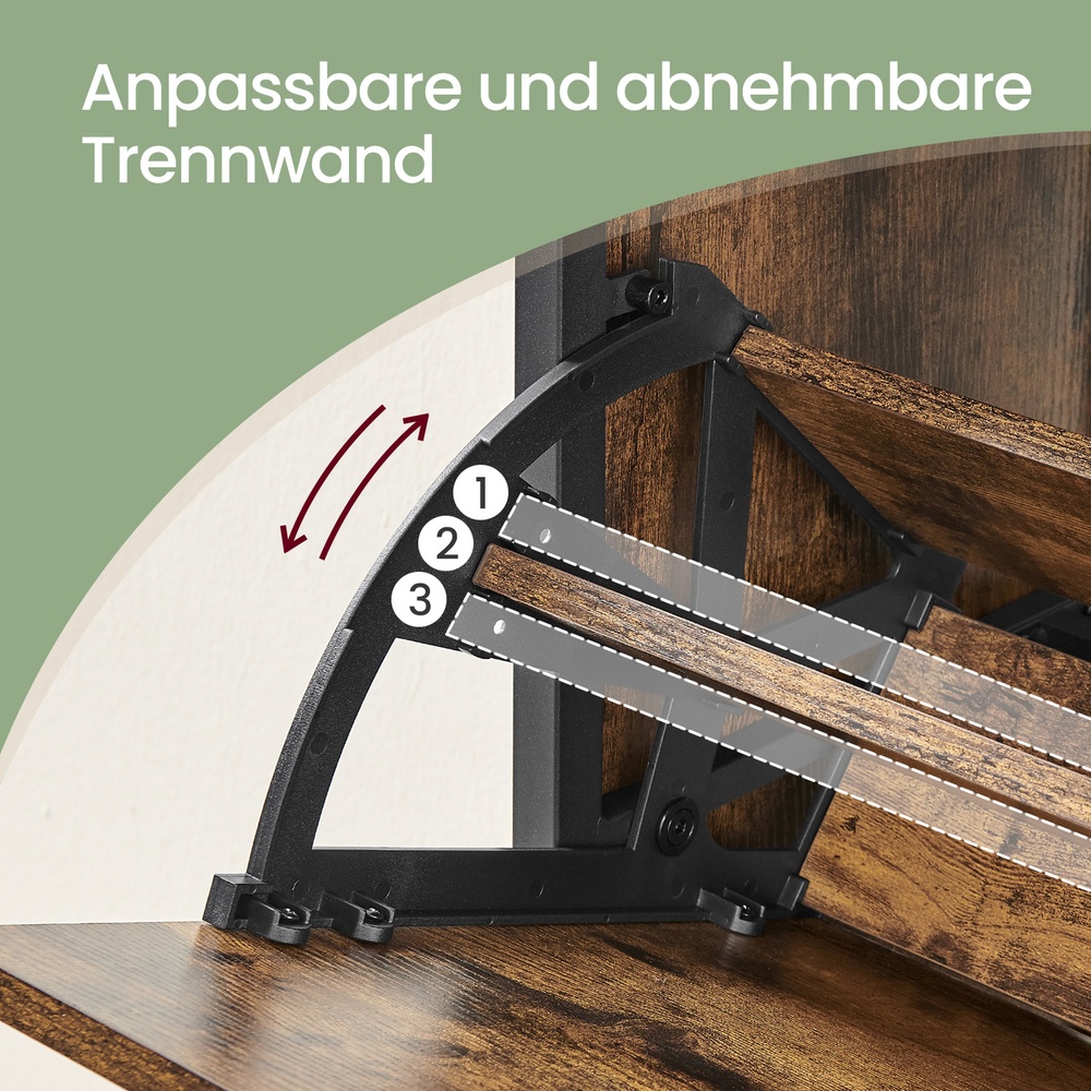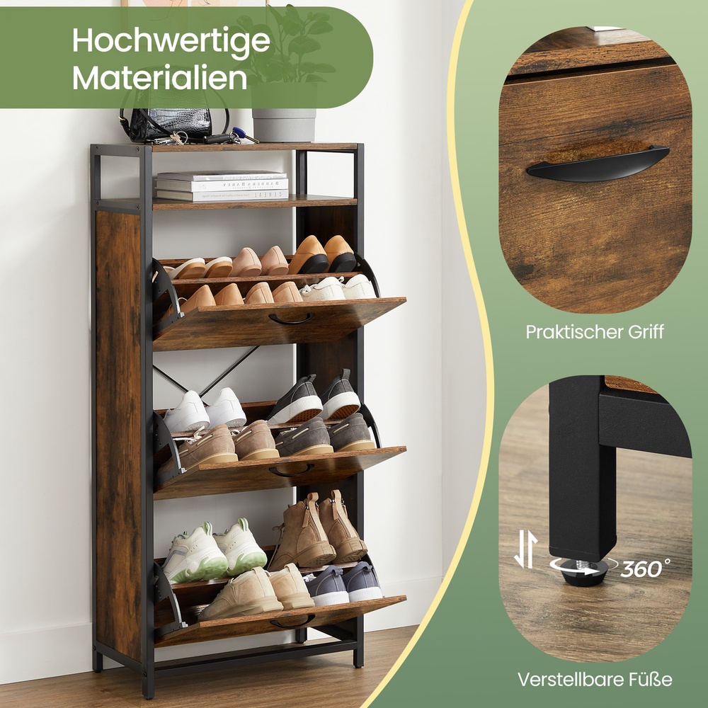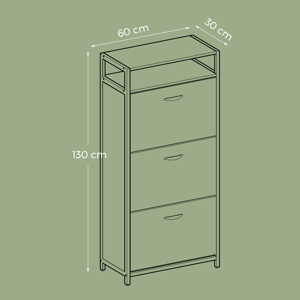 Product details: – Color: vintage brown-black – Material: chipboard, steel – Size: 60 x 30 x 130 cm (L x W x H) – Weight: 20.6 kg – Max. static load capacity of the surface: 20 kg – Max. static load capacity per compartment: 5 kg Scope of delivery:- 1 x shoe cabinet – 1 x accessory package – 1 x anti-tip device – 1 x instructions (DE, EN, FR, ES, IT) VASAGLE notes: – For safety reasons, children are not allowed to climb on or play with the product. – Please attach this product to the wall using the included anti-tip device to ensure safe use.