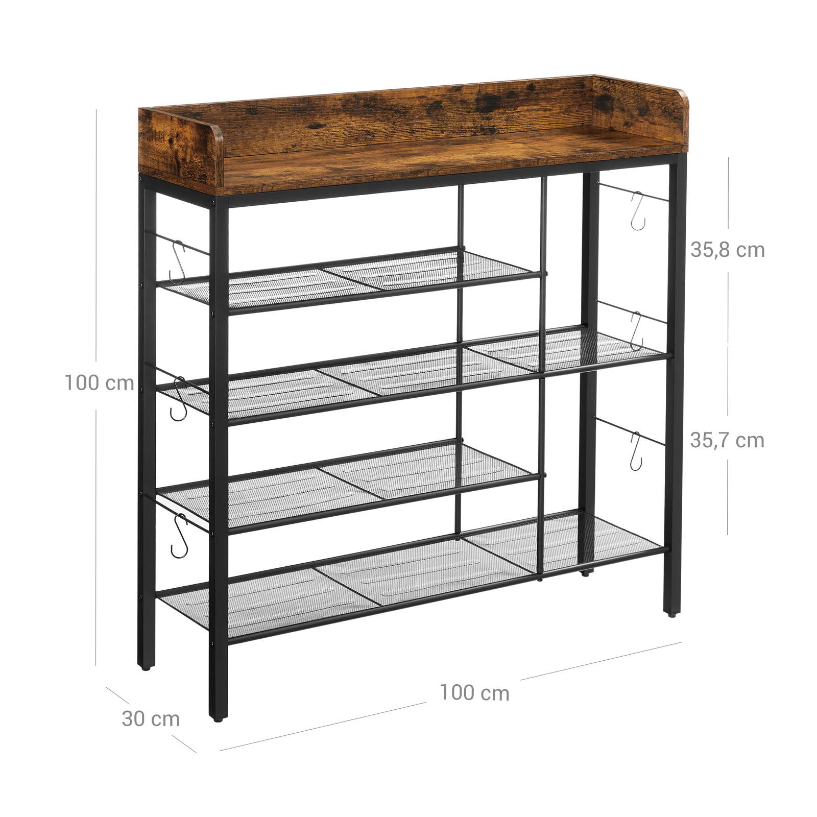 Product details: – Color: Vintage brown-black – Material: Chipboard, steel – Size: 100 x 30 x 100 cm (L x W x H) – Weight: 10.7 kg – Max. static load capacity of the surface: 10 kg – Max. static load per grid shelf: 5 kg – Max. total static load capacity: 30 kg Scope of delivery: – 1 x shoe rack – 1 x accessory package – 1 x anti-tip device – 1 x instructions (DE, EN, ES, FR, IT) VASAGLE Notes: – For safety reasons, children are not allowed to climb on or play with the product.- Please secure this product to the wall with the included anti-tip device to ensure safe use. – The maximum static load capacity of the product is 30 kg. Please do not exceed this maximum weight.