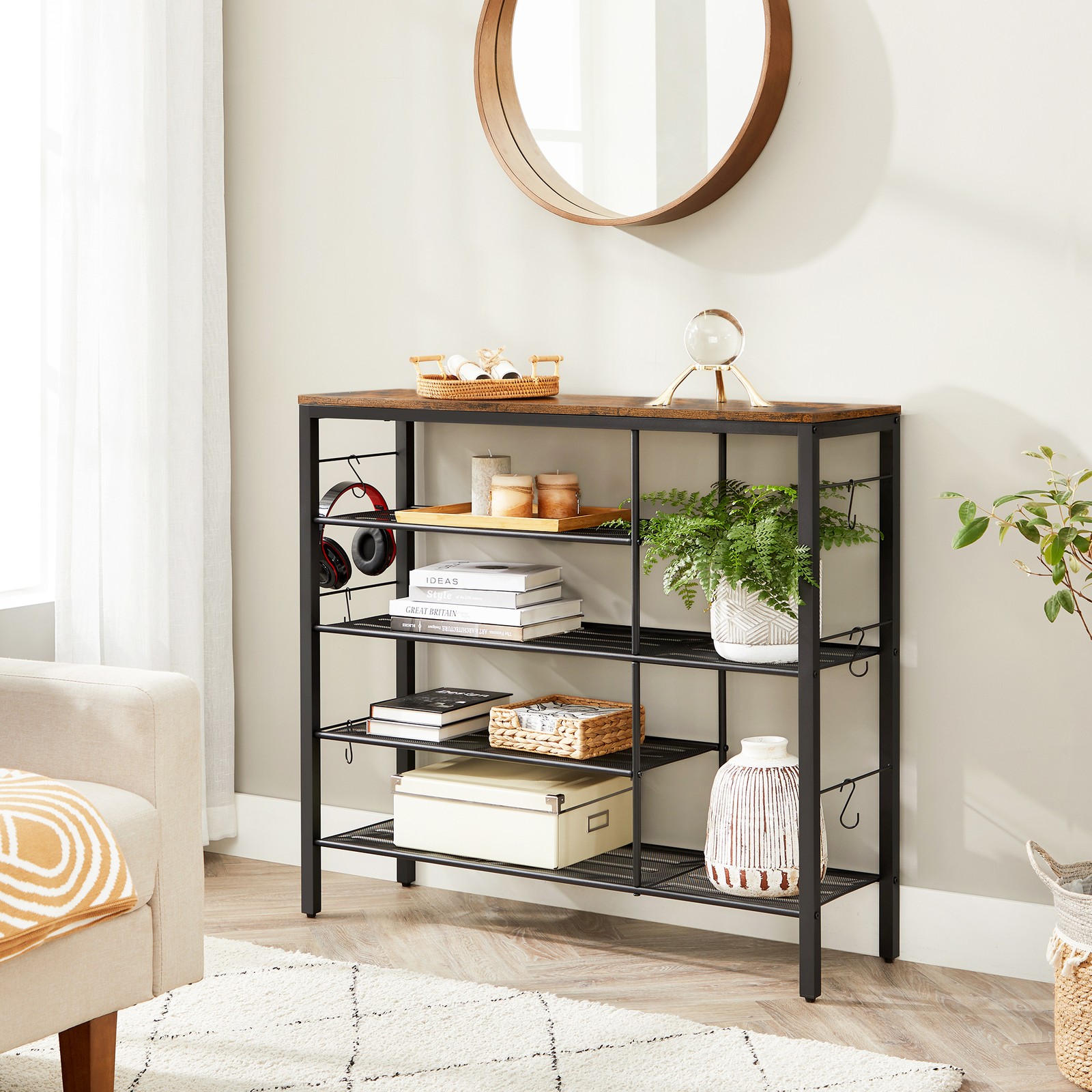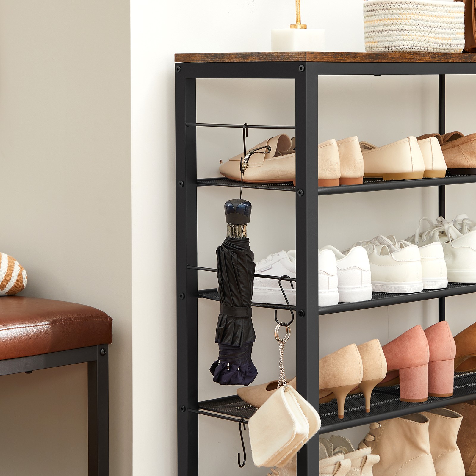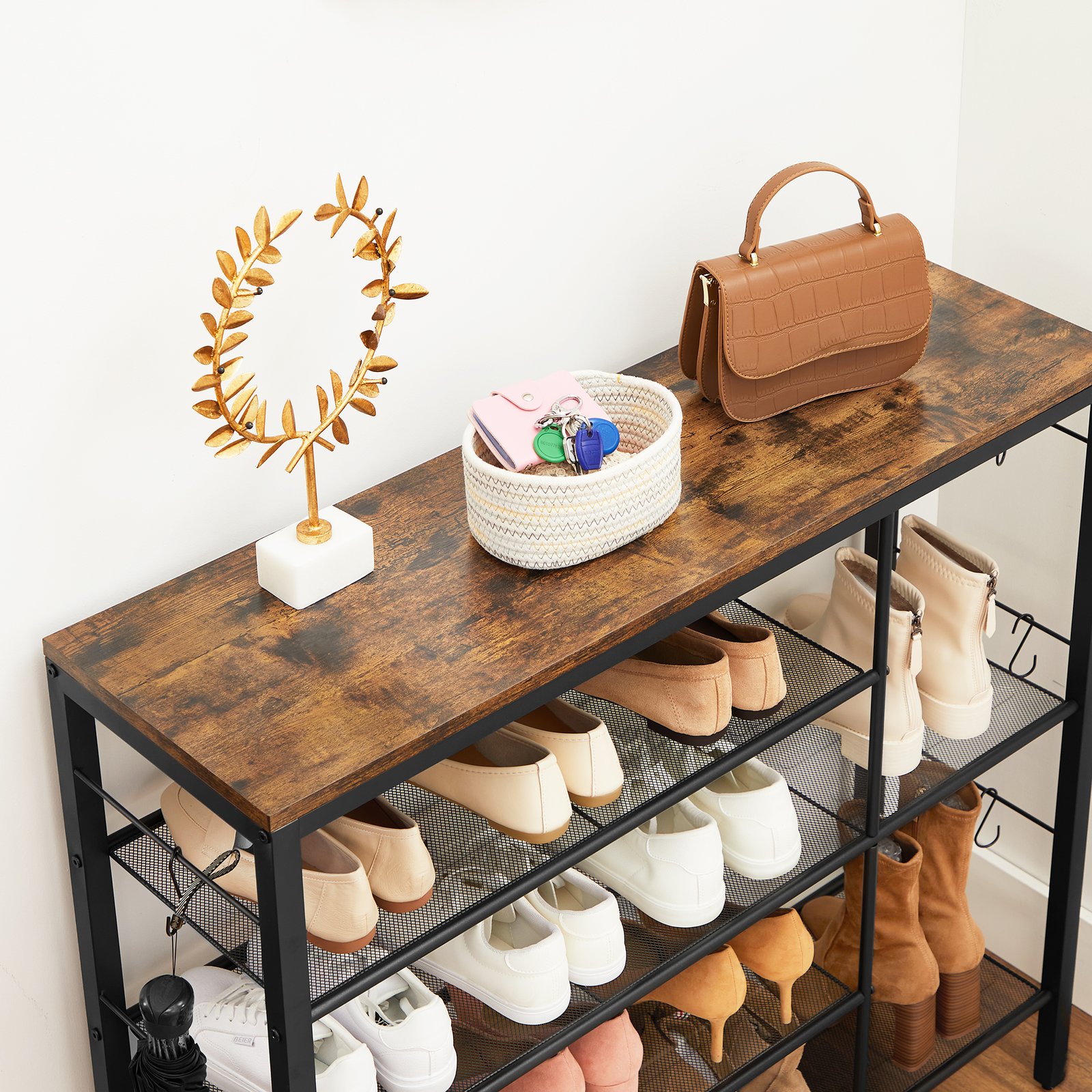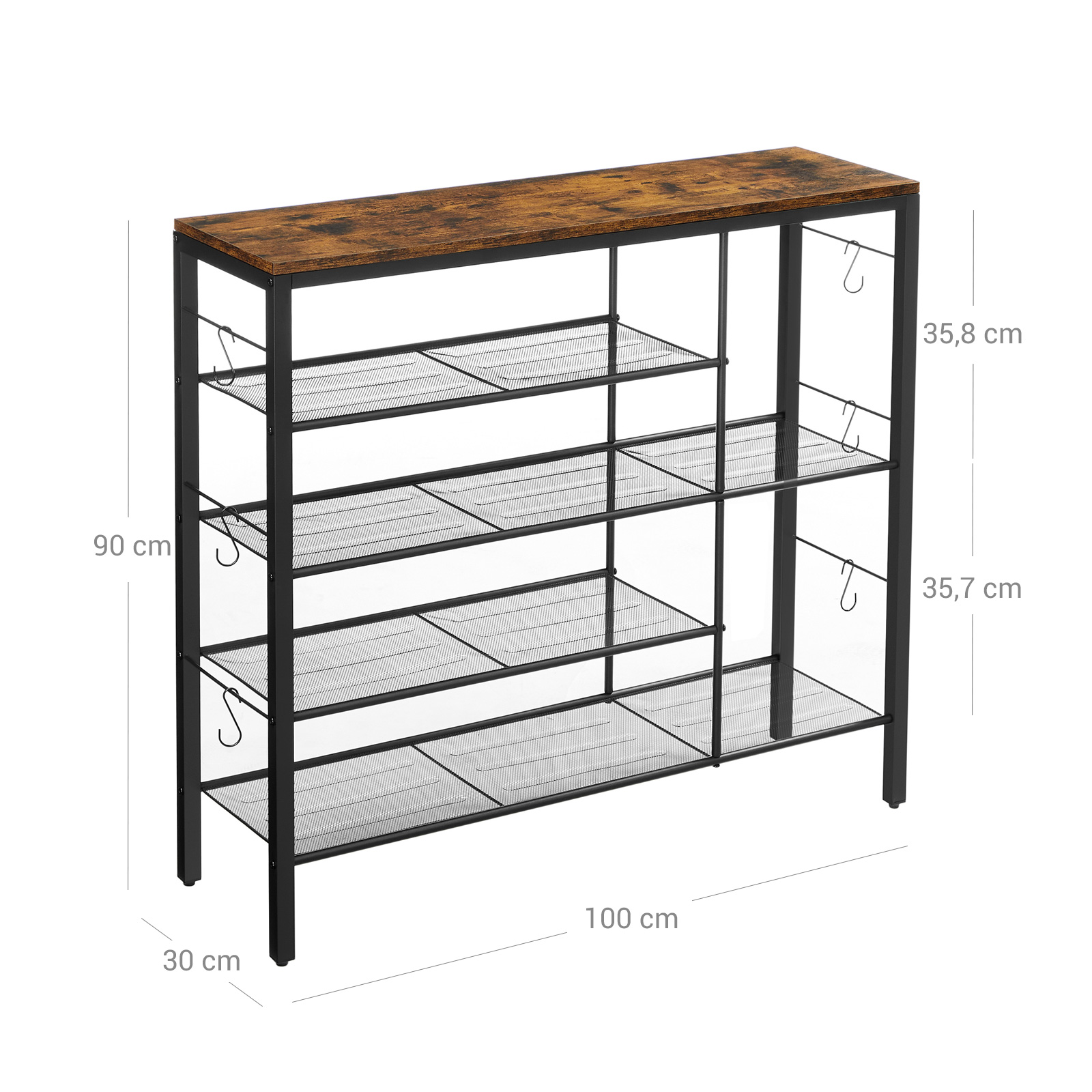 Product details: – Color: Vintage brown-black – Material: Chipboard, steel – Size: 100 x 30 x 90 cm (L x W x H) – Weight: 9.1 kg – Max. static load capacity of the surface: 10 kg – Max. static load per grid shelf: 5 kg – Max. total static load capacity: 30 kg Scope of delivery: – 1 x shoe rack – 1 x accessory package – 1 x anti-tip device – 1 x instructions (DE, EN, ES, FR, IT) VASAGLE Notes: – For safety reasons, children are not allowed to climb on or play with the product.- Please secure this product to the wall using the included anti-tip device to ensure safe use. – The maximum static load capacity of the product is 30 kg. Please do not exceed this maximum weight.