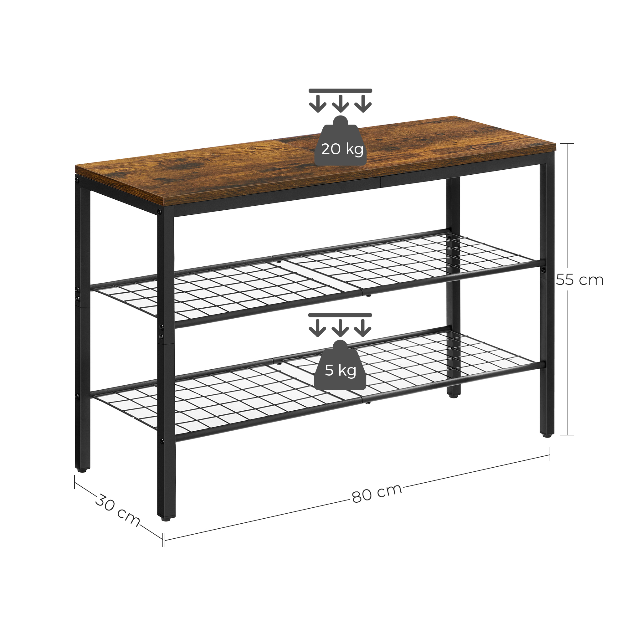 Product details: – Color: Vintage brown-black – Material: Chipboard, steel – Size: 80 x 30 x 55 cm (L x W x H) – Distance between shelves: 18 cm – Weight: 5.9 kg – Max. static load capacity of the surface: 20 kg – Max. static load per wire shelf: 5 kg – Max. total static load capacity: 30 kg Scope of delivery: – 1 x shoe rack – 1 x accessory pack – 1 x instructions VASAGLE notes: – For safety reasons, children are not allowed to climb on or play with the product. – The maximum static load capacity of the product is 30 kg. Please do not exceed this maximum weight.