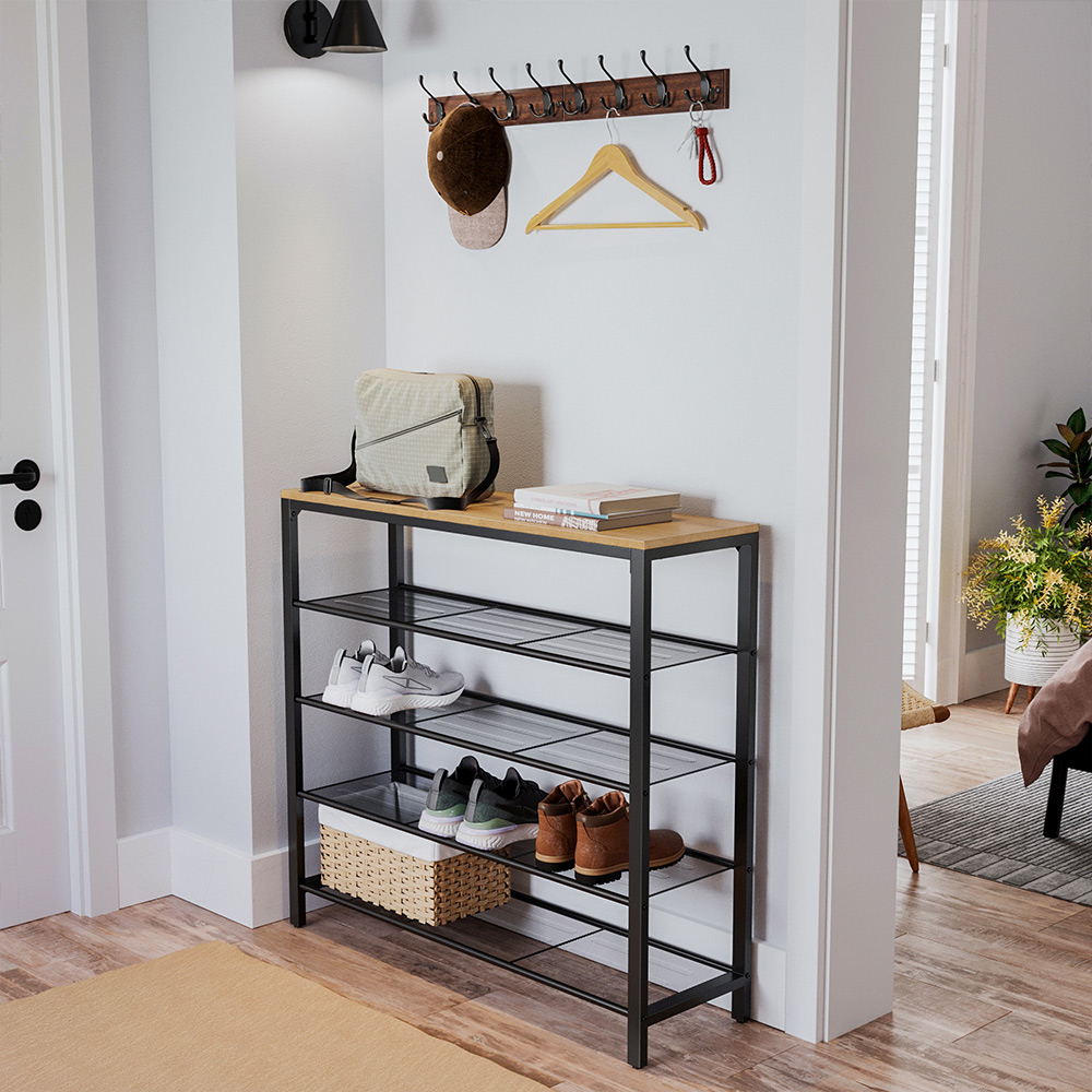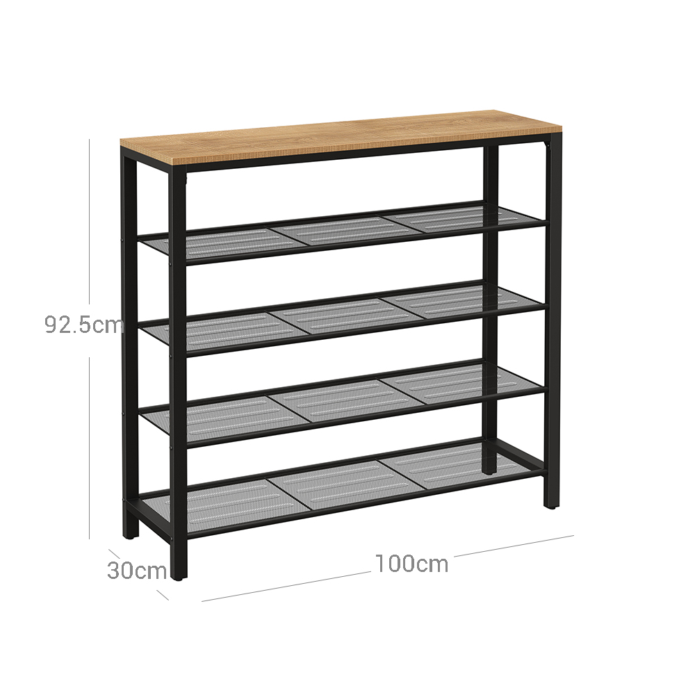 Product details: – Color: Honey brown-black – Material: Chipboard, steel – Size: 100 x 30 x 92.5 cm (L x W x H) – Weight: 10.6 kg – Max. static load capacity of the surface: 10 kg – Max. static load capacity per mesh shelf: 5 kg Scope of delivery:- 1 x shoe rack – 1 x accessory pack – 1 x instructions (DE, EN, ES, FR, IT) VASAGLE notes: – Please position the product so that it is not exposed to heat sources, direct sunlight, or moisture. – Children are not allowed to climb on the product.