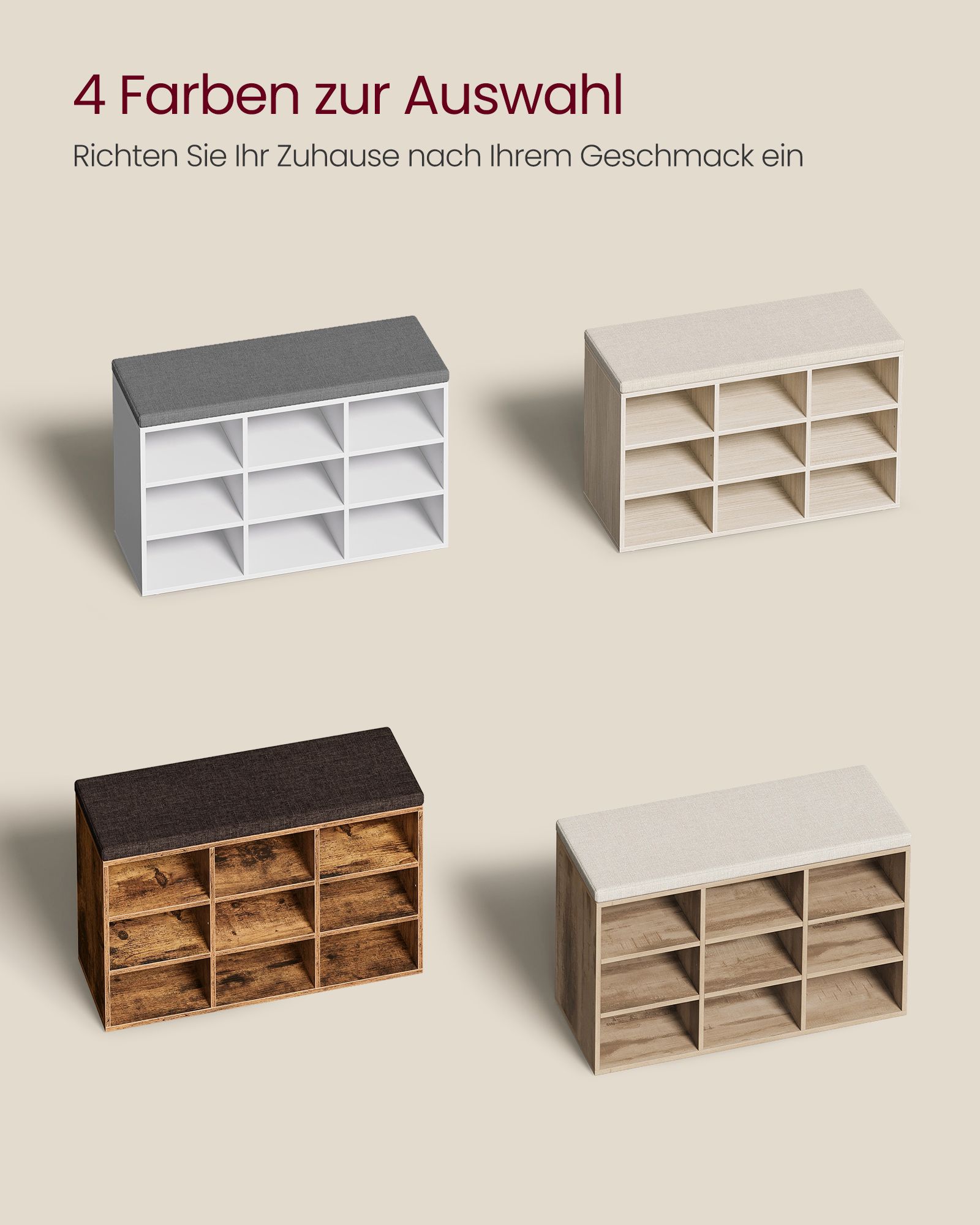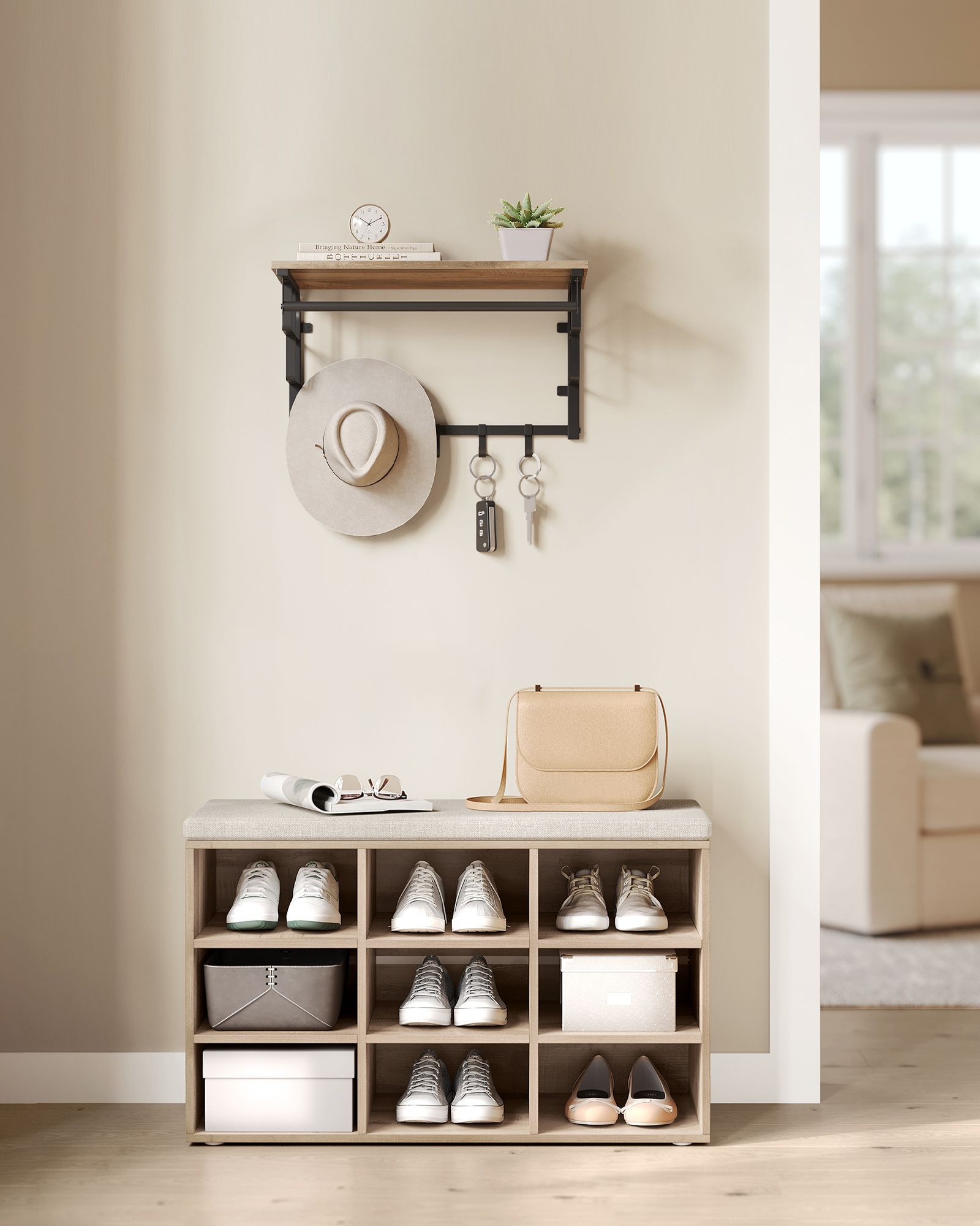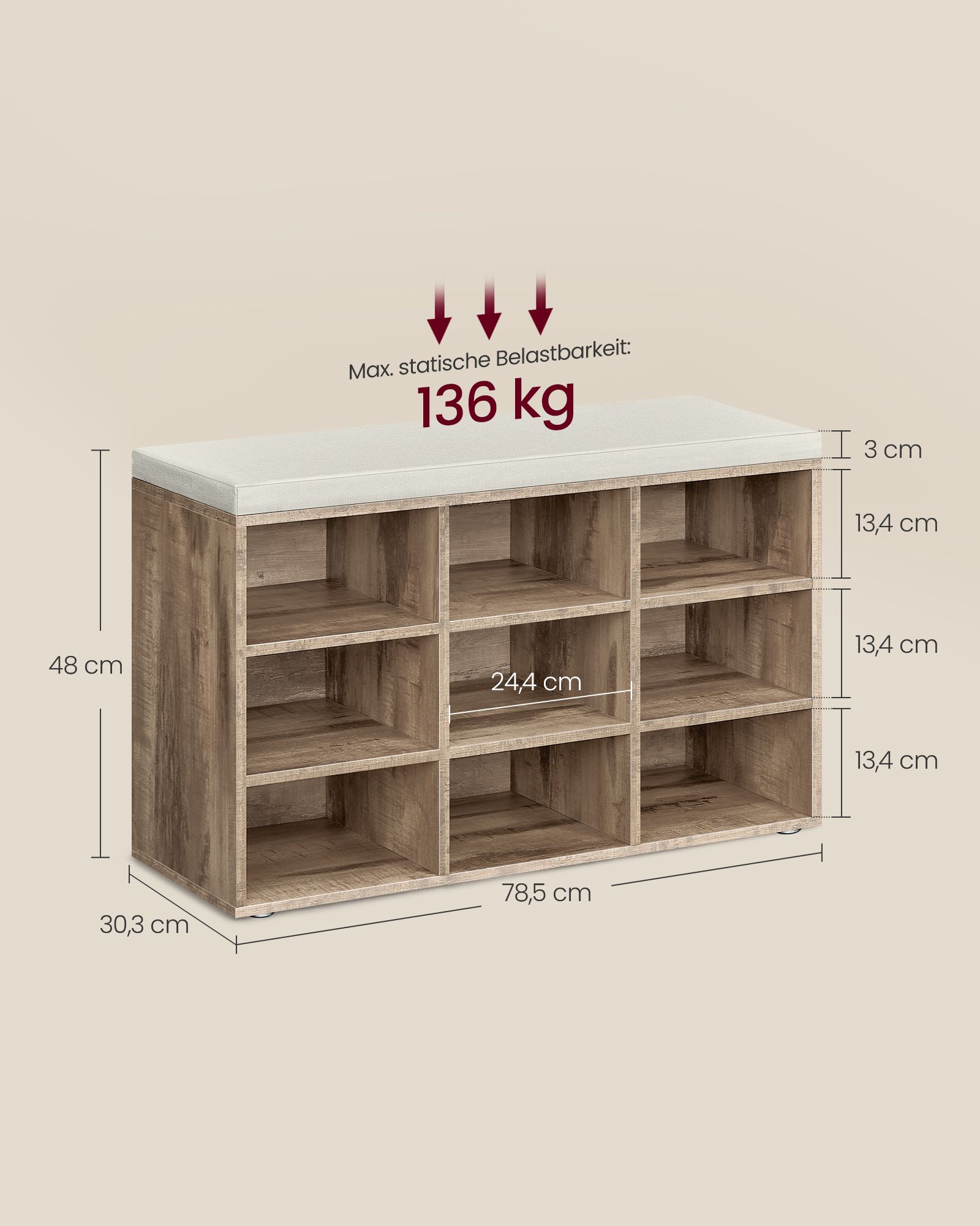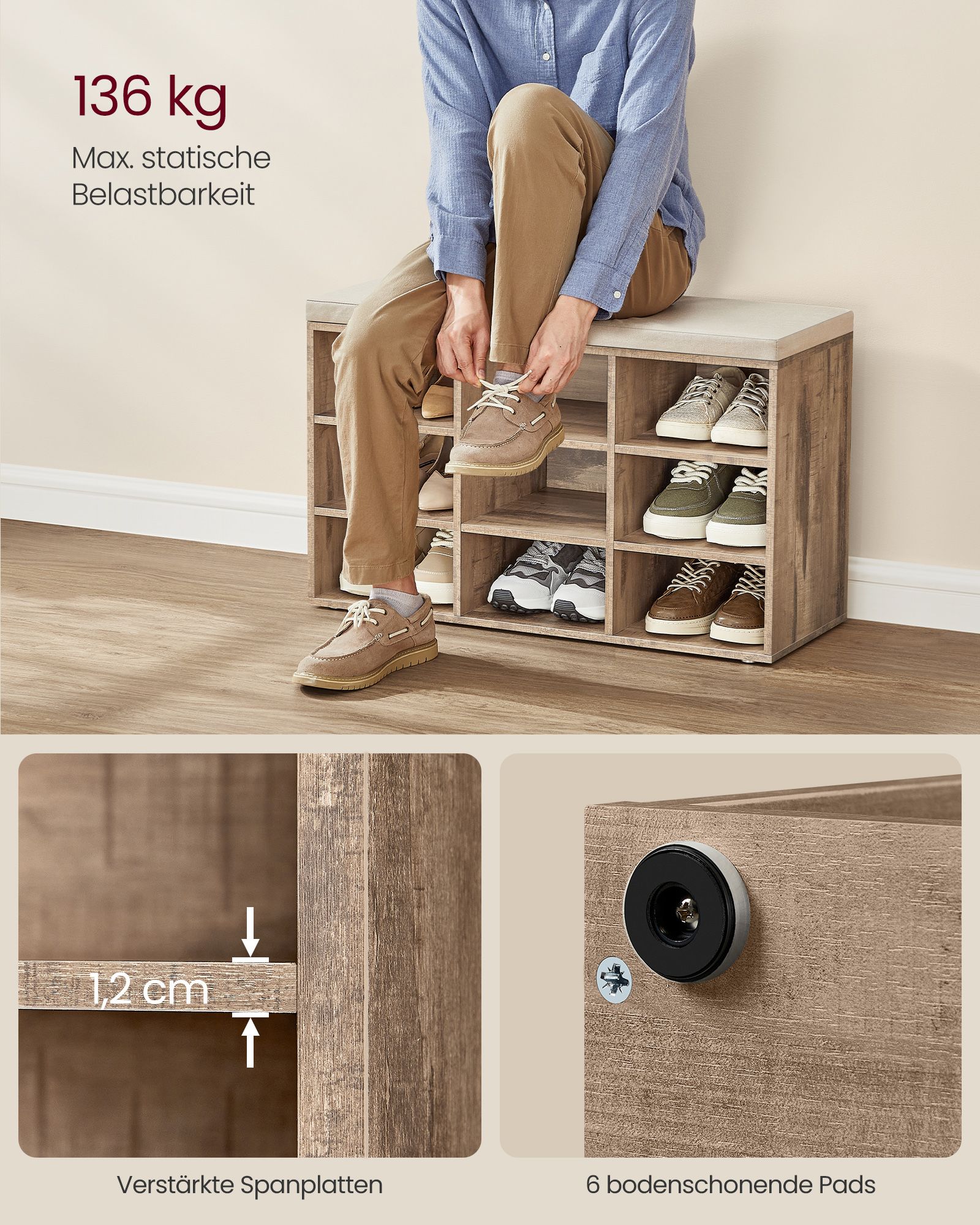 VASAGLE shoe bench, shoe rack with seat, bench with storage space, cushion, 9 compartments, adjustable shelves, for living room, hallway, 30.3 x 78.5 x 48 cm, vintage brown LHS009B01