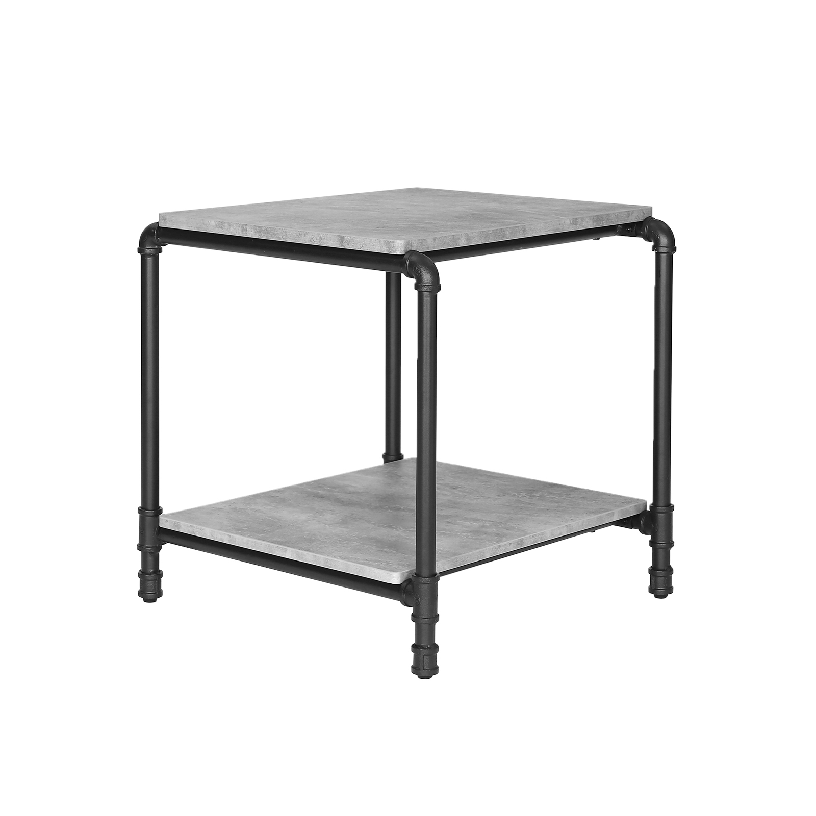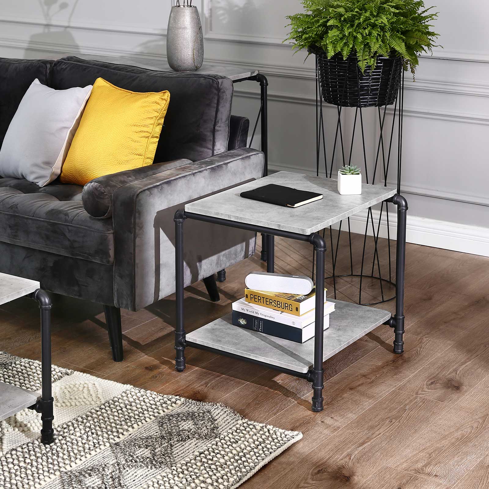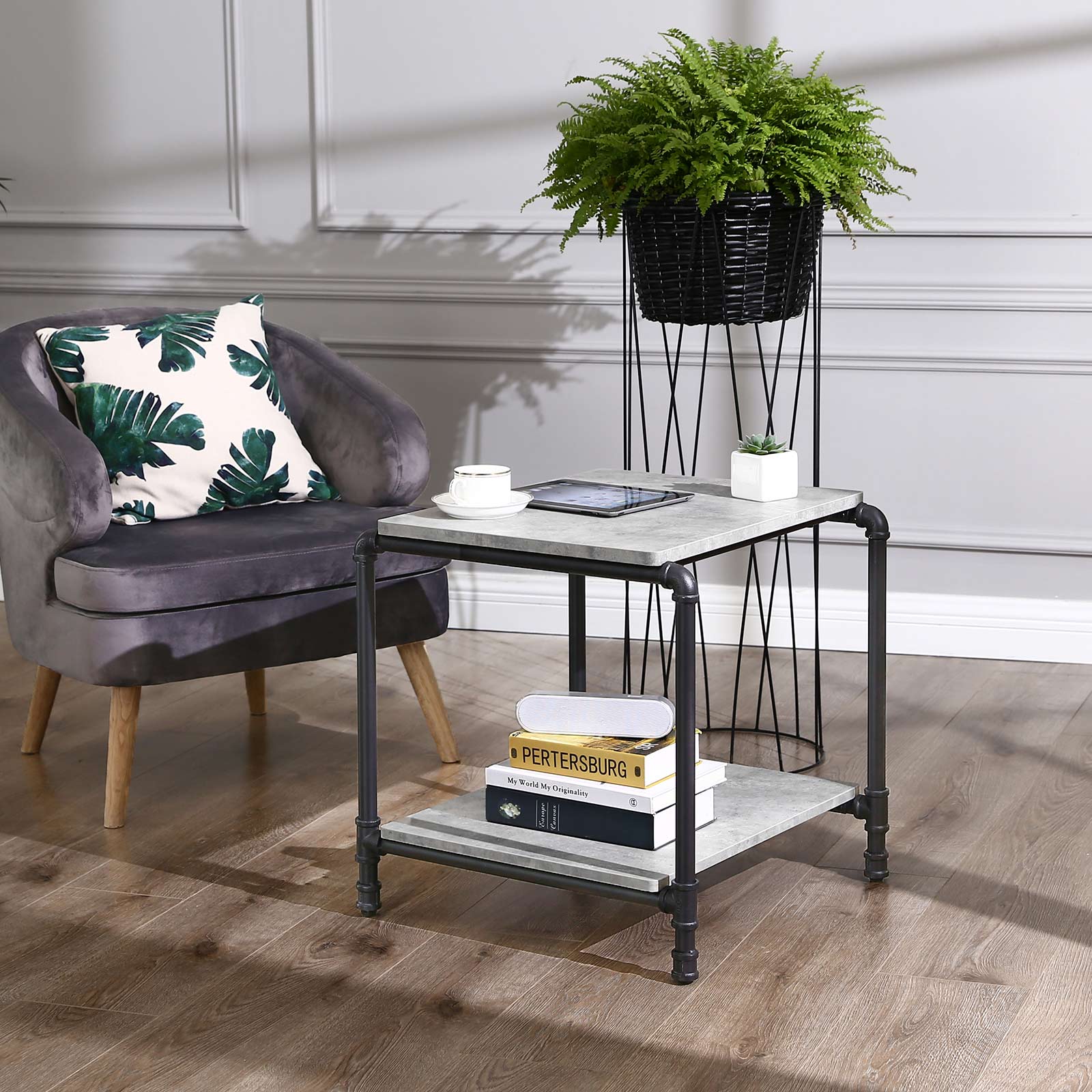 Modern industrial styleExposed brick, concrete, metal, rustic wood—all these features are indicative of the trendy industrial style. With its imitation concrete shelves and sturdy iron tube legs, this side table is therefore ideal as a piece of furniture for “factory chic” apartments.Why this side table is ideal for you: Real concrete is susceptible to stains and cracks and can break easily. The material is also not exactly lightweight. We therefore opted for a concrete-look wood-based material that is every bit as good as the original. The stylish iron tube frame gives the coffee table an extra touch of industrial flair to round off the look.- Although the side table looks particularly good next to your sofa, you can use it anywhere: in the bedroom as a bedside table, in the office for books, or even as a small coffee table in the living room. – Thanks to the detailed instructions, numbered parts, and adjustable feet, you get a comfortable piece of furniture that you can order with confidence. Product details:- Color: Concrete gray – Material: Chipboard, iron frame – Size: 55 x 55 x 55 cm (L x W x H) – Weight: 14 kg – Max. static load capacity: 50 kg Scope of delivery:- 1 x side table – 1 x container with accessories – 1 x instructions (DE, EN, FR, ES, IT) VASAGLE notes: – Please do not expose the product to direct sunlight and do not use it in a damp environment.