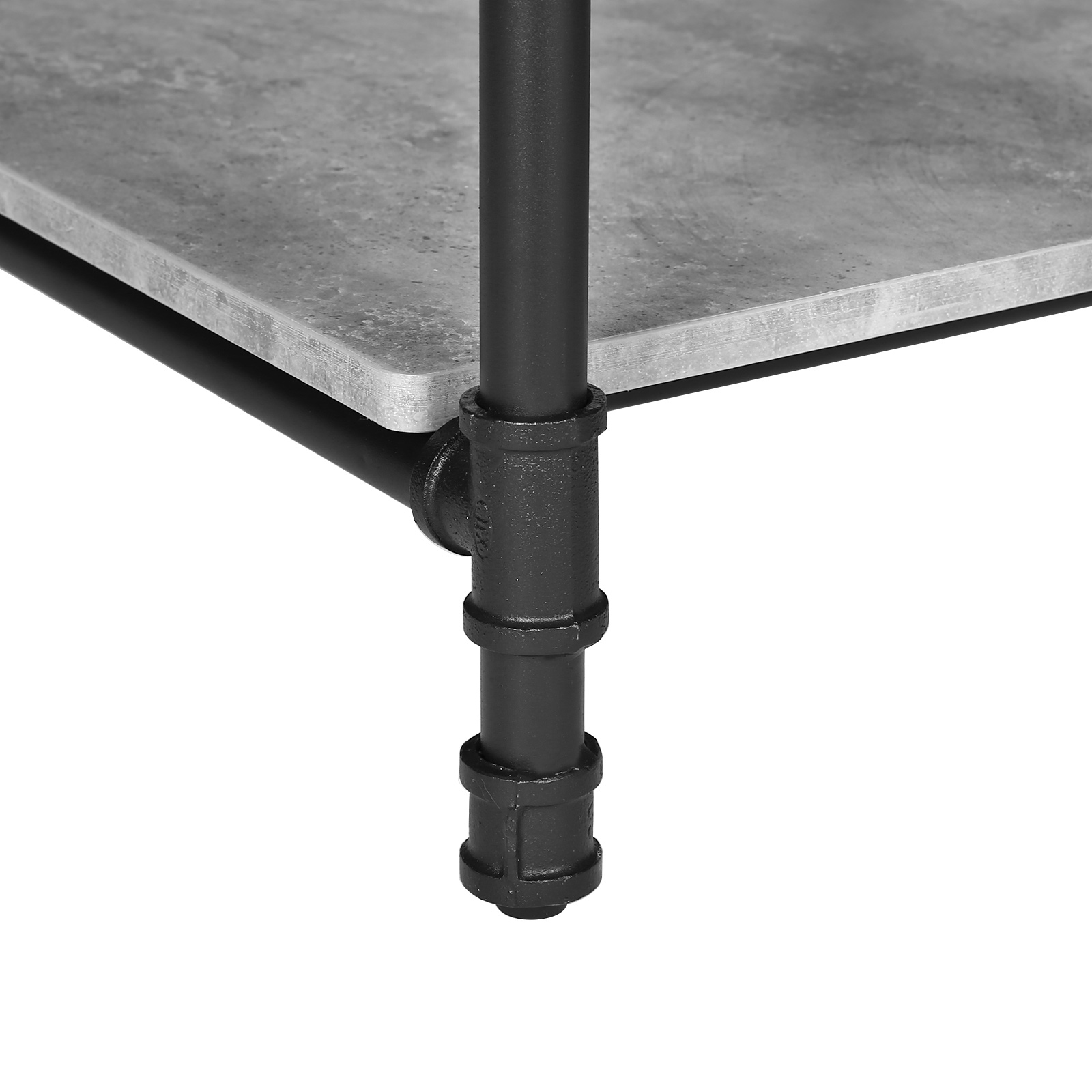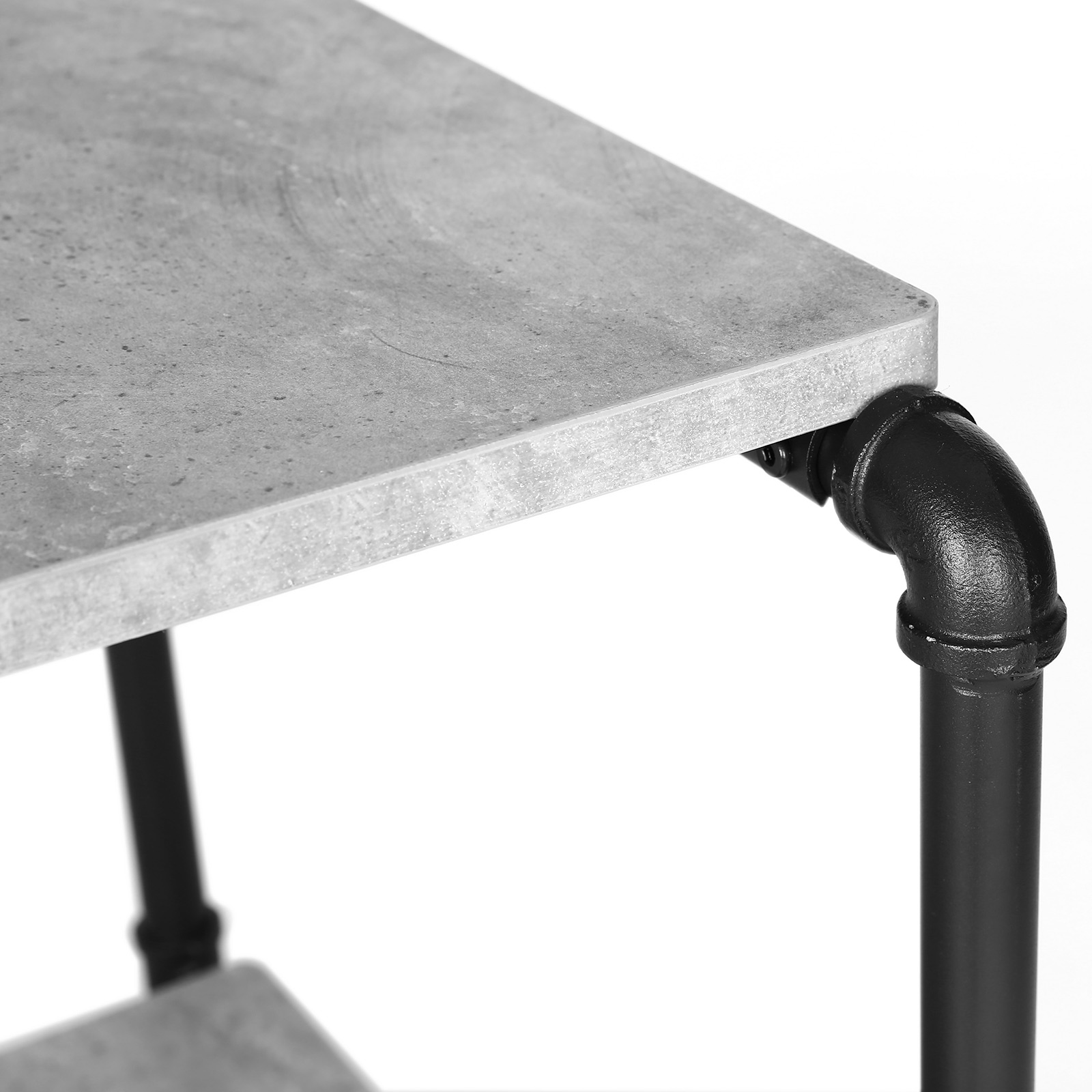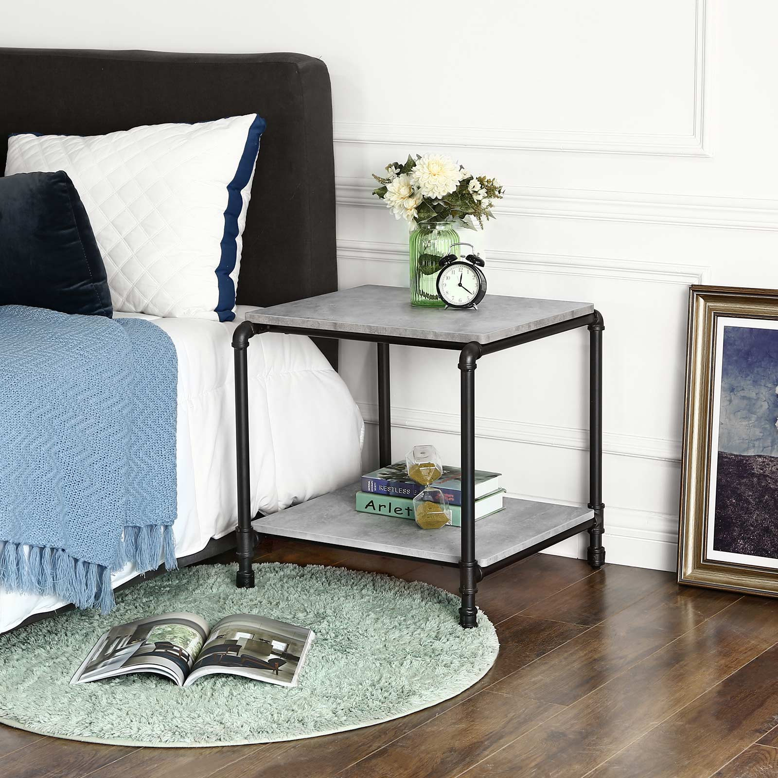 Modern industrial styleExposed brick, concrete, metal, rustic wood—all these features are indicative of the trendy industrial style. With its imitation concrete shelves and sturdy iron tube legs, this side table is therefore ideal as a piece of furniture for “factory chic” apartments.Why this side table is ideal for you: Real concrete is susceptible to stains and cracks and can break easily. The material is also not exactly lightweight. We therefore opted for a concrete-look wood-based material that is every bit as good as the original. The stylish iron tube frame gives the coffee table an extra touch of industrial flair to round off the look.- Although the side table looks particularly good next to your sofa, you can use it anywhere: in the bedroom as a bedside table, in the office for books, or even as a small coffee table in the living room. – Thanks to the detailed instructions, numbered parts, and adjustable feet, you get a comfortable piece of furniture that you can order with confidence. Product details:- Color: Concrete gray – Material: Chipboard, iron frame – Size: 55 x 55 x 55 cm (L x W x H) – Weight: 14 kg – Max. static load capacity: 50 kg Scope of delivery:- 1 x side table – 1 x container with accessories – 1 x instructions (DE, EN, FR, ES, IT) VASAGLE notes: – Please do not expose the product to direct sunlight and do not use it in a damp environment.