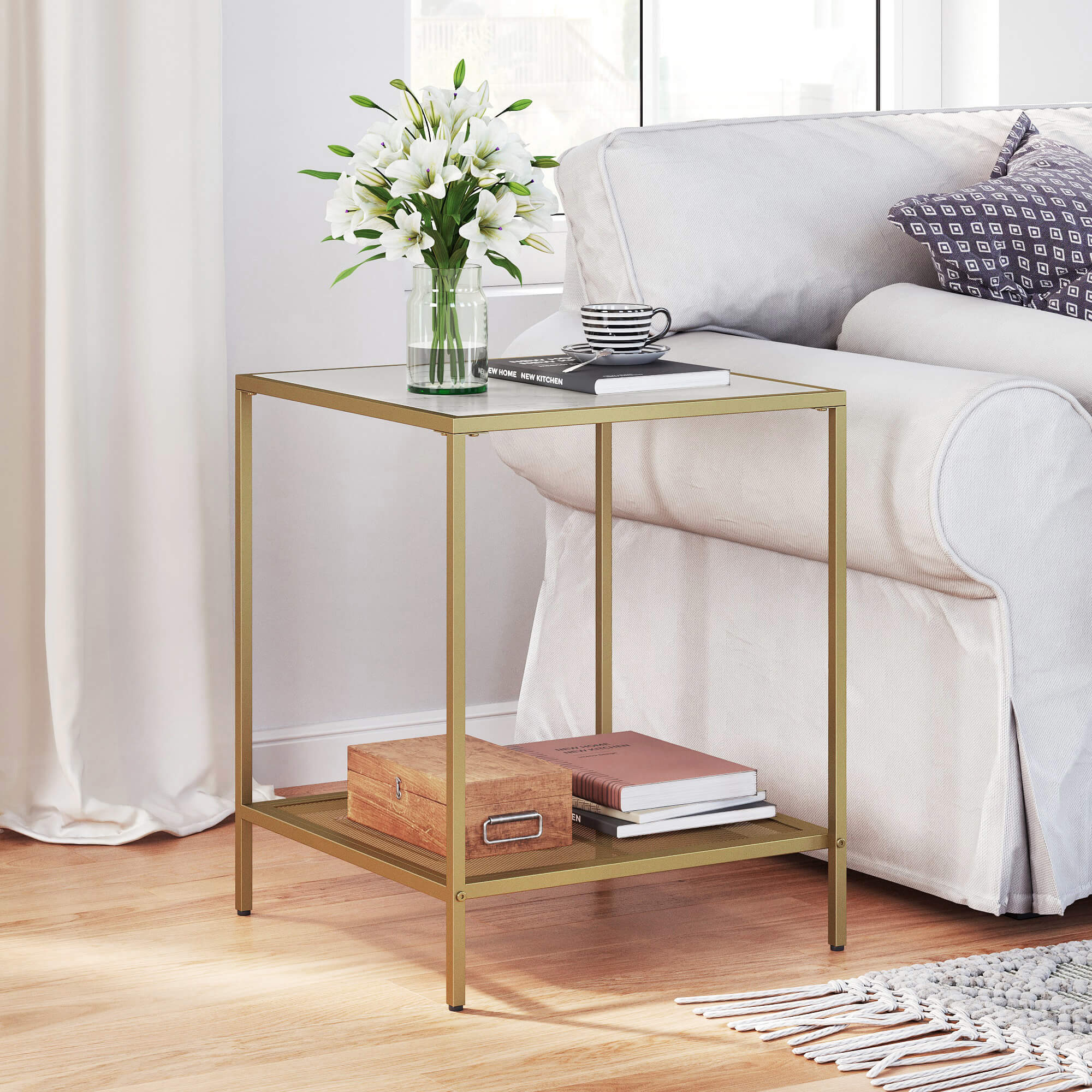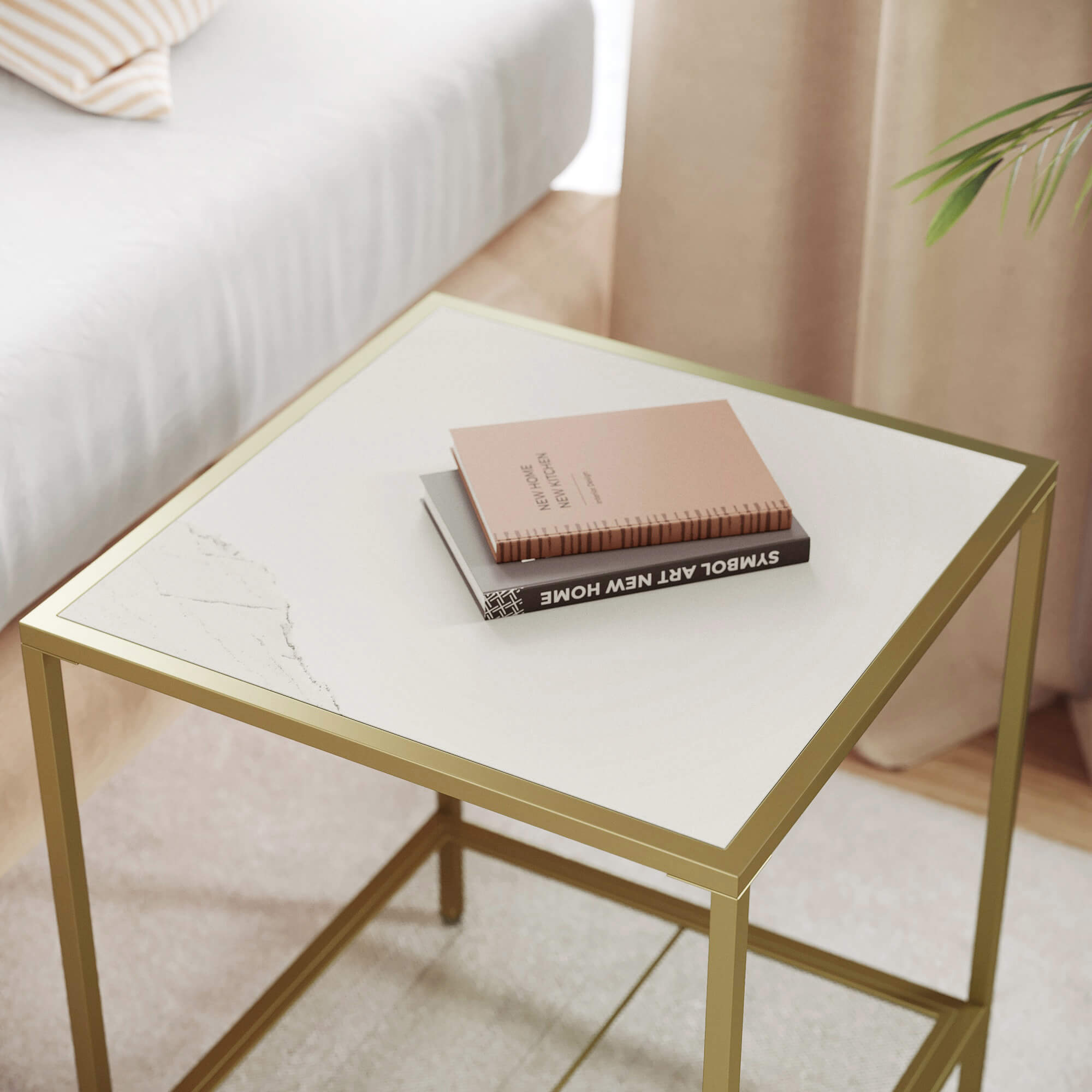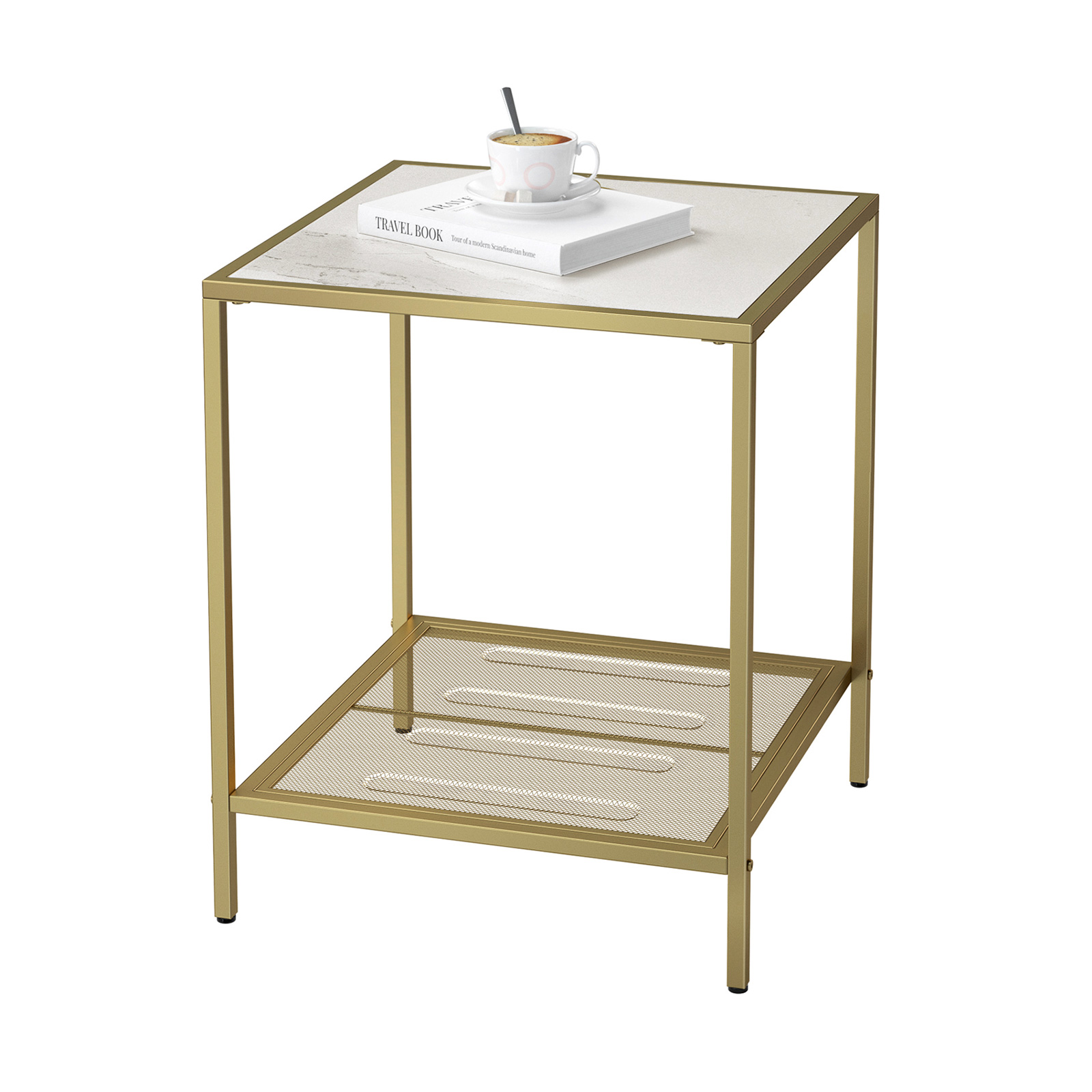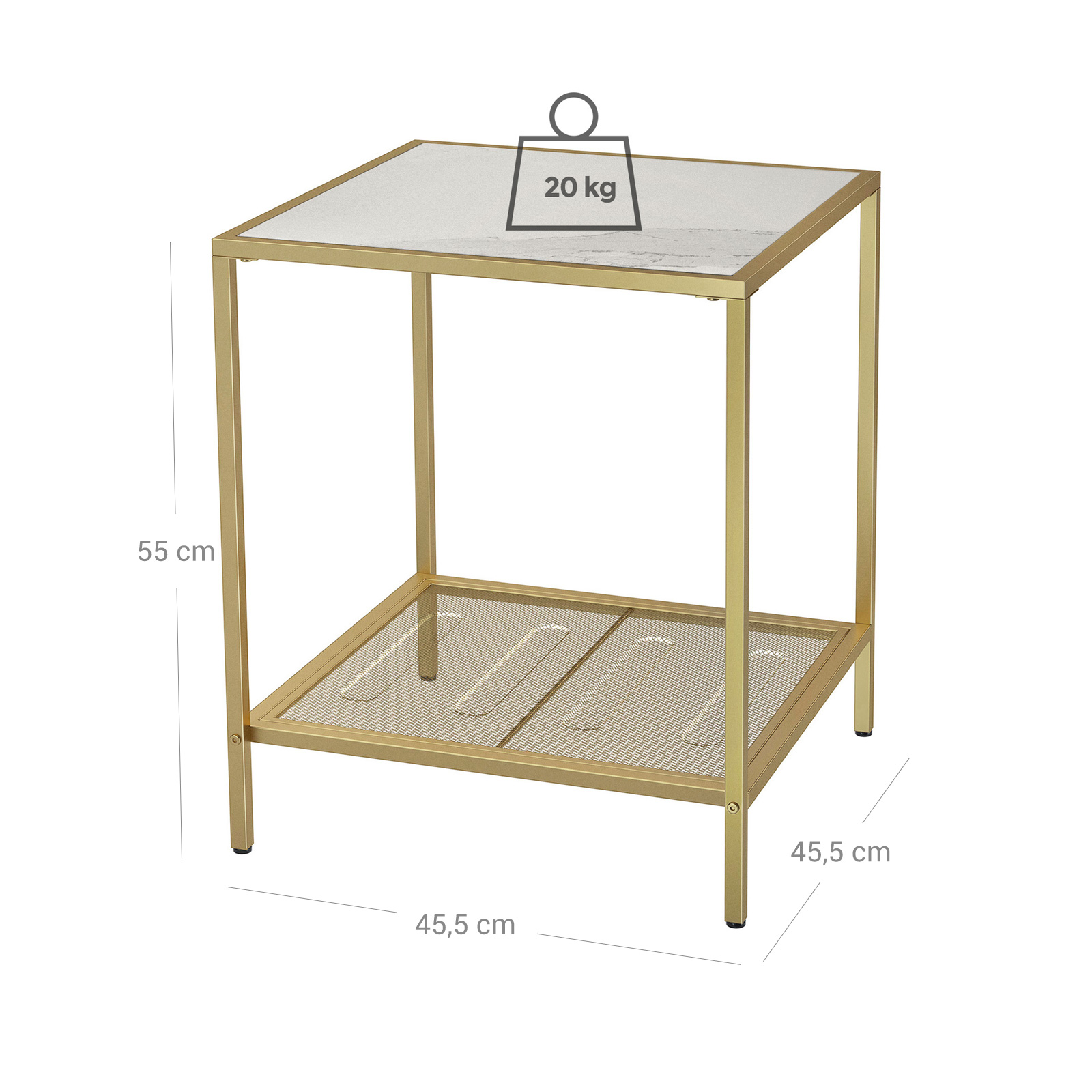 Product details: – Color: Gold marble look – Material: Steel, tempered glass – Size: 45.5 x 45.5 x 55 cm (L x W x H) – Weight: 4.7 kg – Max. static load capacity per level: 20 kg Scope of delivery:- 1 x side table – 1 x accessory pack – 1 x instructions (DE, EN, FR, IT, ES) VASAGLE notes: – For safety reasons, children are not allowed to climb on or play with the product.