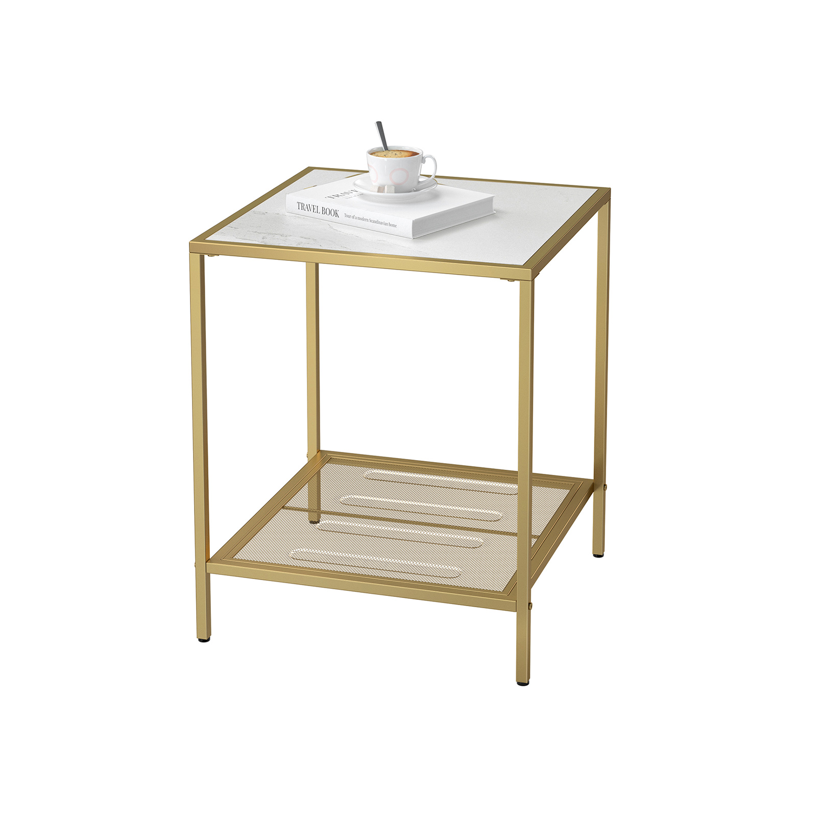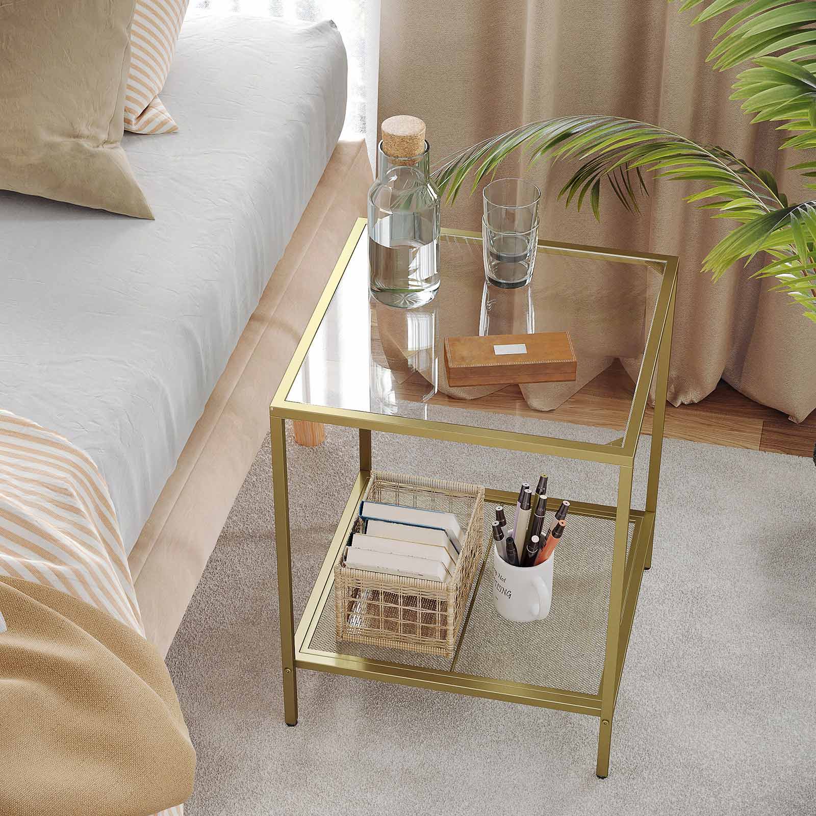 Product details: – Color: Gold-Transparent – Material: Steel, tempered glass – Size: 45.5 x 45.5 x 55 cm (L x W x H) – Weight: 5.2 kg – Max. static load capacity per level: 20 kg Scope of delivery:- 1 x side table – 1 x accessory pack – 1 x instructions (DE, EN, FR, IT, ES) VASAGLE notes: – For safety reasons, children are not allowed to climb on or play with the product.