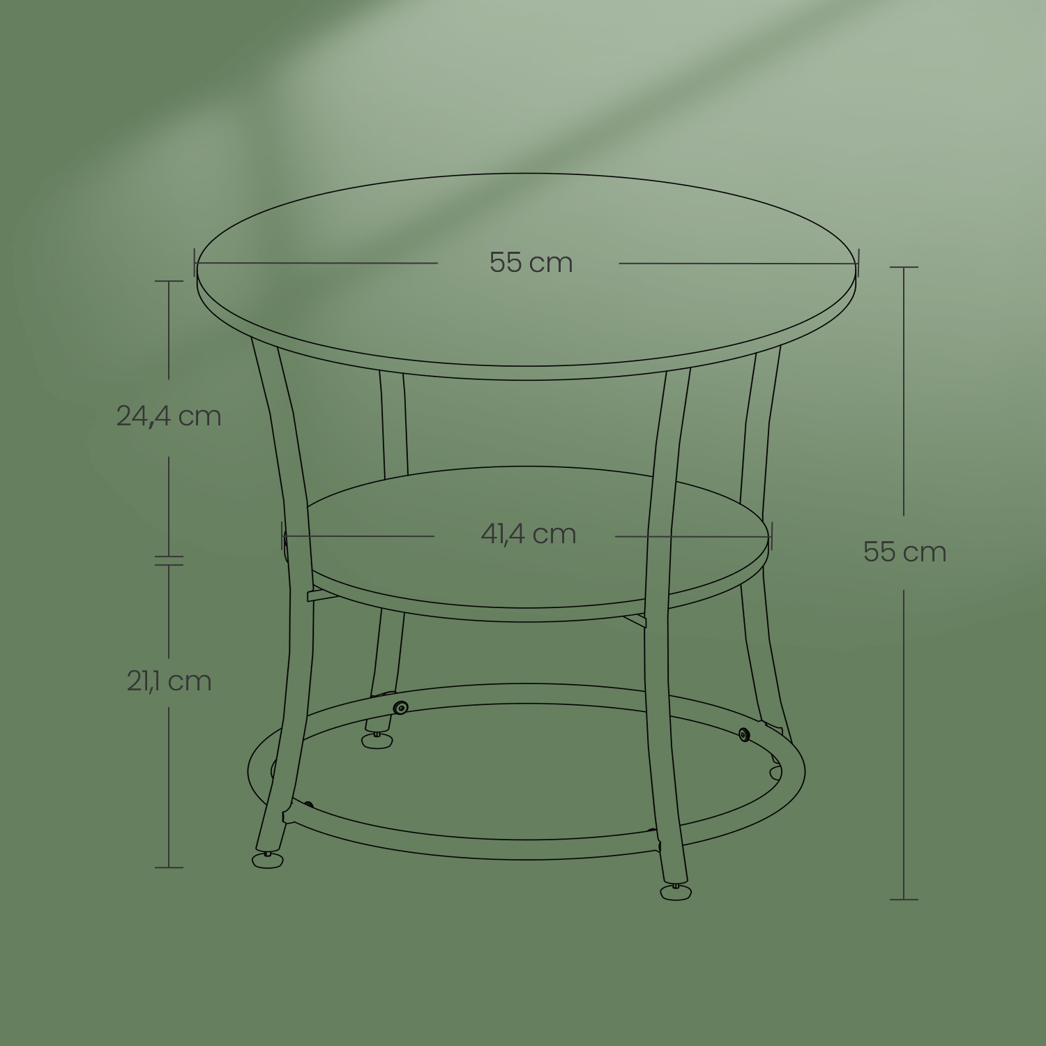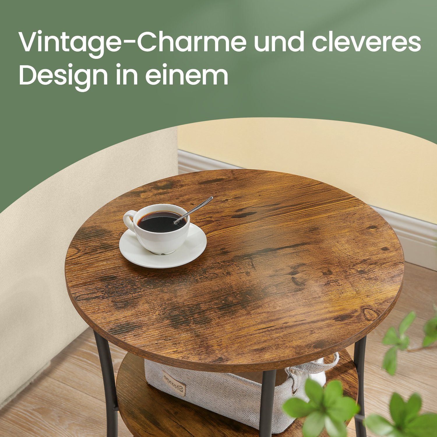 Product details: – Color: vintage/dark brown – Material: chipboard, steel – Size: 55 x 55 cm (Ø x H) – Weight: 6.1 kg – Max. static load capacity top shelf: 30 kg – Max. static load capacity bottom shelf: 10 kg Scope of delivery:- 1 x round side table – 1 x accessory bag – 1 x instructions (DE, EN, ES, FR, IT) VASAGLE notes: – The product is designed for indoor use only. Please place it in a dry environment. – Please do not place any objects on the product that exceed the maximum static load capacity.