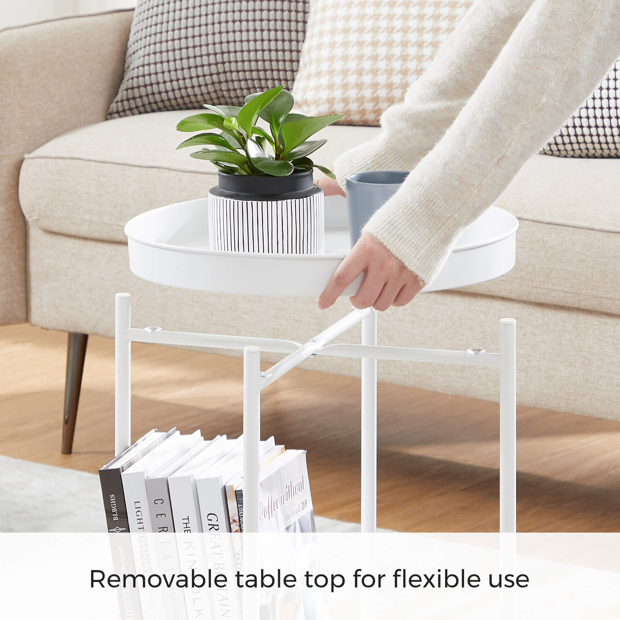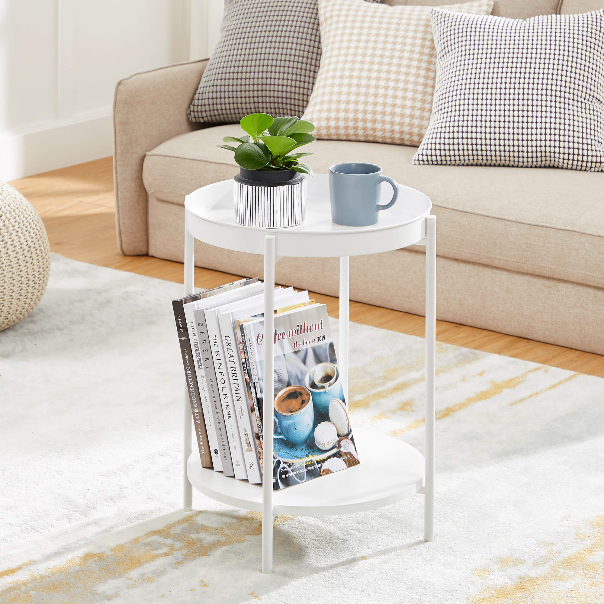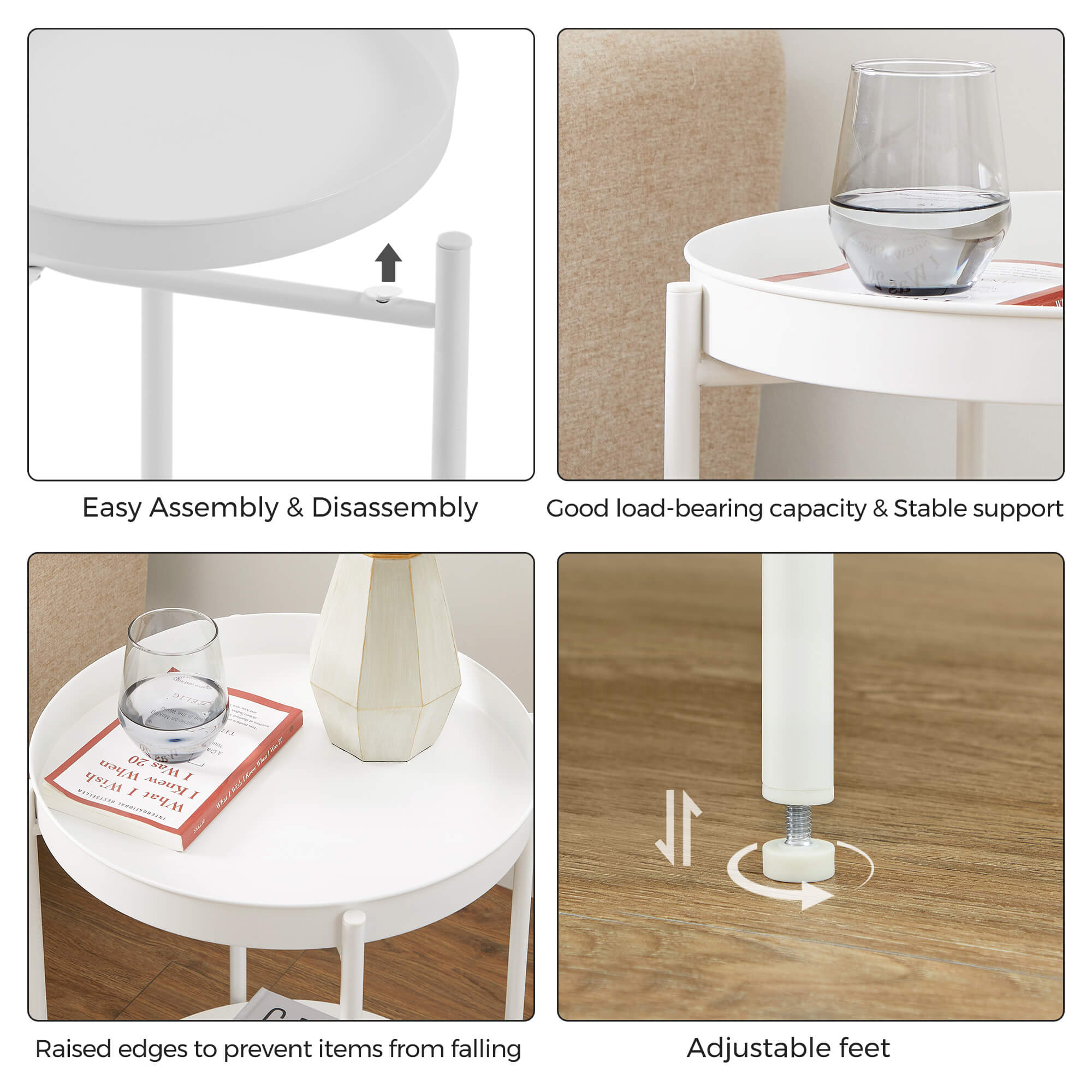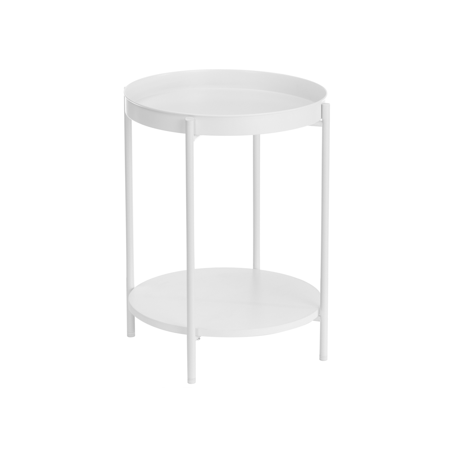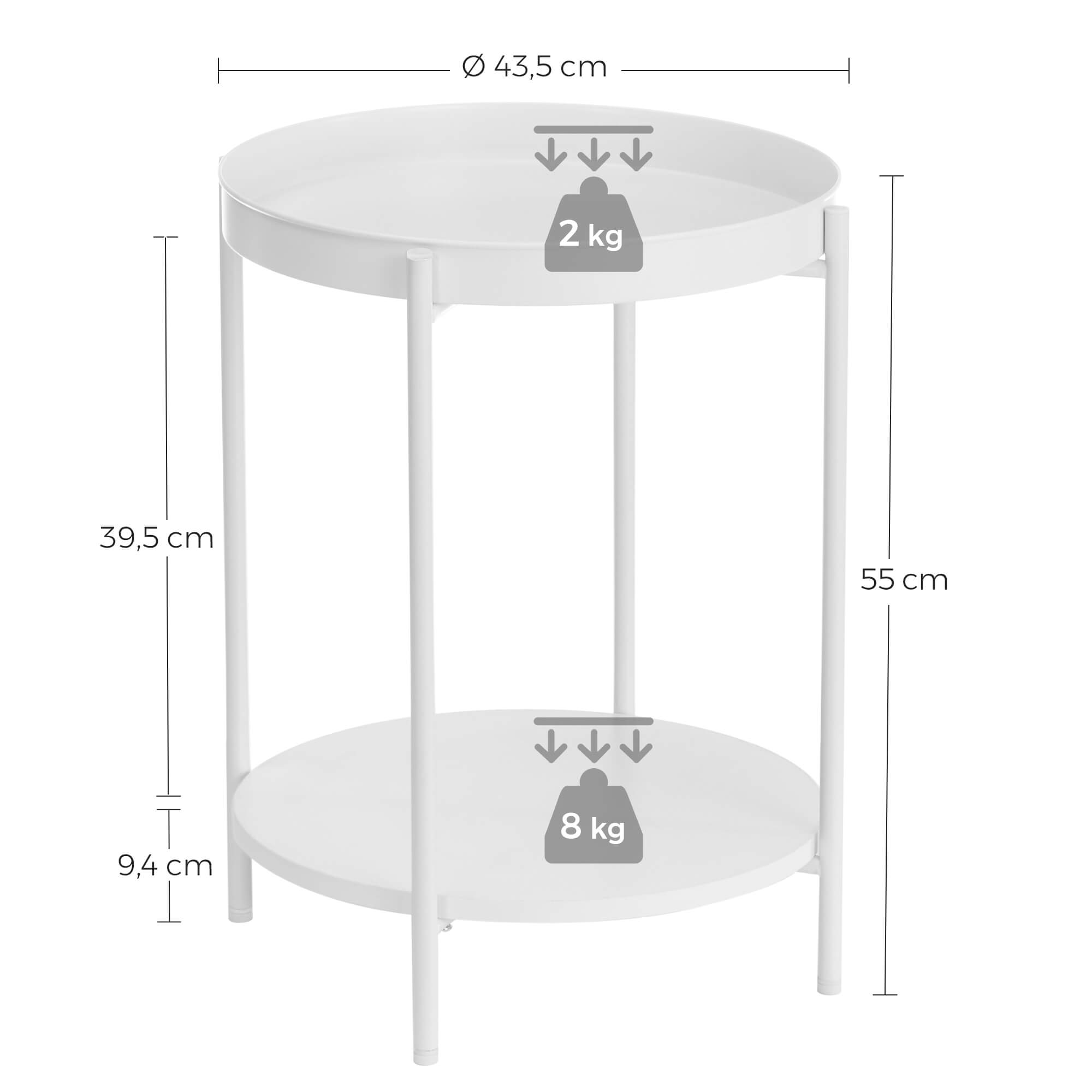 Product details: – Color: White – Material: Chipboard, steel – Size: 43.5 x 55 cm (Ø x H) – Weight: 3.1 kg – Max. static load capacity per level: 10 kg Scope of delivery:- 1 x side table – 1 x accessory package – 1 x instructions (DE, EN, ES, FR, IT) VASAGLE notes: – For safety reasons, children are not allowed to climb on or play with the product.