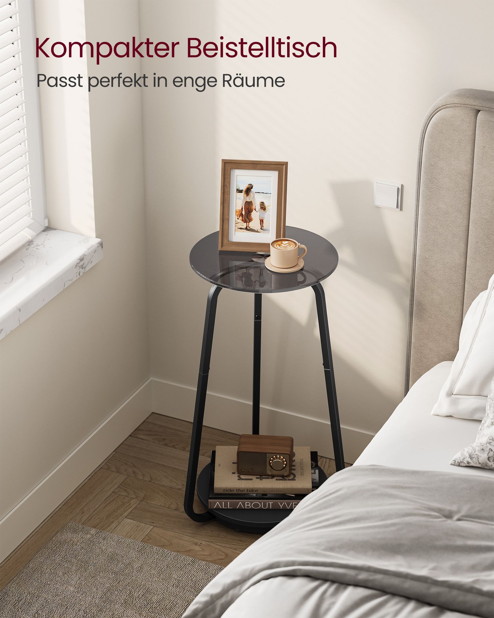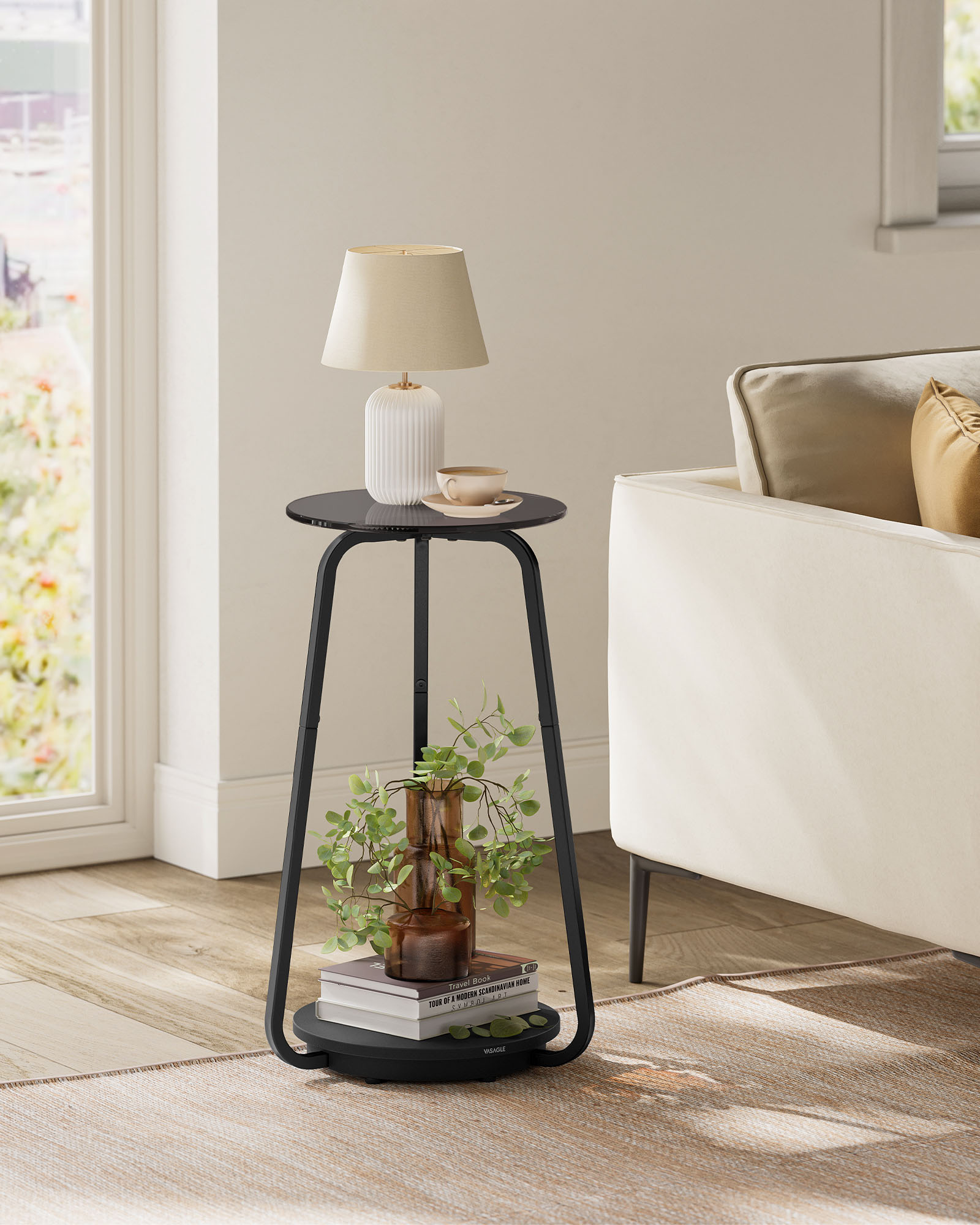 VASAGLE Side table, round, bedside table with 2 levels, coffee table with glass top and chipboard shelf, for living room, bedroom, small rooms, modern, marble white LET287W59