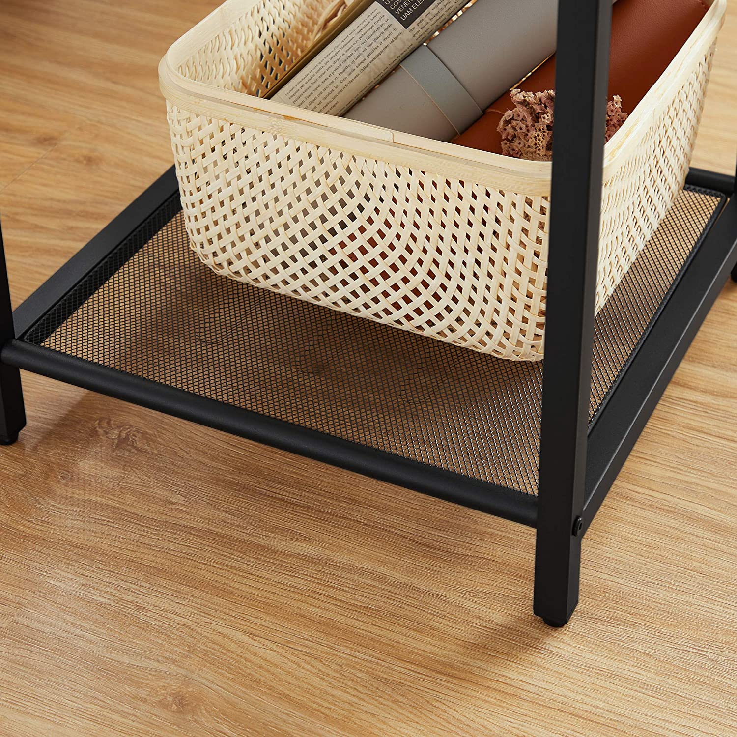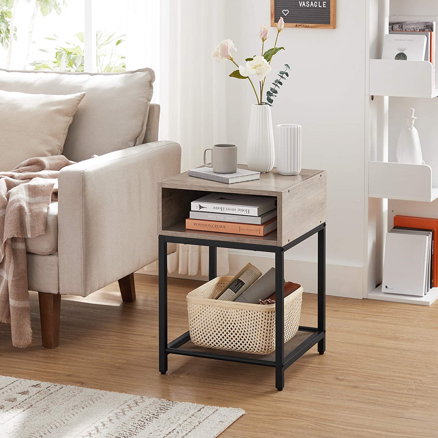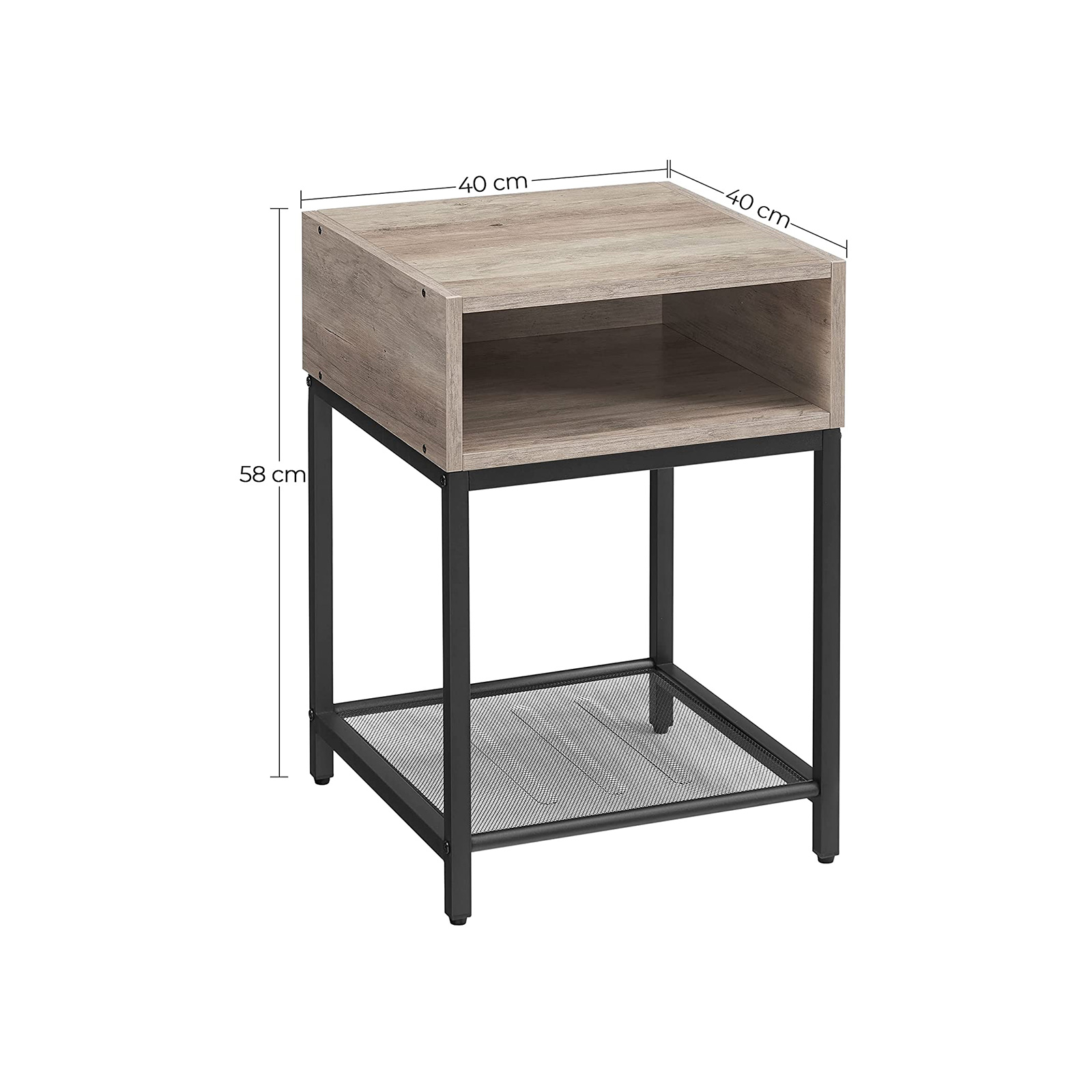 Product details: – Color: Greige-black – Material: Chipboard, steel – Size: 40 x 40 x 58 cm (L x W x H) – Weight: 6.5 kg – Max. static load capacity of the surface: 20 kg – Max. static load capacity of the open compartment: 20 kg – Max. static load capacity of the mesh shelf: 5 kg Scope of delivery:- 1 x side table – 1 x accessory package – 1 x instructions (DE, EN, ES, FR, IT) VASAGLE Notes: – For safety reasons, children are not allowed to climb on or play with the product.