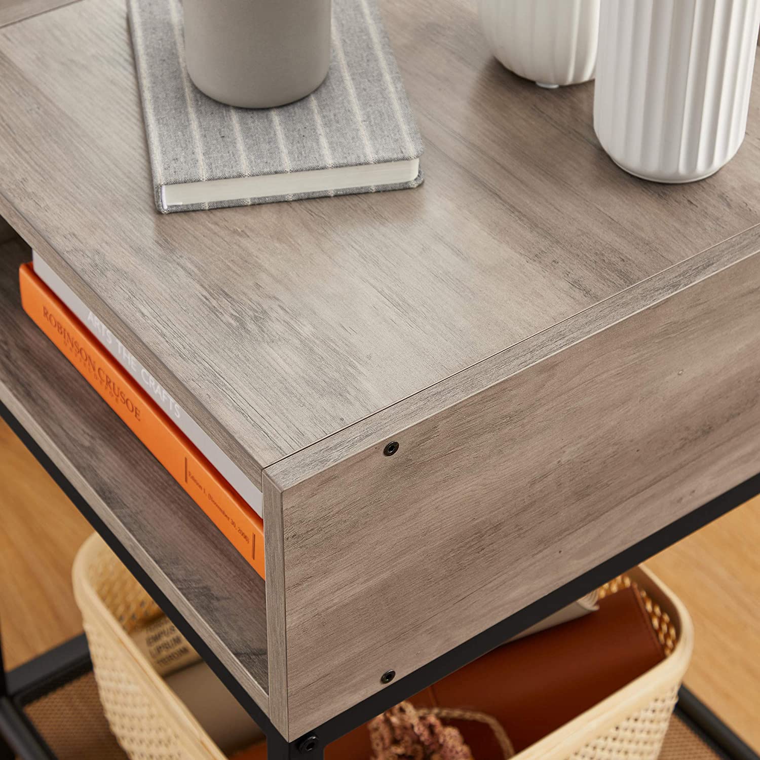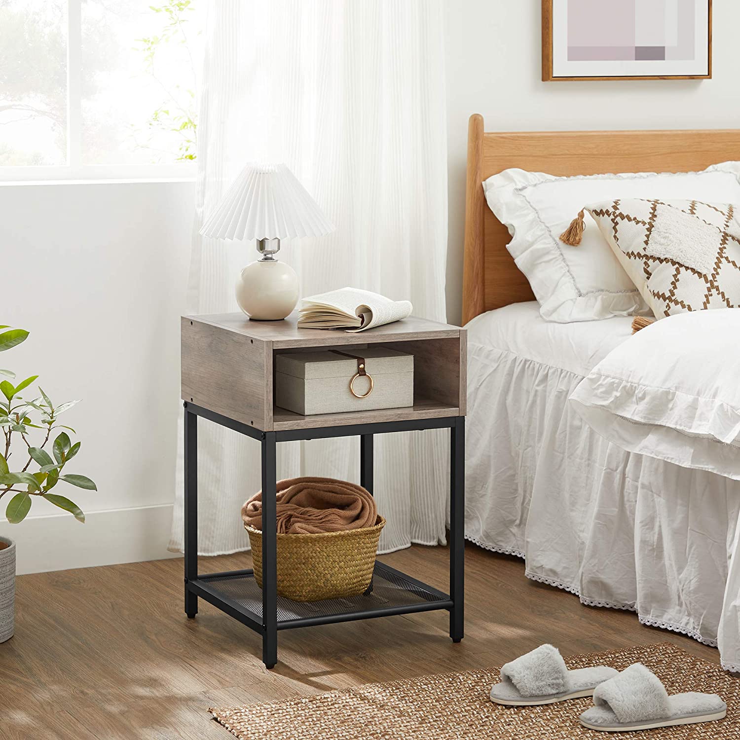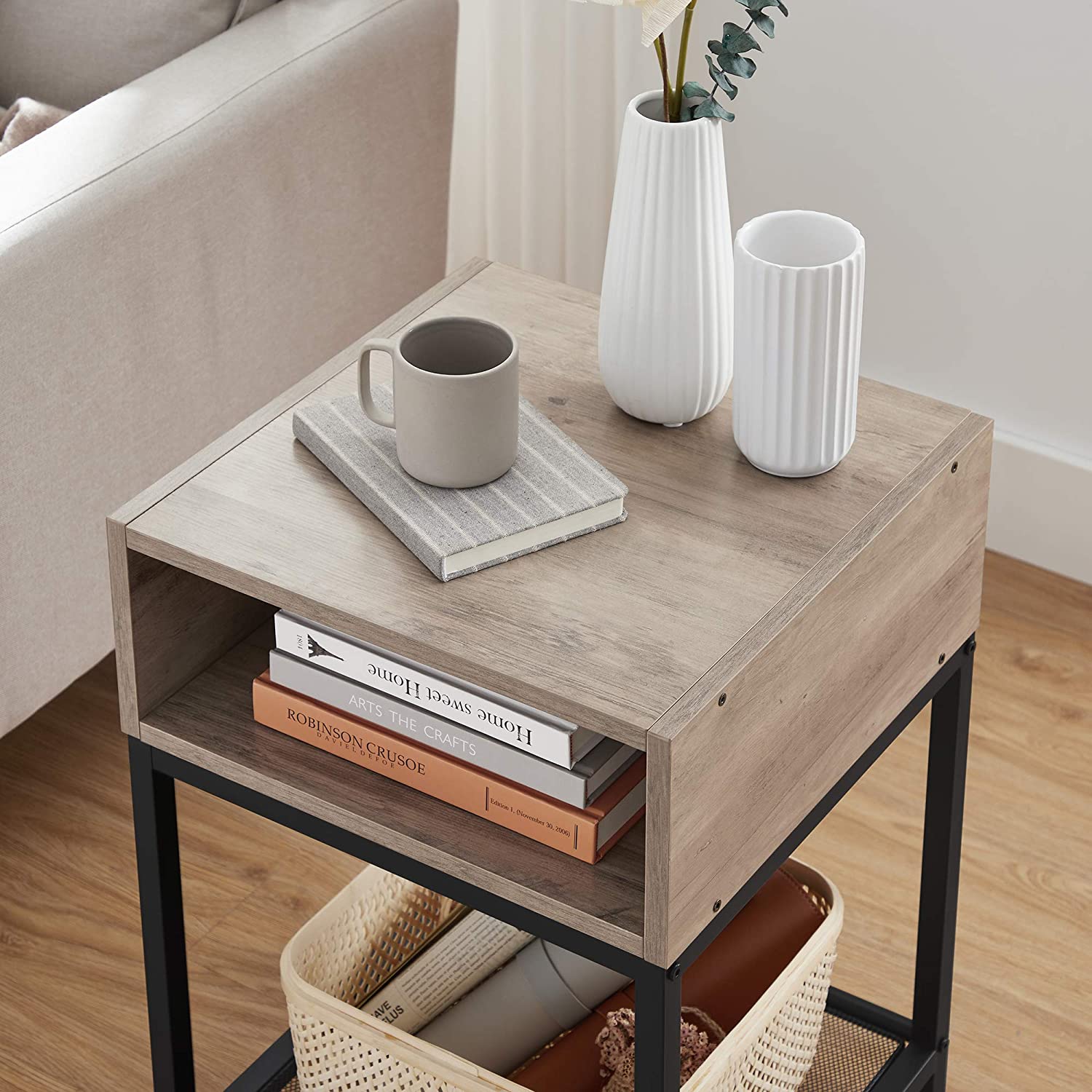 Product details: – Color: Greige-black – Material: Chipboard, steel – Size: 40 x 40 x 58 cm (L x W x H) – Weight: 6.5 kg – Max. static load capacity of the surface: 20 kg – Max. static load capacity of the open compartment: 20 kg – Max. static load capacity of the mesh shelf: 5 kg Scope of delivery:- 1 x side table – 1 x accessory package – 1 x instructions (DE, EN, ES, FR, IT) VASAGLE Notes: – For safety reasons, children are not allowed to climb on or play with the product.