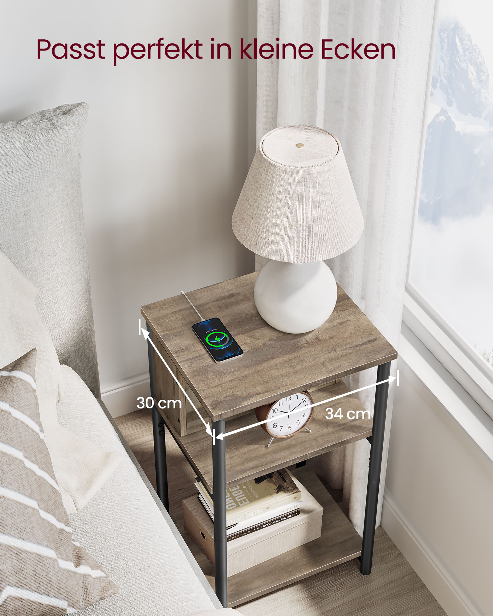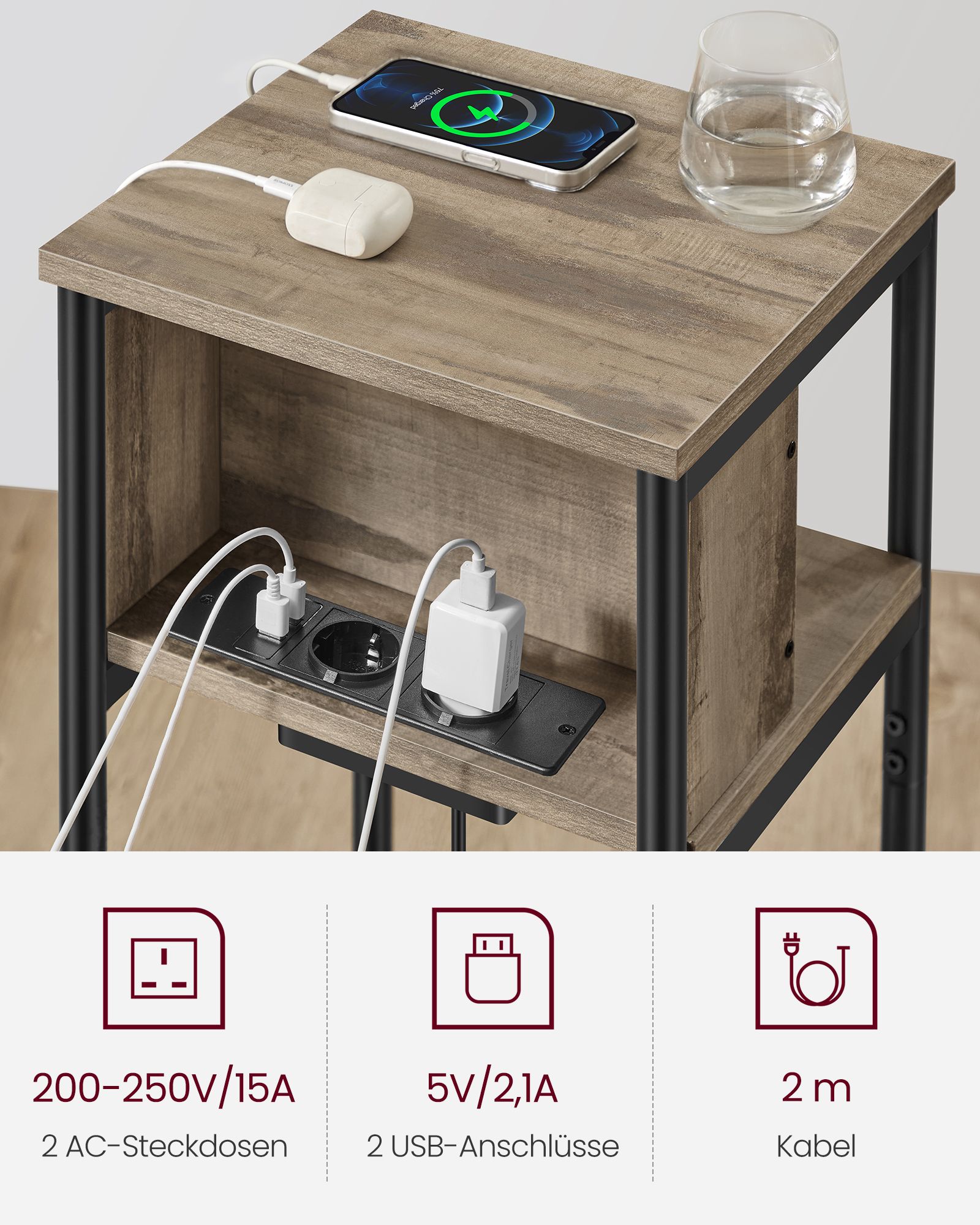 VASAGLE Side Table, Nightstand with Power Outlet, Narrow, 2 AC Outlets, 2 USB Ports, 30 x 34 x 58 cm, for Living Room, Bedroom, Vintage Brown-Black LET375B01