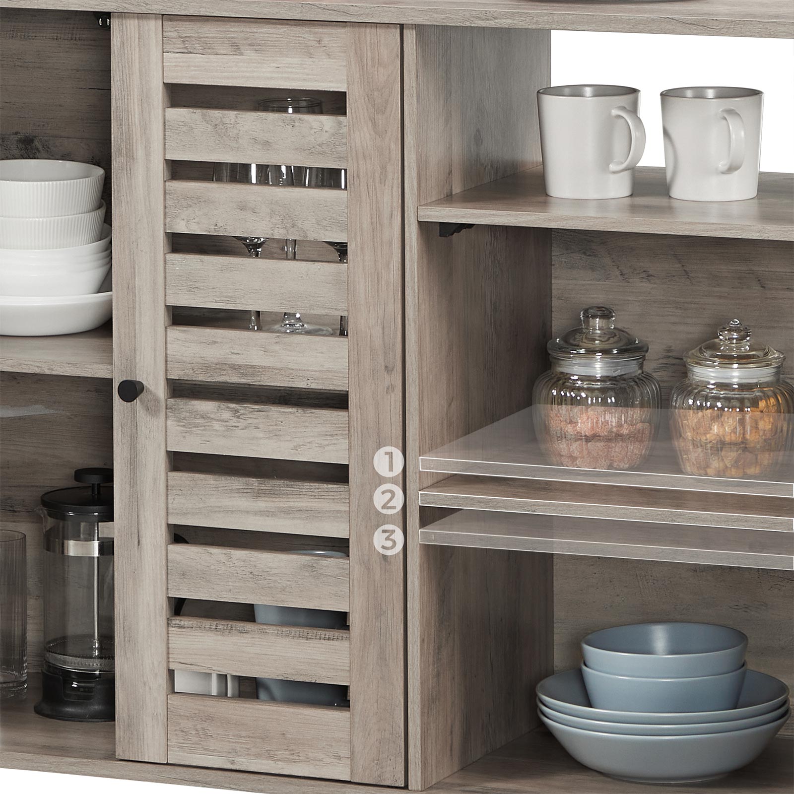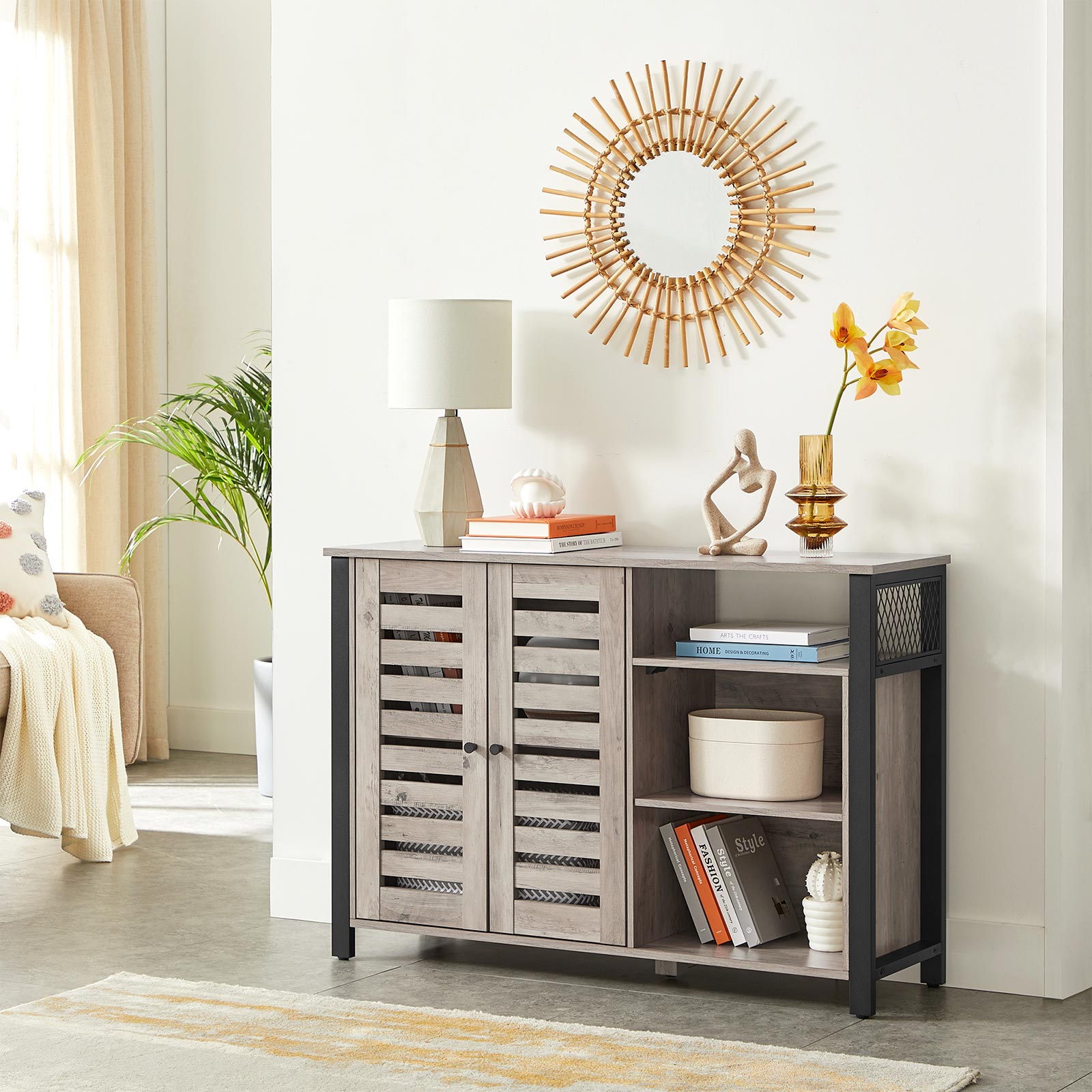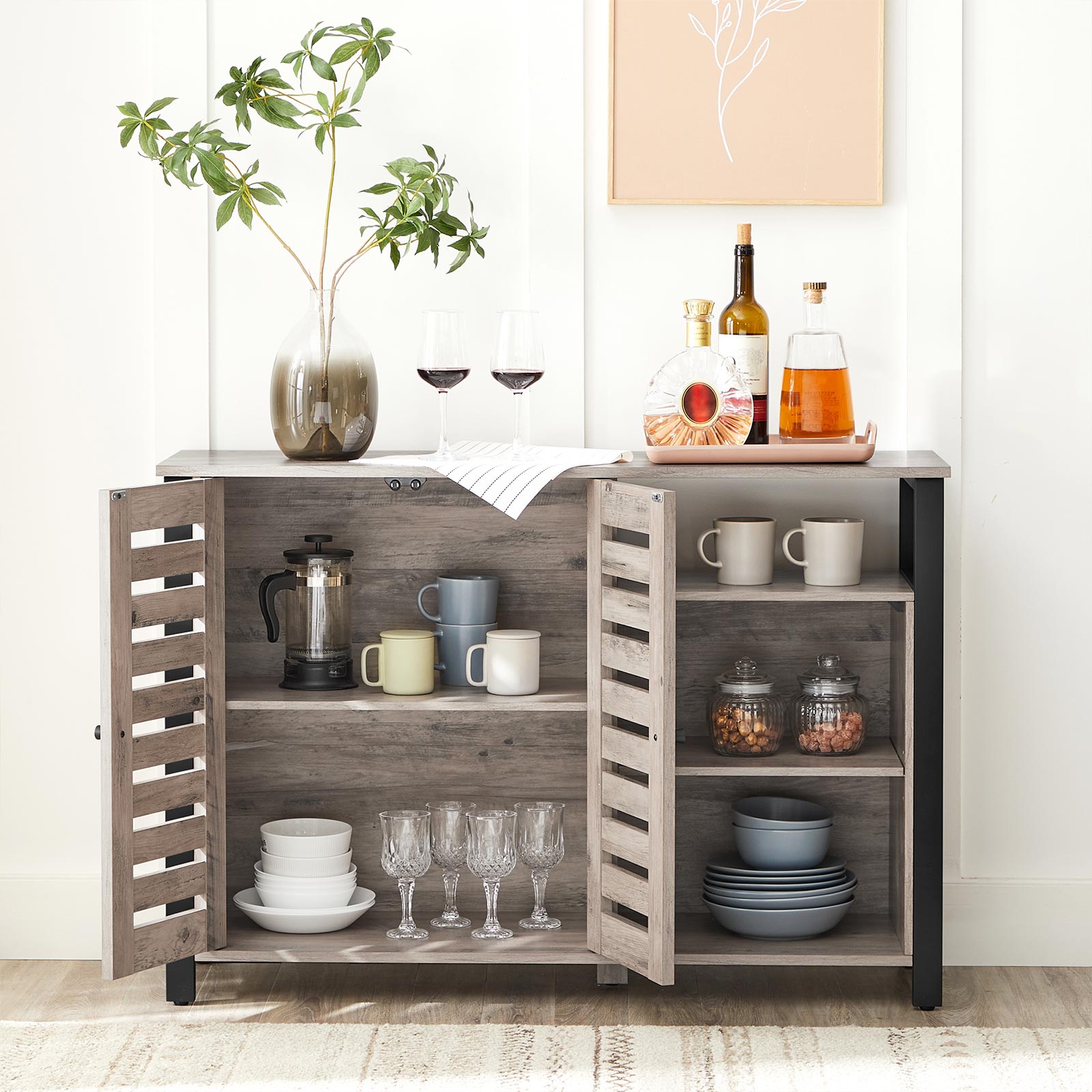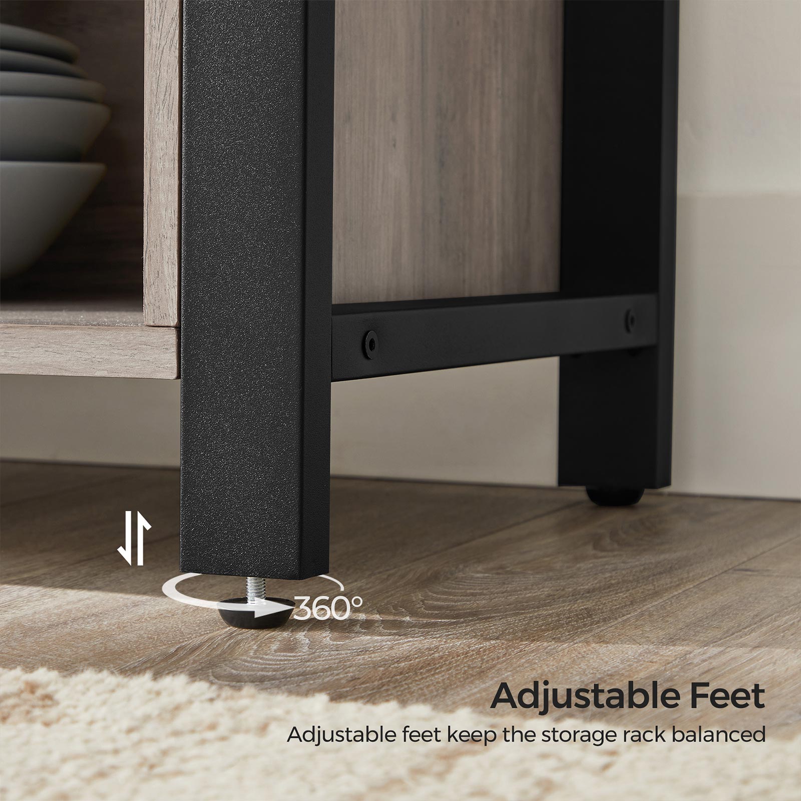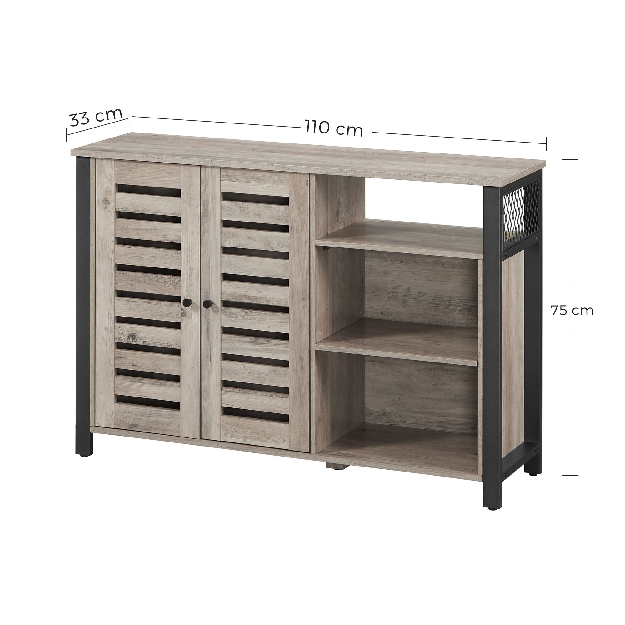 Product details: – Color: Greige-Black – Material: Chipboard, Steel – Size: 110 x 33 x 75 cm (L x W x H) – Weight: 25.8 kg – Max. static load capacity of the surface: 30 kg Scope of delivery: – 1 x sideboard – 1 x accessory package – 1 x anti-tip device – 1 x instructions (DE, EN, ES, FR, IT) VASAGLE Notes: – For safety reasons, children are not allowed to climb on or play with the product. – Please attach this product to the wall with the included anti-tip device to prevent it from tipping over.
