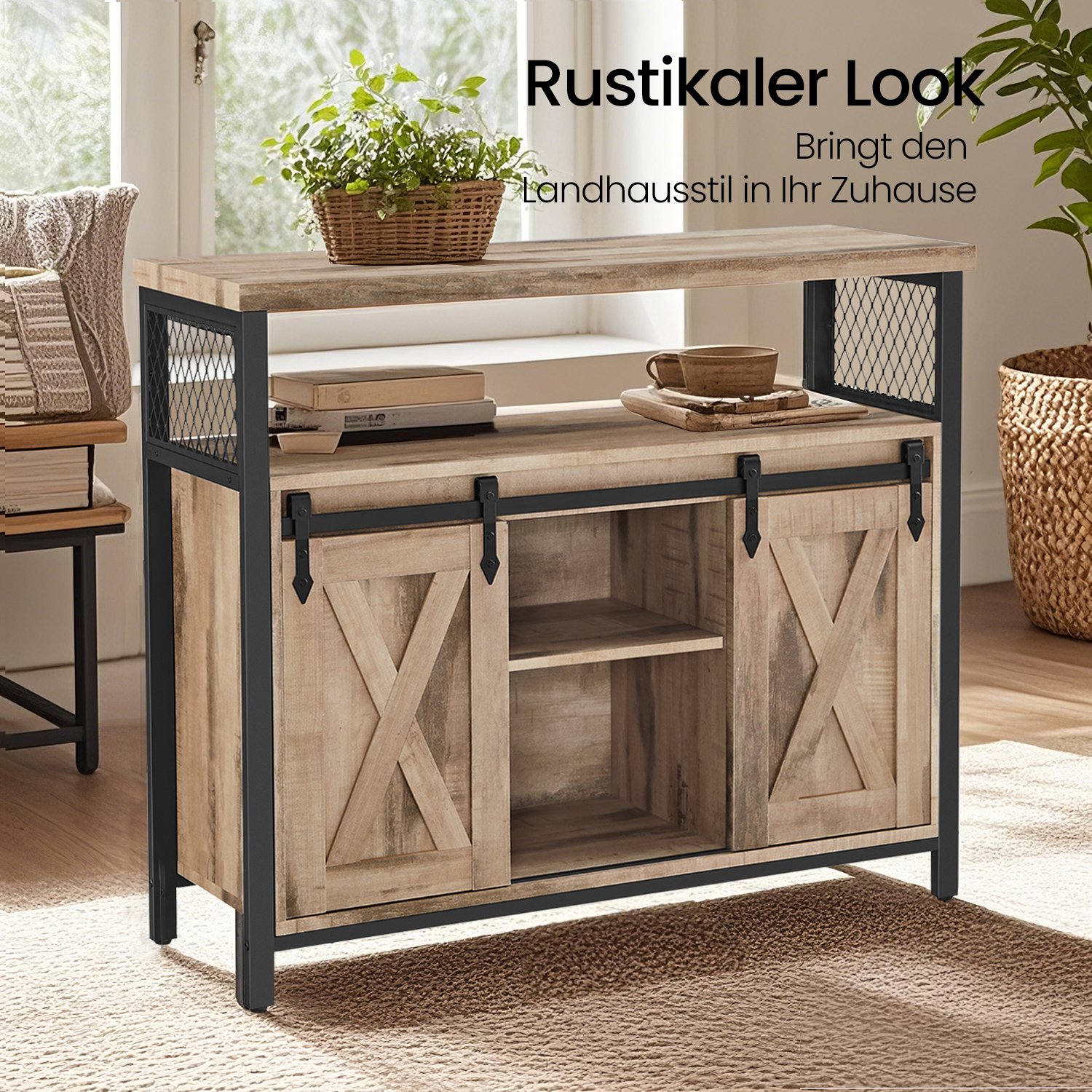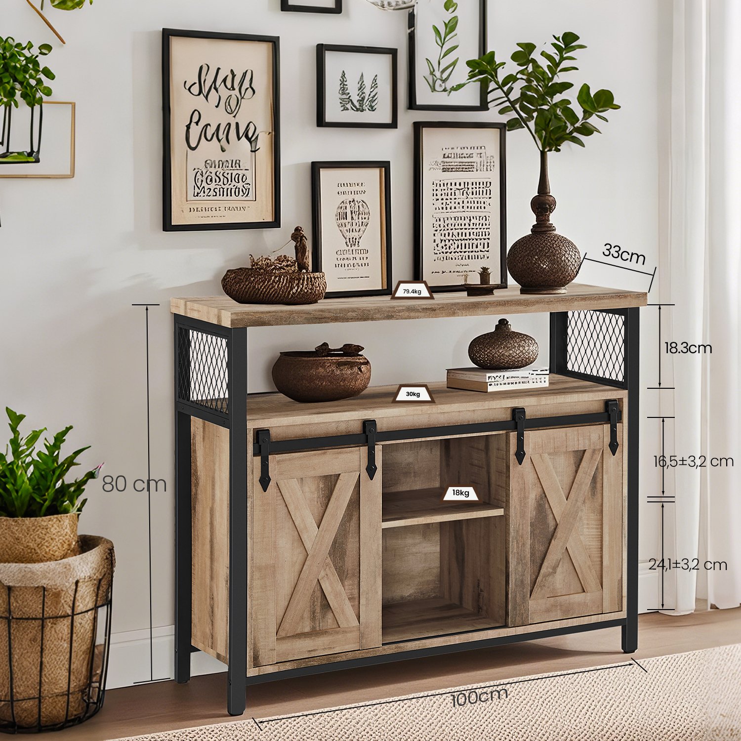 Product details: – Color: Natural colors-Black – Material: Chipboard, steel – Size: 33 x 100 x 80 cm (D x W x H) – Weight: 26.7 kg – Max. static load capacity of the surface: 90 kg – Max. static load capacity of the open intermediate shelf: 45 kg – Max. static load capacity per adjustable shelf: 18 kg Scope of delivery: – 1 x sideboard – 1 x accessory package – 1 x anti-tip device – 1 x instructions VASAGLE Notes: – For safety reasons, children are not allowed to climb on or play with the product. – Please attach this product to the wall with the included anti-tip device to prevent it from tipping over.