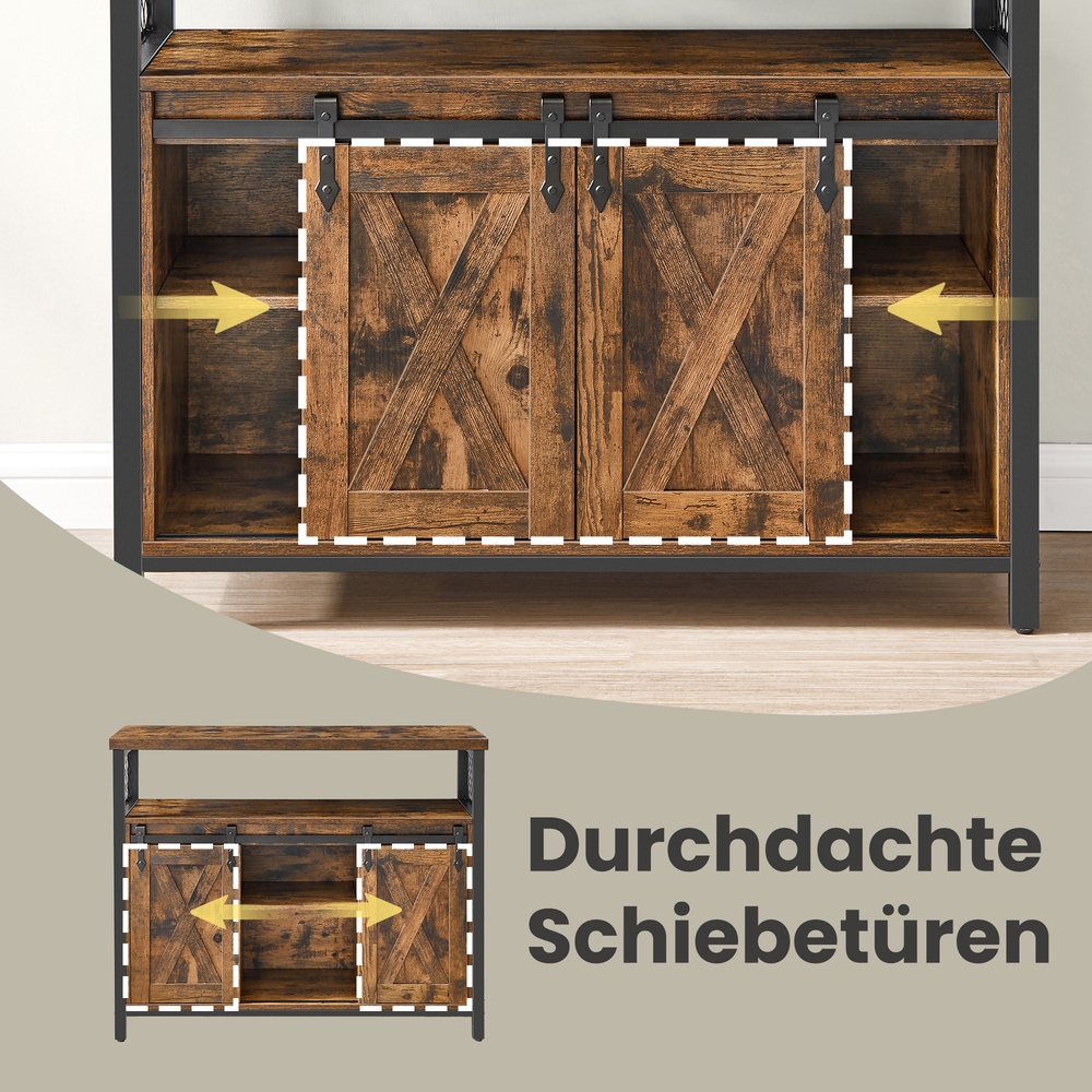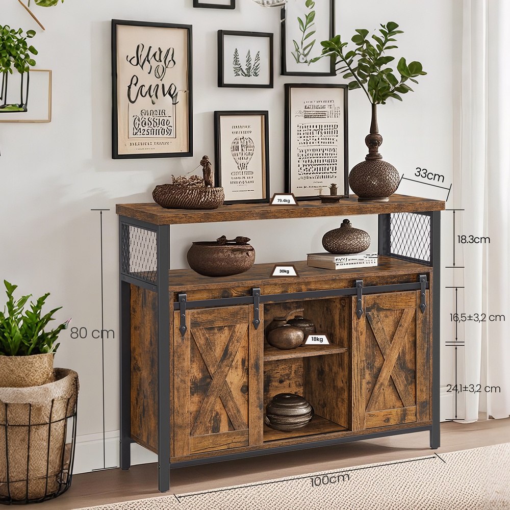 Product details: – Color: Vintage brown-black- Material: Chipboard, steel- Size: 100 x 33 x 80 cm (L x W x H)- Weight: 25.9 kg- Max. static load capacity of the surface: 30 kg- Max. static load capacity of the open intermediate shelf: 15 kg- Max. static load capacity of the inner shelf: 15 kgScope of delivery:- 1 x storage cabinet – 1 x accessory pack – 1 x anti-tip device – 1 x instructions (DE, EN, ES, FR, IT) VASAGLE notes: – For safety reasons, children are not allowed to climb on or play with the product. – Please attach this product to the wall using the anti-tip device provided to prevent it from tipping over.