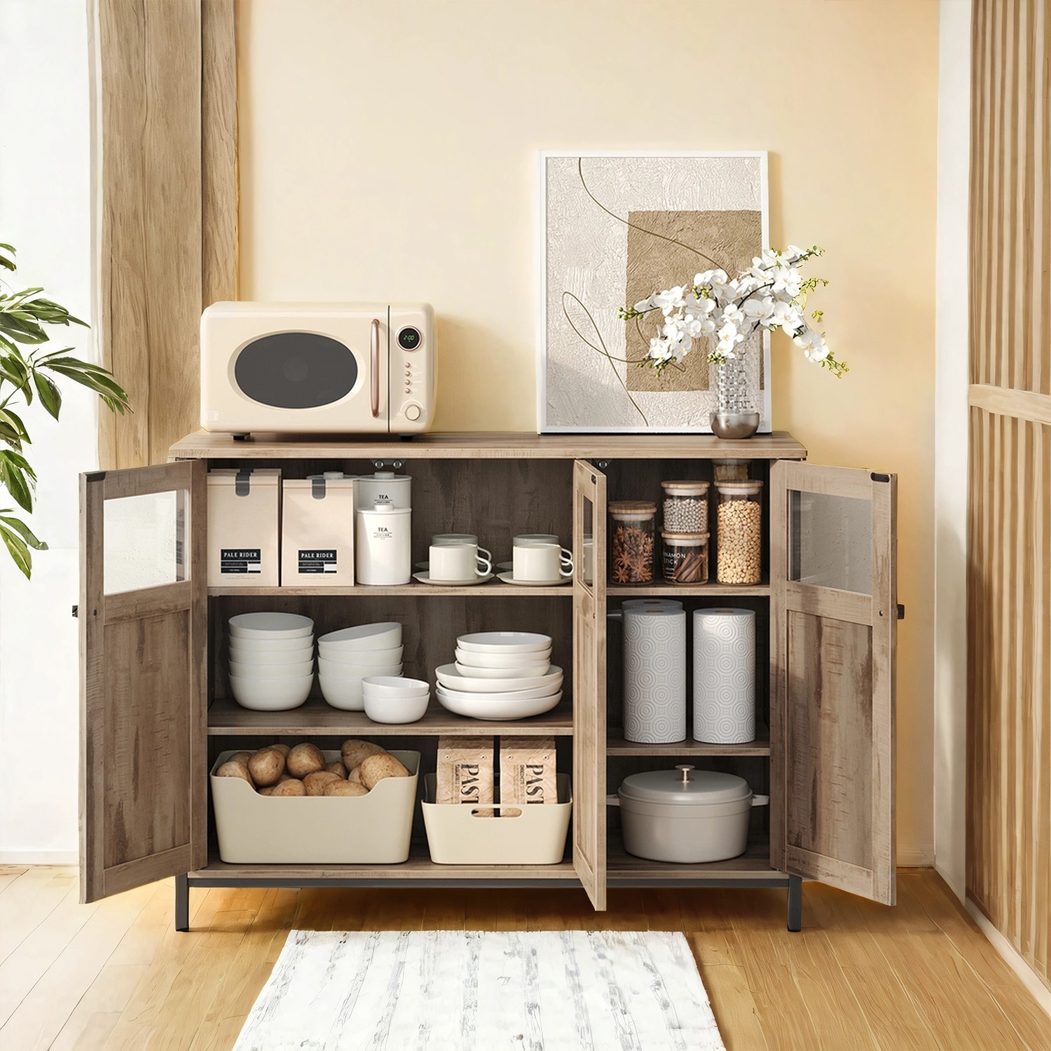 VASAGLE sideboard, kitchen cabinet, storage cabinet, with glass doors, for living room, kitchen, dining room, steel frame, industrial style, vintage brown-black LSC099B01