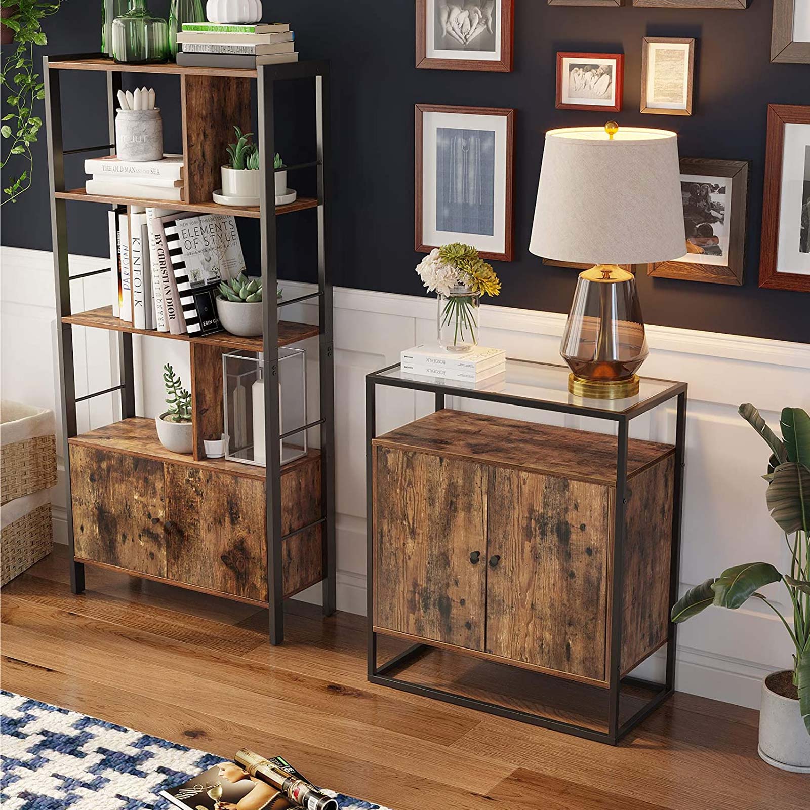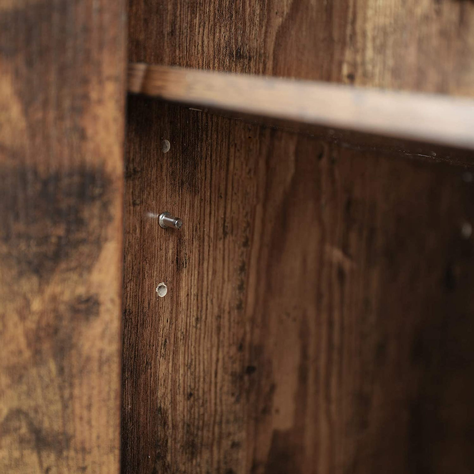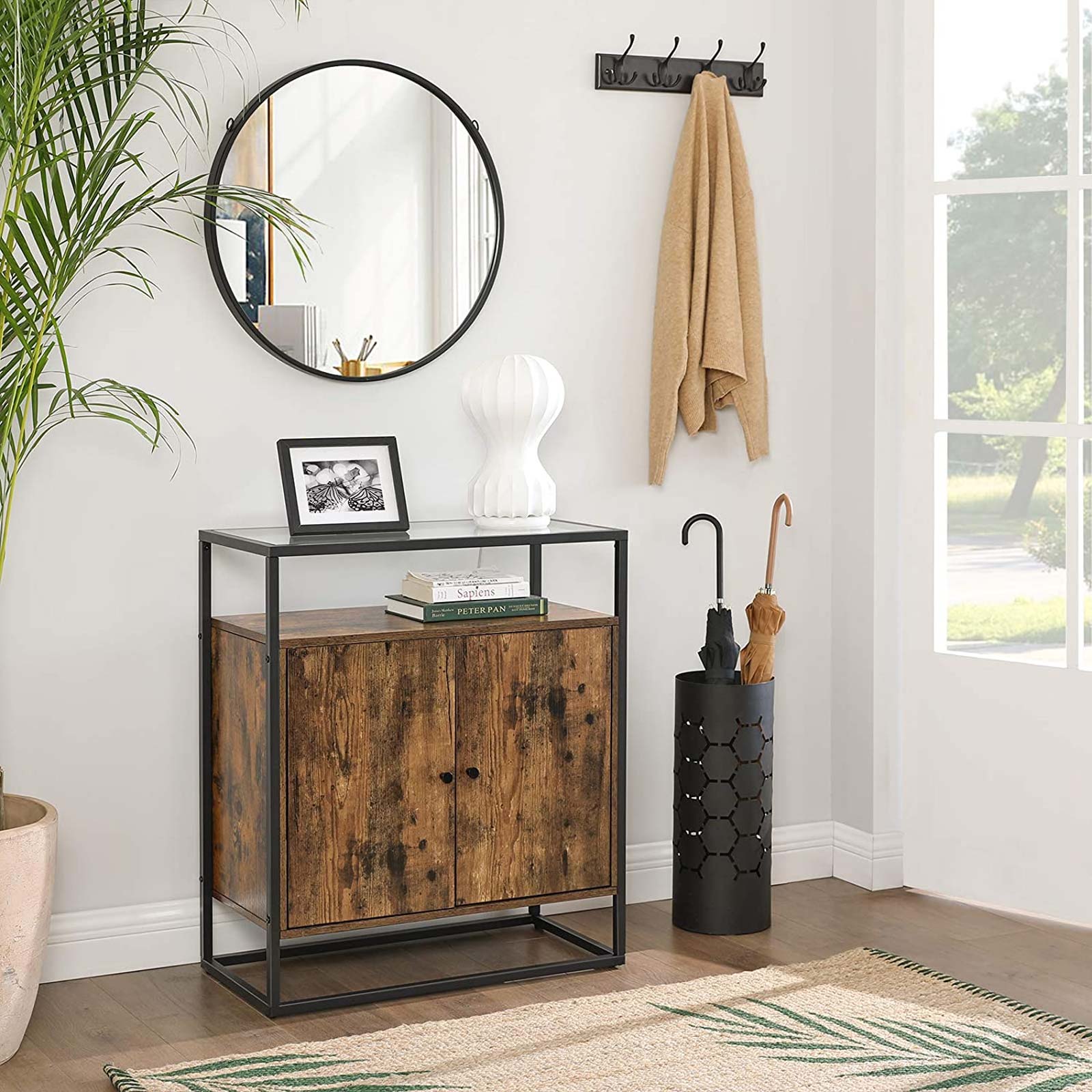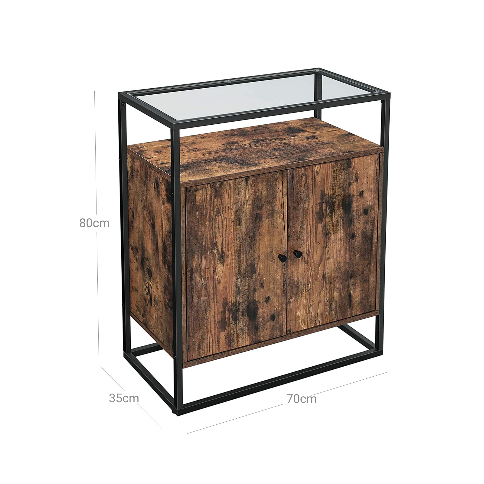 Product details: – Color: Vintage brown-black – Material: Chipboard, steel, tempered glass – Size: 70 x 35 x 80 cm (L x W x H) – Weight: 20 kg – Max. static load capacity of the glass surface: 30 kg – Max. static load capacity of the other shelves: 10 kg Scope of delivery:- 1 x sideboard with glass surface – 1 x accessory package – 1 x anti-tip device – 1 x instructions (DE, EN, ES, FR, IT) VASAGLE notes: – For safety reasons, children are not allowed to climb on or play with the product. – The surface of this product is made of glass. Please handle with care to avoid cracks. – Please secure this product to the wall using the included anti-tip device.