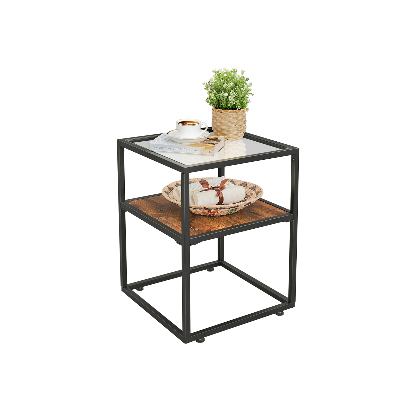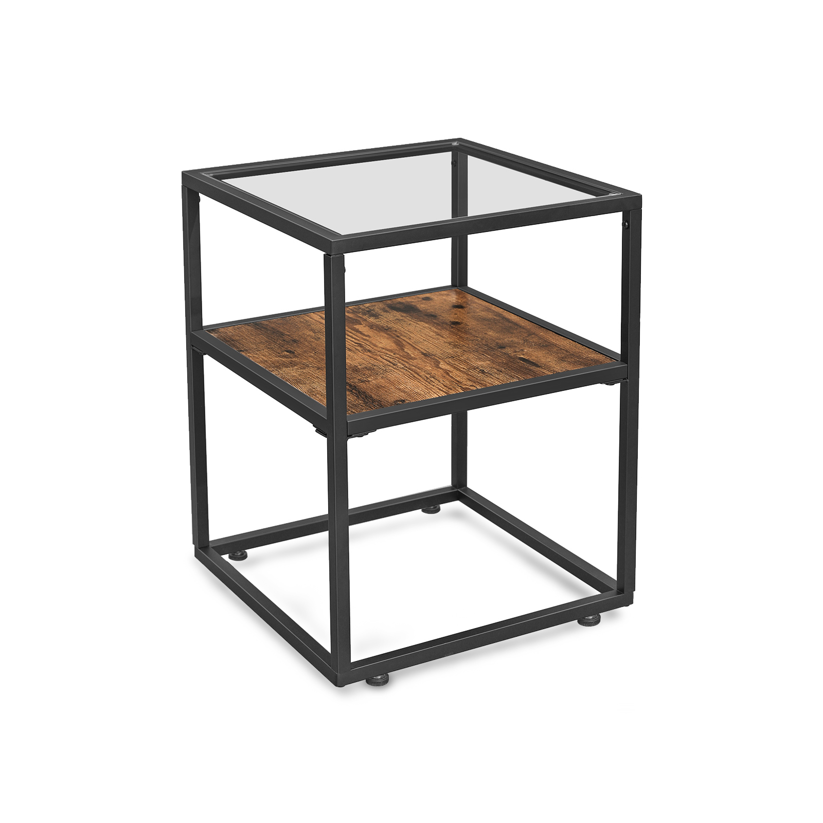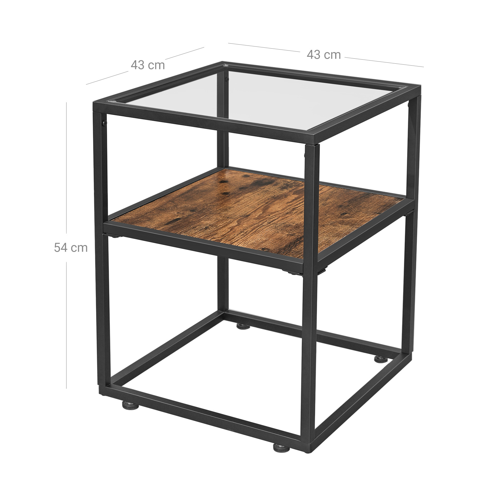 Product details: – Color: Vintage brown-black – Material: Chipboard, steel, tempered glass – Size: 43 x 43 x 54 cm (L x W x H) – Weight: 7.2 kg – Max. total static load capacity: 30 kg Scope of delivery:- 1 x side table with glass top – 1 x accessory pack – 1 x instructions (DE, EN, ES, FR, IT) VASAGLE notes: – For safety reasons, children are not allowed to climb on or play with the product. – Please handle the glass surface with care to avoid scratches or cracks.