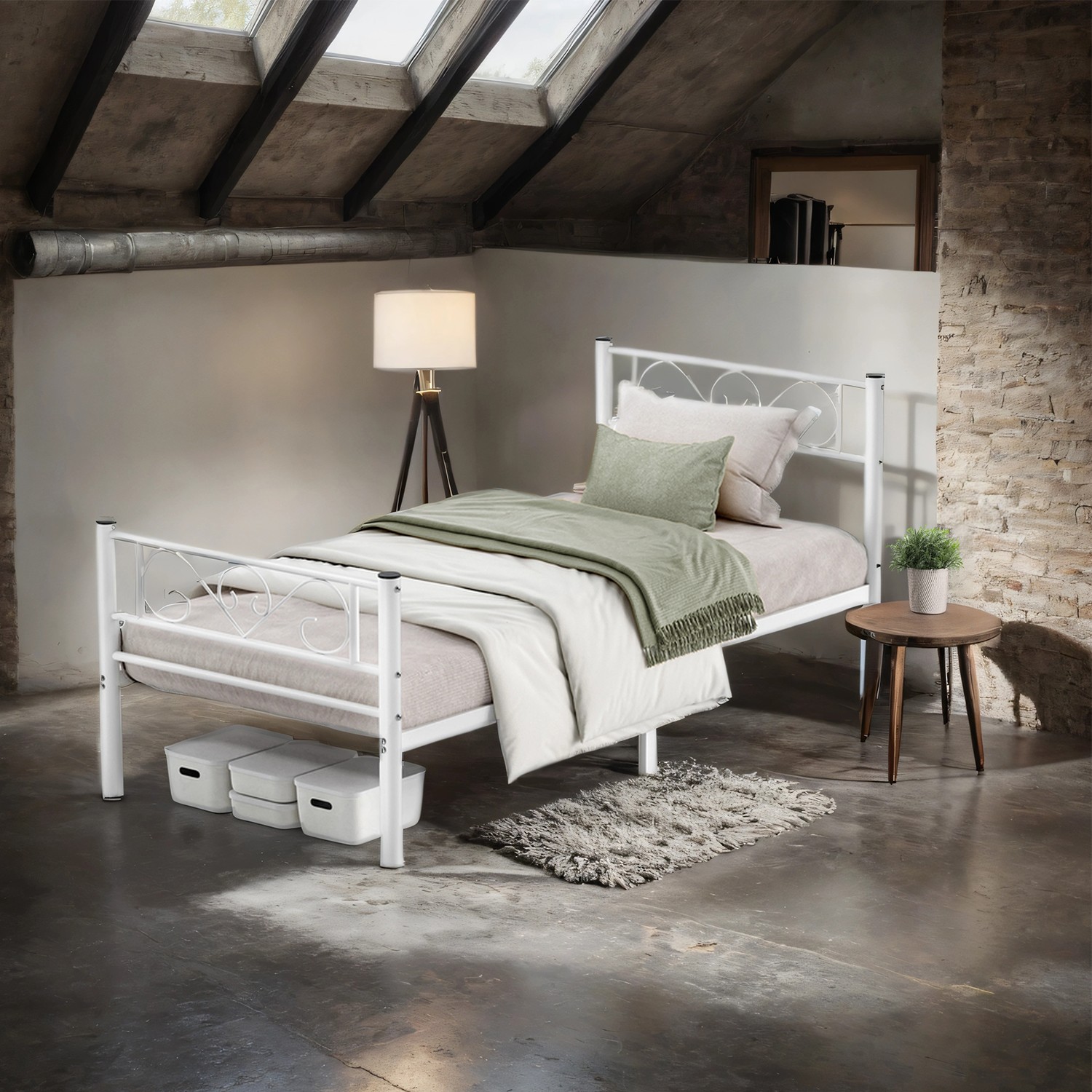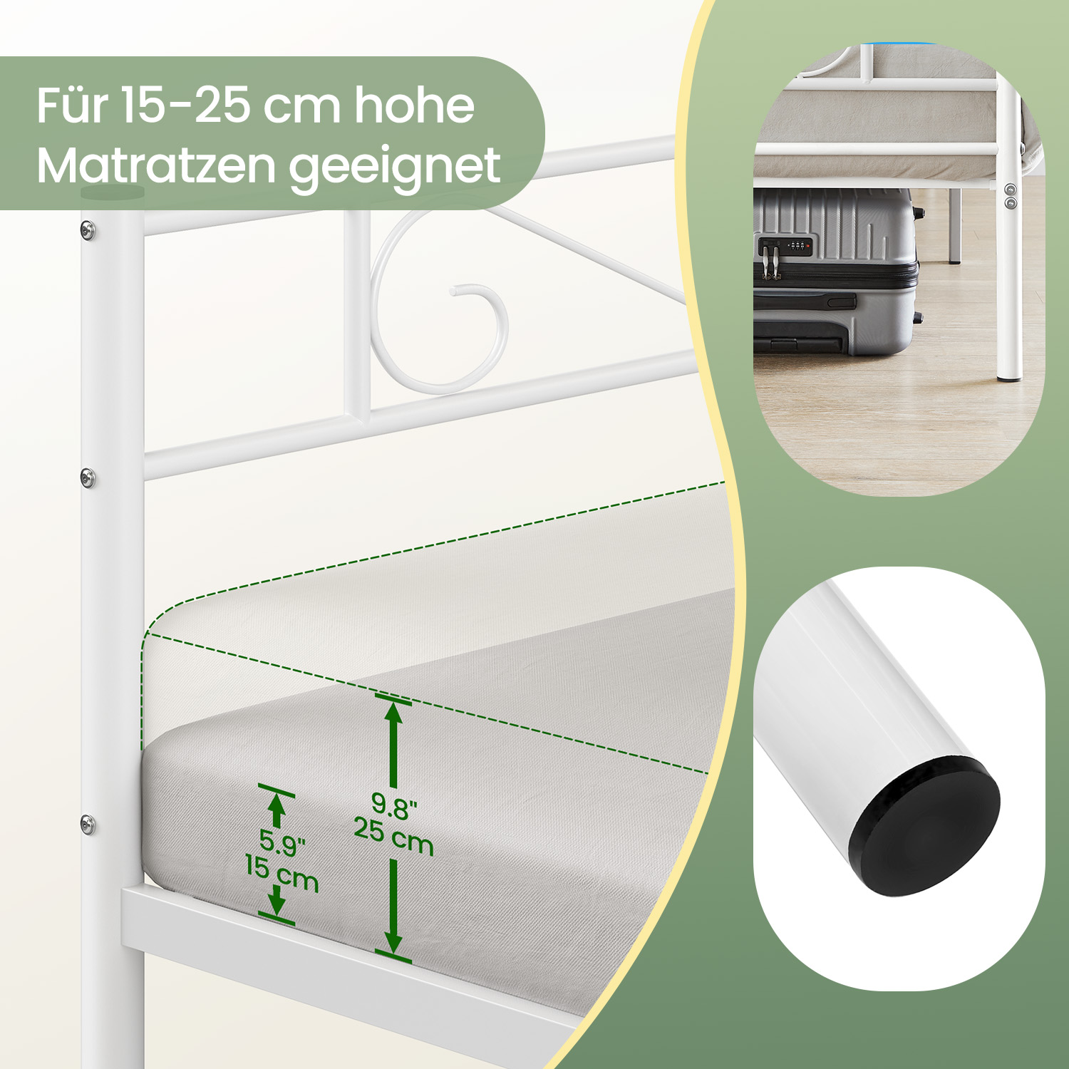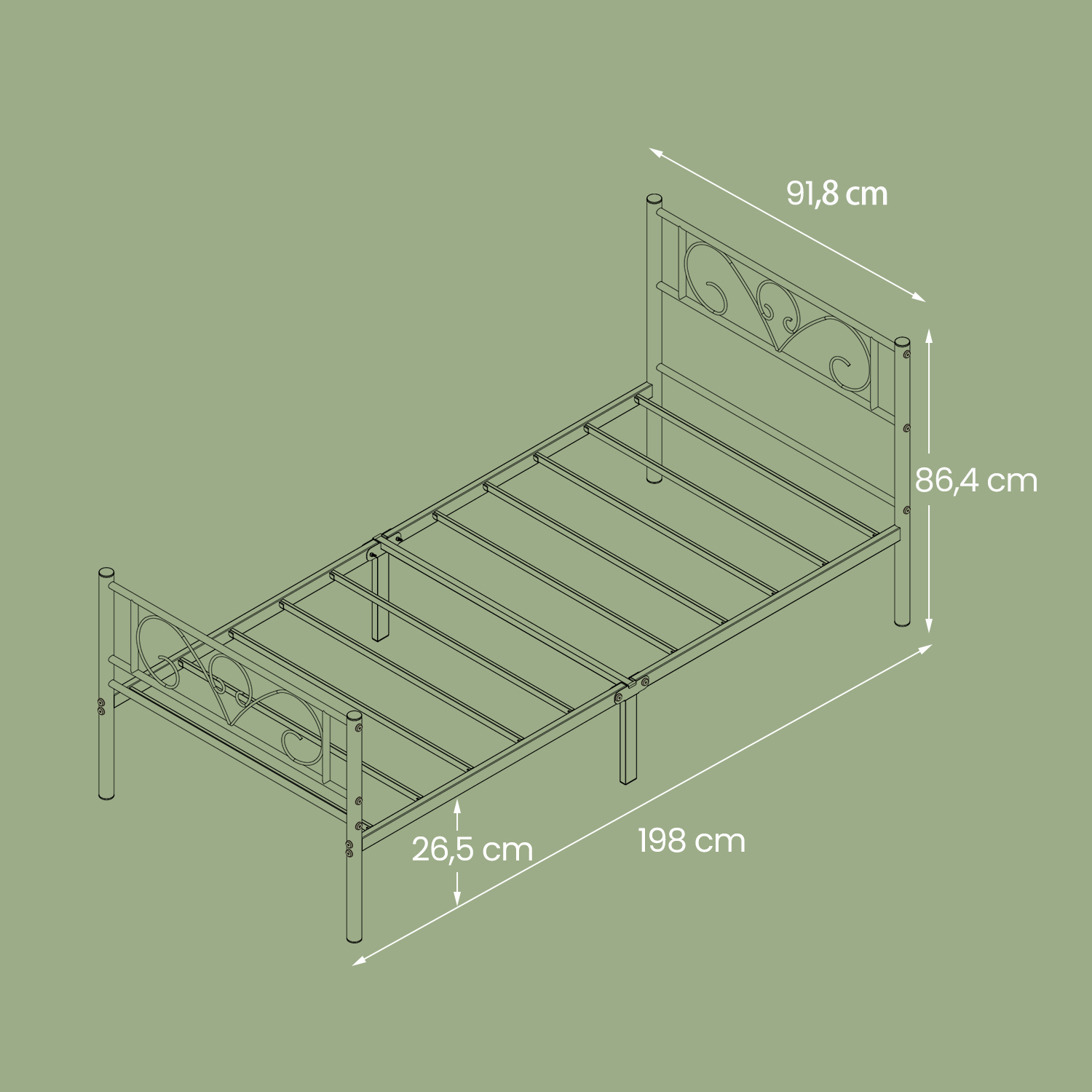 No more insomnia – sweet dreams await: The difference between a sleepless night and a night full of sweet dreams often comes down to the bed frame and mattress that support you throughout the night. As you make your bed, so you must lie in it! Highlights of this VASAGLE metal bed frame: – No box spring required; this bed frame supports your mattress directly. – No tools are required for assembly, everything is included in the package! – A durable metal frame, 11 metal crossbars, and 6 metal legs ensure that you lie securely throughout the night. – The attractive white finish and simple design add a modern charm to your room. Product details: – Color: White – Material: Powder-coated metal – Size: 198 x 91.8 x 86.4 cm (L x W x H) – Weight: 14.2 kg – Max. static load capacity: 150 kg Scope of delivery:- 1 x bed frame – 1 x accessory pack – 1 x instruction manual (DE, EN, ES, FR, IT) VASAGLE Notes: – Children must not stick their heads into the gaps between the metal tubes. – Ensure that all parts and screws are securely fastened before use. – A mattress is not included in the delivery.